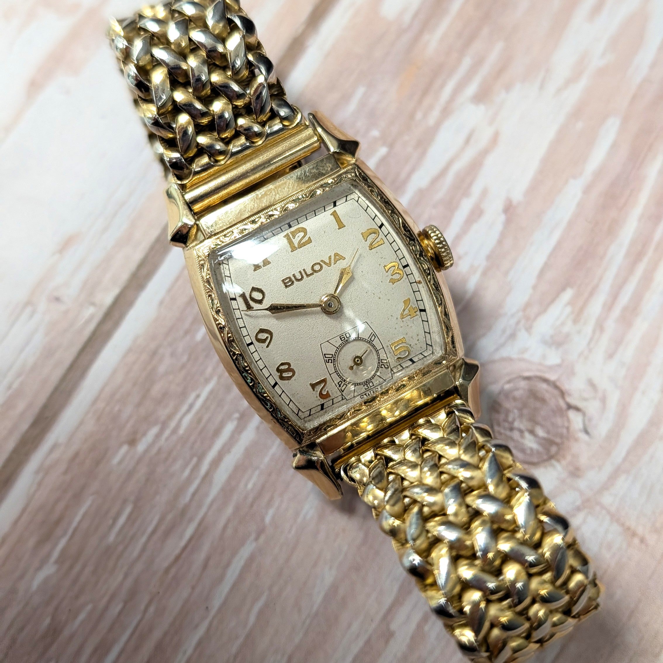 This is a vintage Bulova Cadet "D" dress mechanical wristwatch from the 1940s. It is powered by the original Bulova caliber 10BC mechanical movement with 15 jewels and small-seconds. The movement delivers a 45-hour power reserve and operates at 18,000 vibrations per hour. Swiss made.