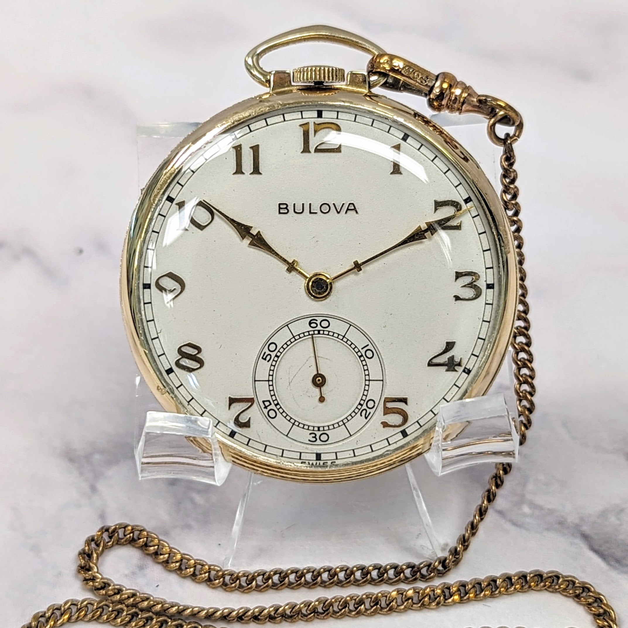This Bulova Chesterfield dress pocket watch from the 1940s features a round 10K yellow rolled gold-plated case with a smooth bezel and engraved details. The beautiful white dial displays gold-tone Arabic numerals, a black “railroad” minute track, and a small seconds sub-dial at 6 o’clock, combining elegance with vintage charm.