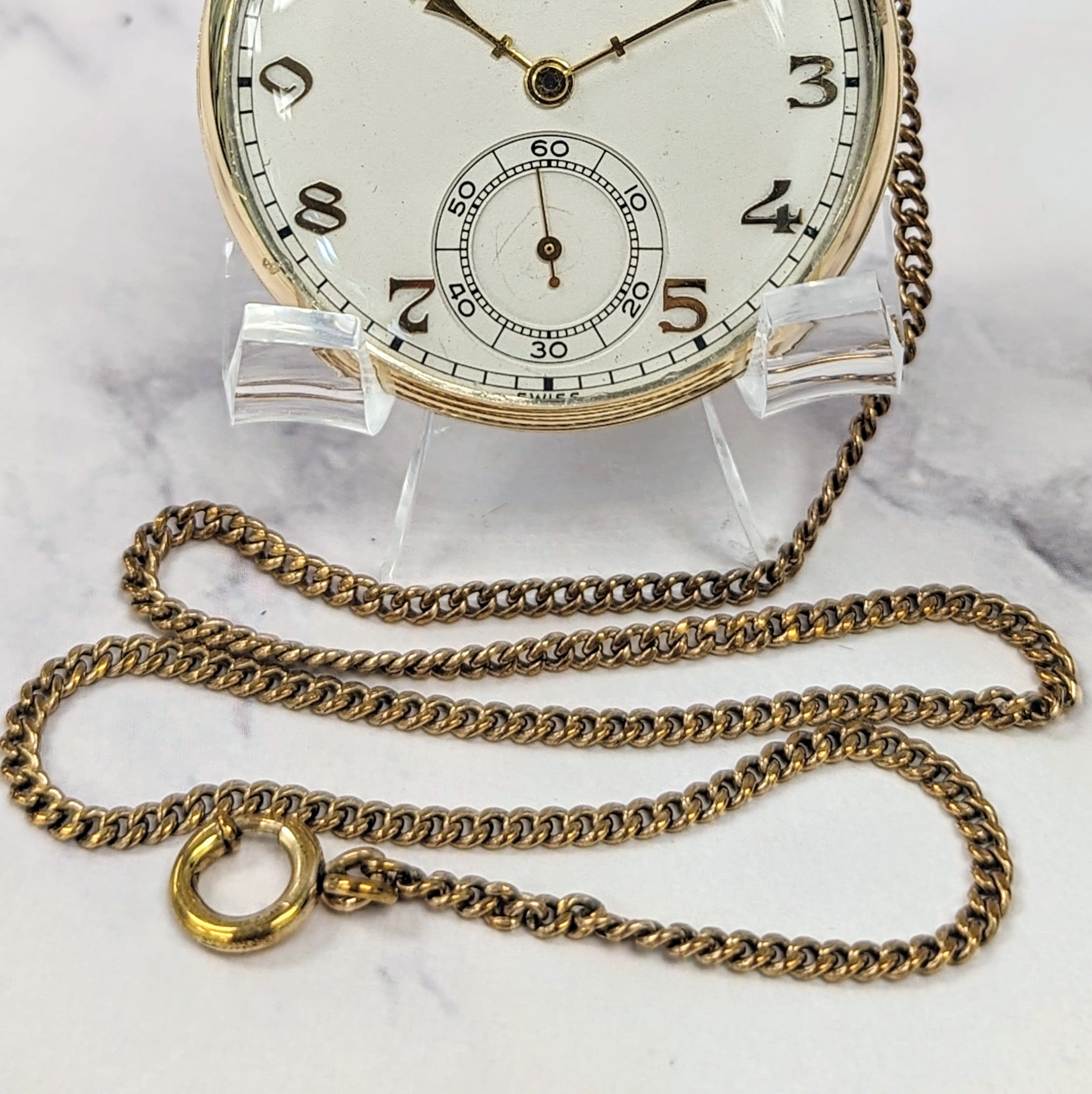 Measuring 42.5mm round-case shape with a thickness of 9.6mm, this pocket watch comes with a chain and is still in very good vintage condition. Gentle signs of wear add character, making it a fully functional, elegant, and collectible timepiece.