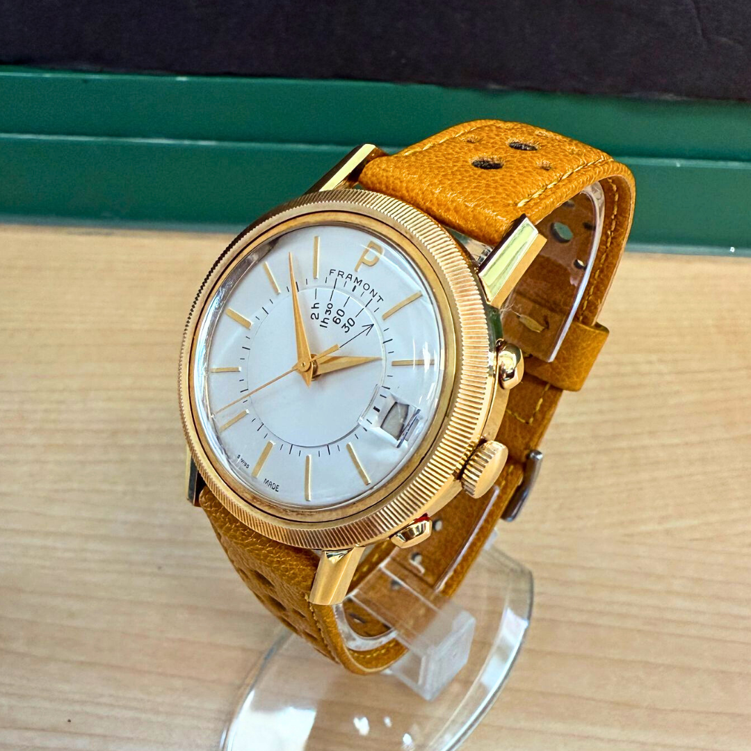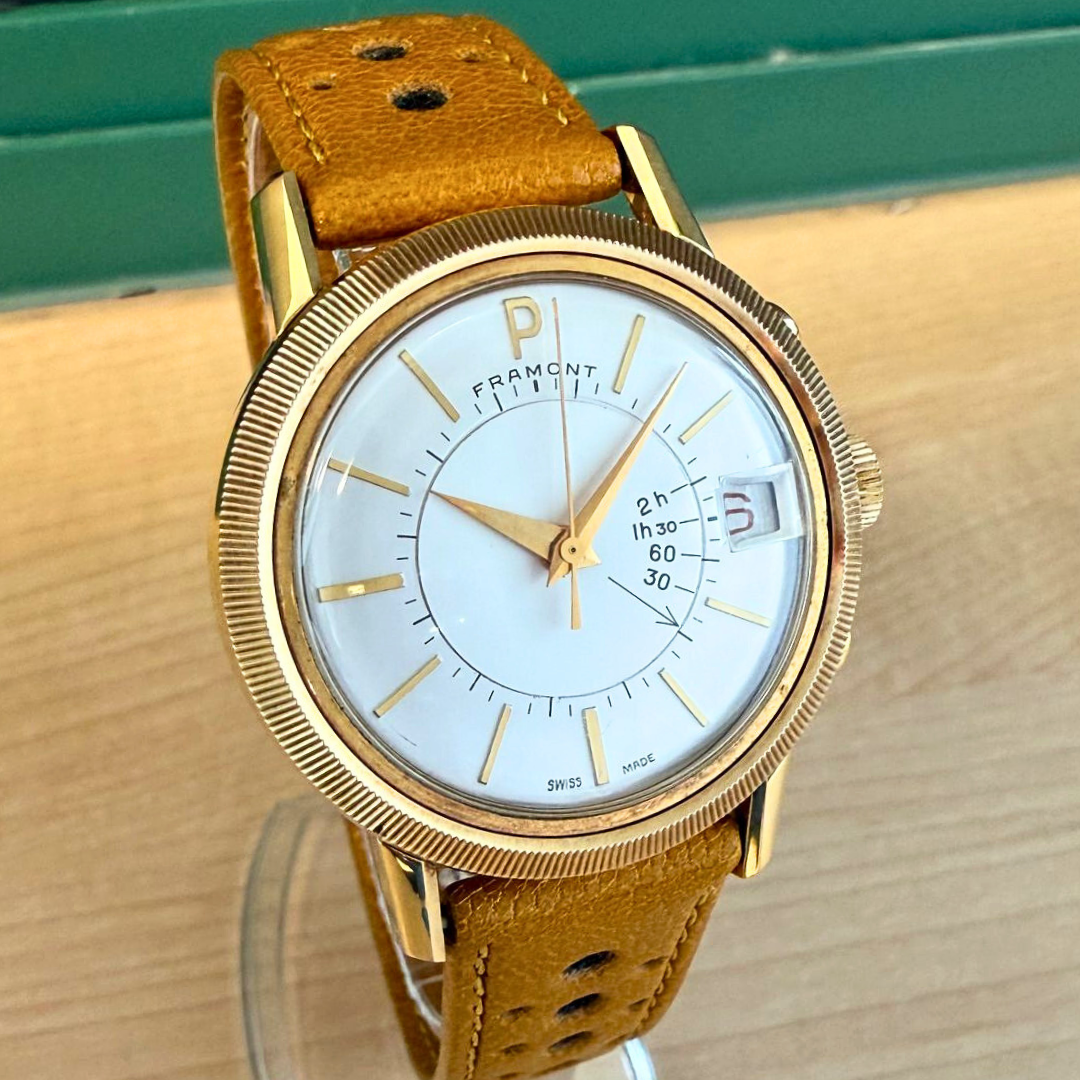 Framont was a Swiss watch brand officially registered on February 2, 1944, by J. Crevoiserat & Cie., under the company Framont Sarl, based in Saignelégier and later in Renan, Switzerland. In 1967, the company opened a new factory in Renan and became part of a merger that formed Micro-Time SA, alongside other Swiss watchmakers such as Charles Gigandet SA and Landeron. Framont operated primarily during the mid-20th century and produced mechanical wristwatches, some of which featured complications like parking alarms. The brand was dissolved in 1988. Today, Framont timepieces—particularly rare models like the parking alarm watch—stand as a testament to Swiss ingenuity and mid-century horological design.