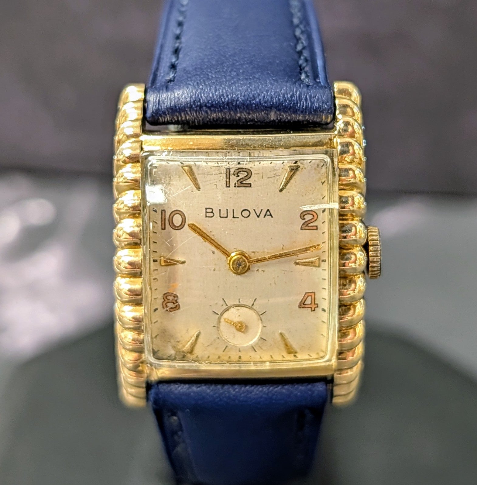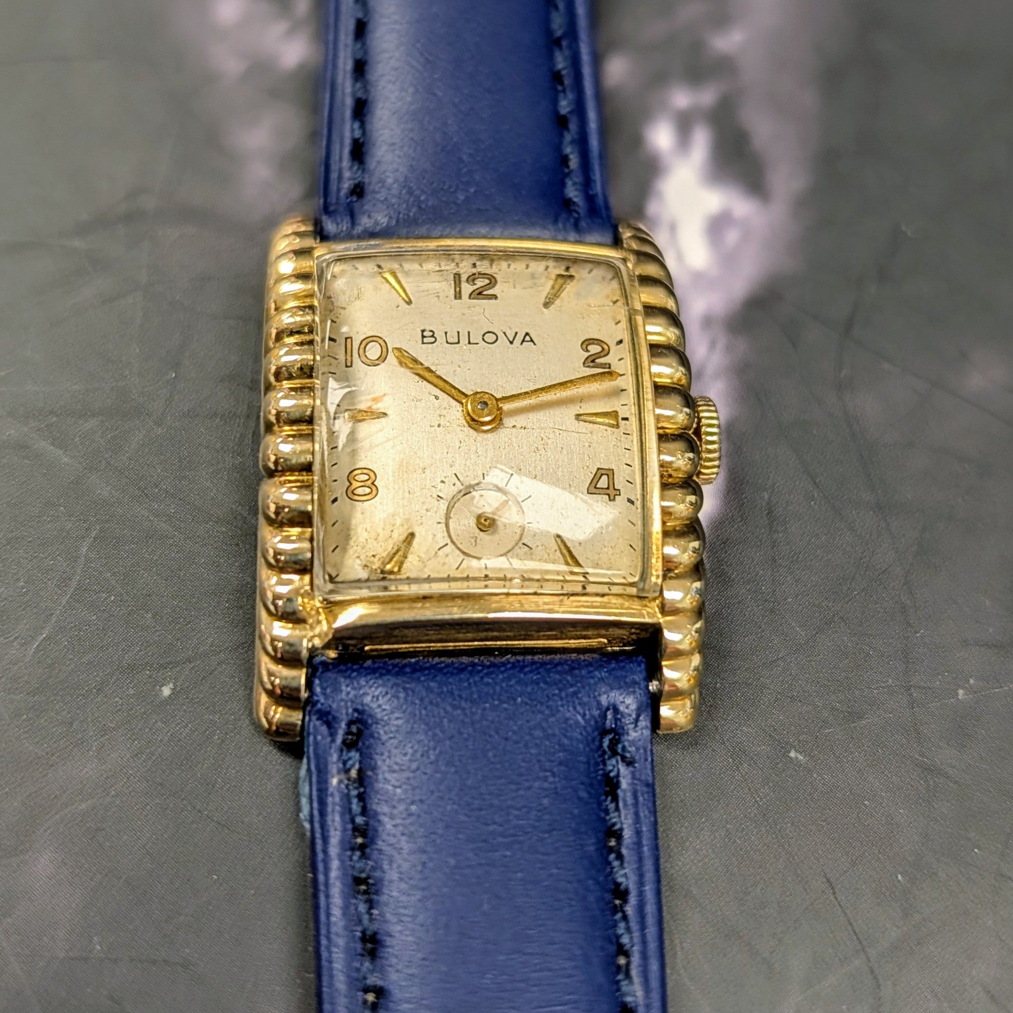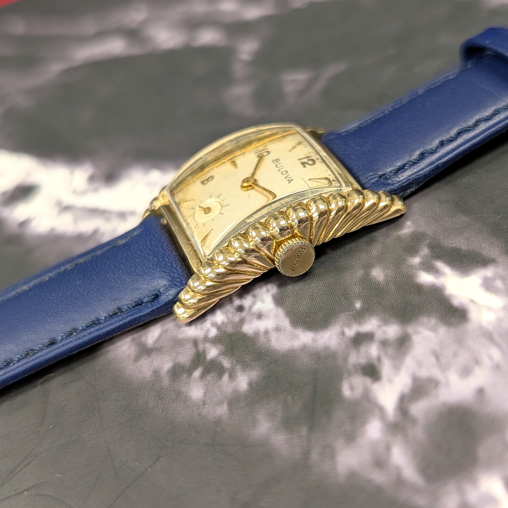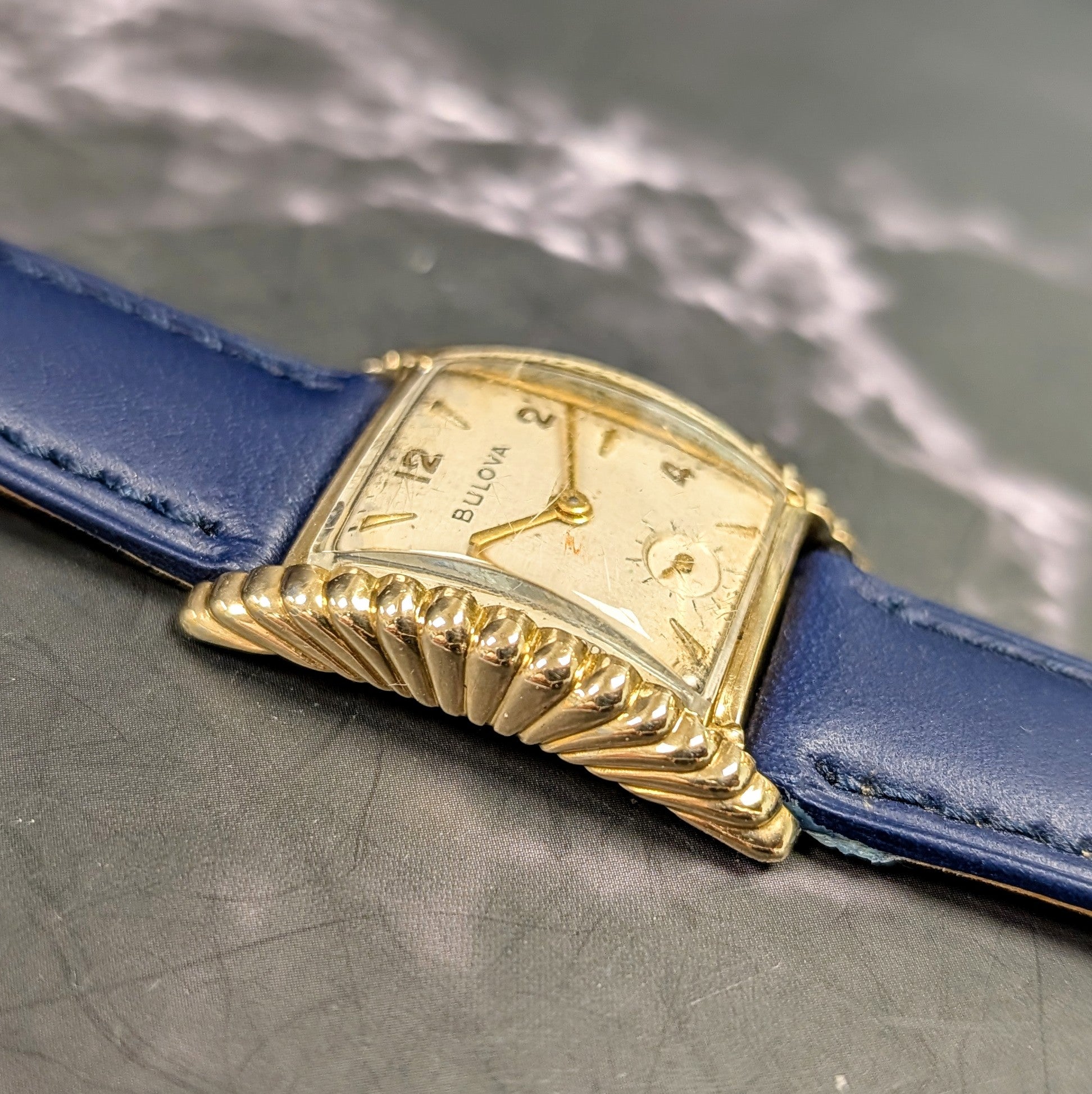 Cased in a 24.5mm curved tank case with fluted scallop sides, made in 10K yellow rolled gold plated bezel, this timepiece features a polished finish. Paired with a blue leather two-piece strap, this Bulova wristwatch presents well the elegant design for the era with signs of honest aging. Fully inspected and authenticated. Running and wearable.