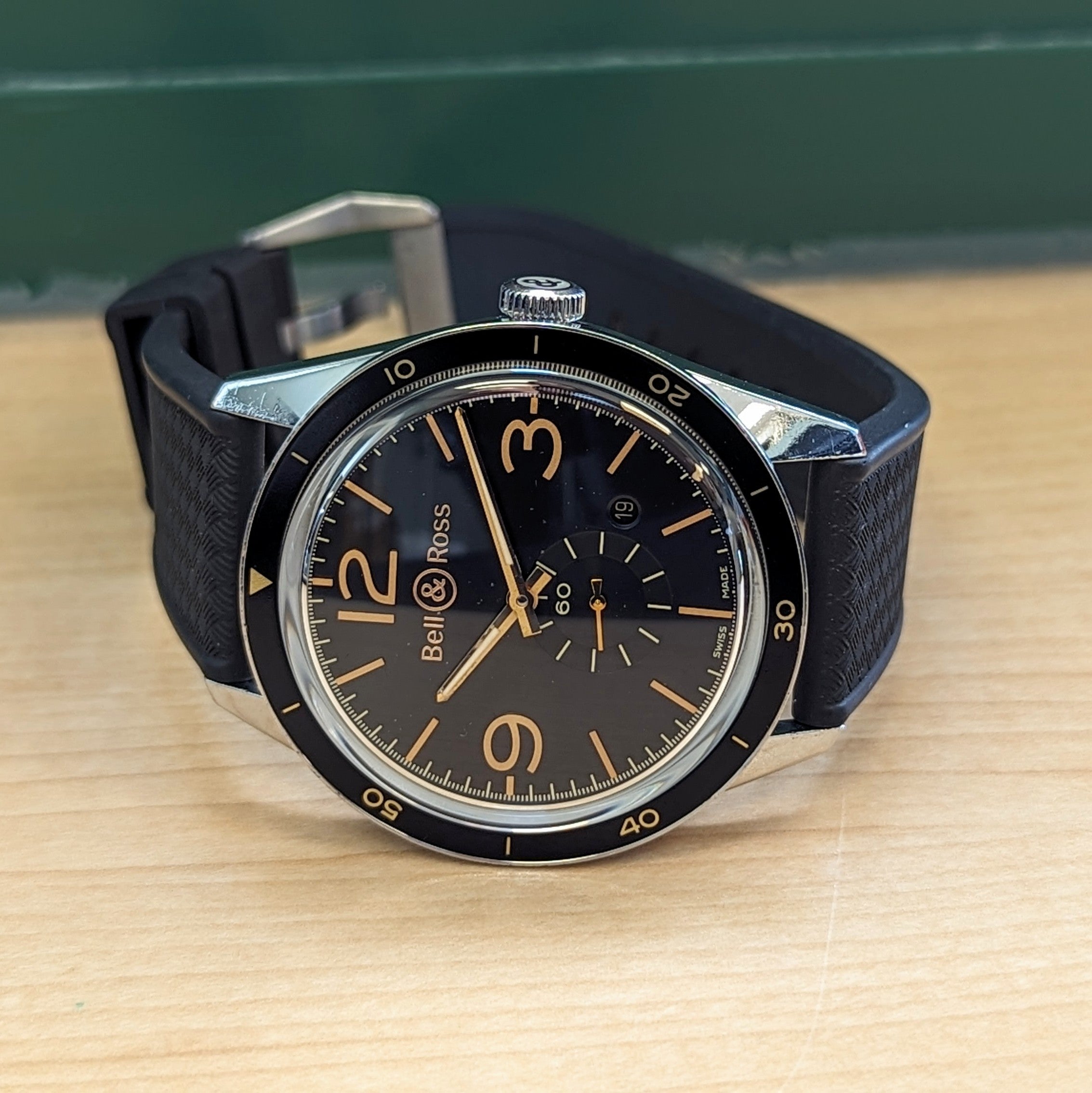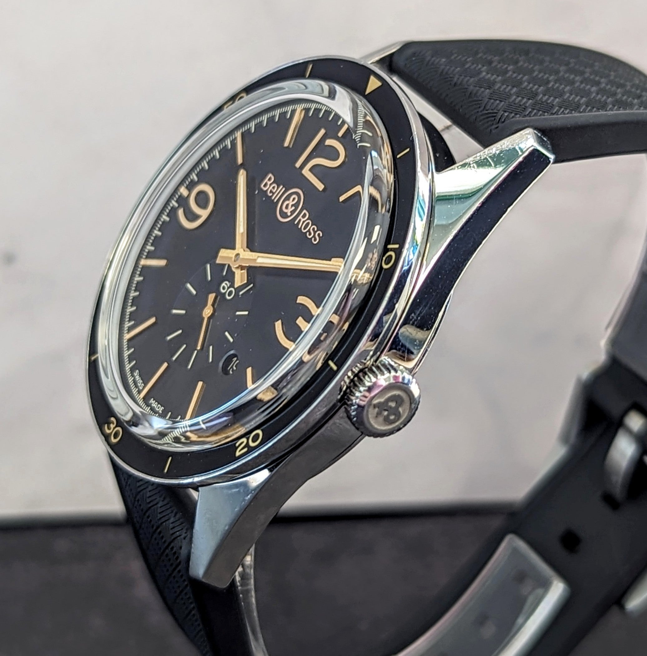 This is the Bell & Ross Golden Heritage BR 123-95-SP, a solid entry in the brand’s vintage-inspired lineup. Powered by the automatic ETA 2895-2 movement with 27 jewels, it features a clean black dial with Arabic numerals at 12, 3, and 9, baton hour markers, luminous dauphine hands, and a small seconds sub-dial at 6 o’clock. A subtle date window is tucked between 4 and 5. The 43mm polished stainless steel case is fitted with a fixed bezel with black insert, sapphire crystal front and back, and a signed push-pull crown. Water-resistant to 100 meters, it comes on the original black rubber strap, giving it a sharp, modern edge.