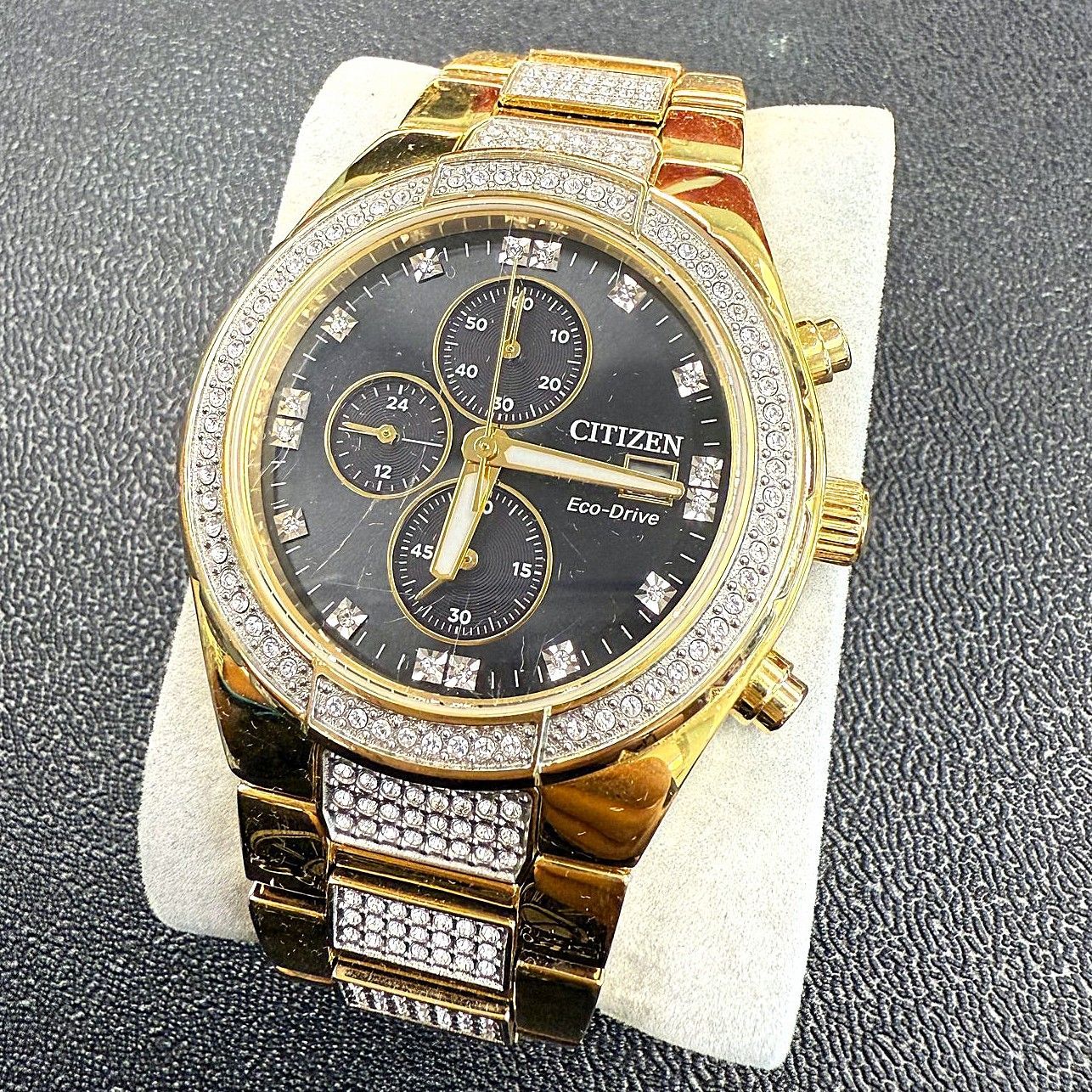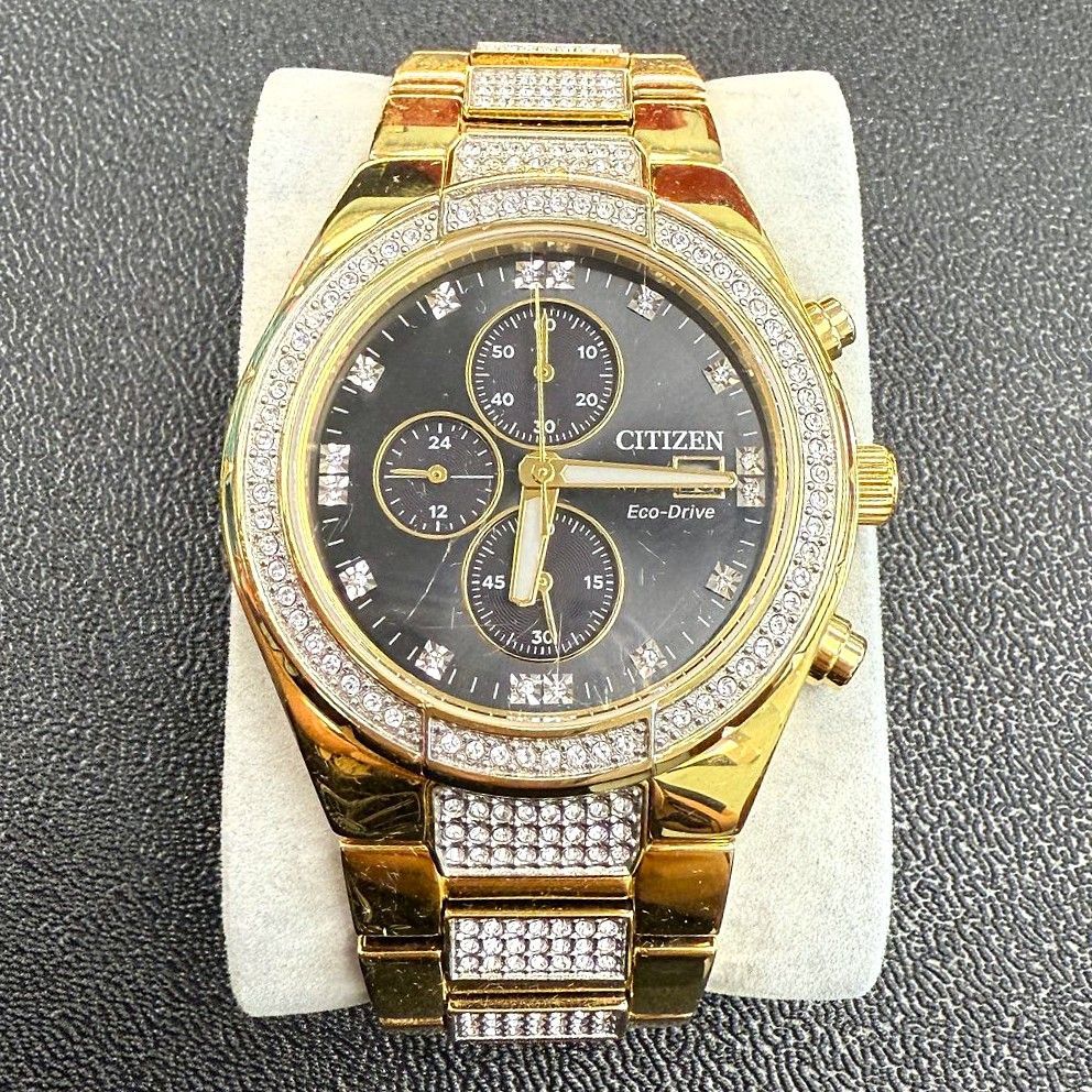 From Citizen’s Crystal Collection, this all-gold Eco-Drive chronograph blends modern functionality with striking elegance. Featuring a black dial with gold accents, original crystal-set bezel, and solar-powered movement, it's a refined statement piece built for everyday style.