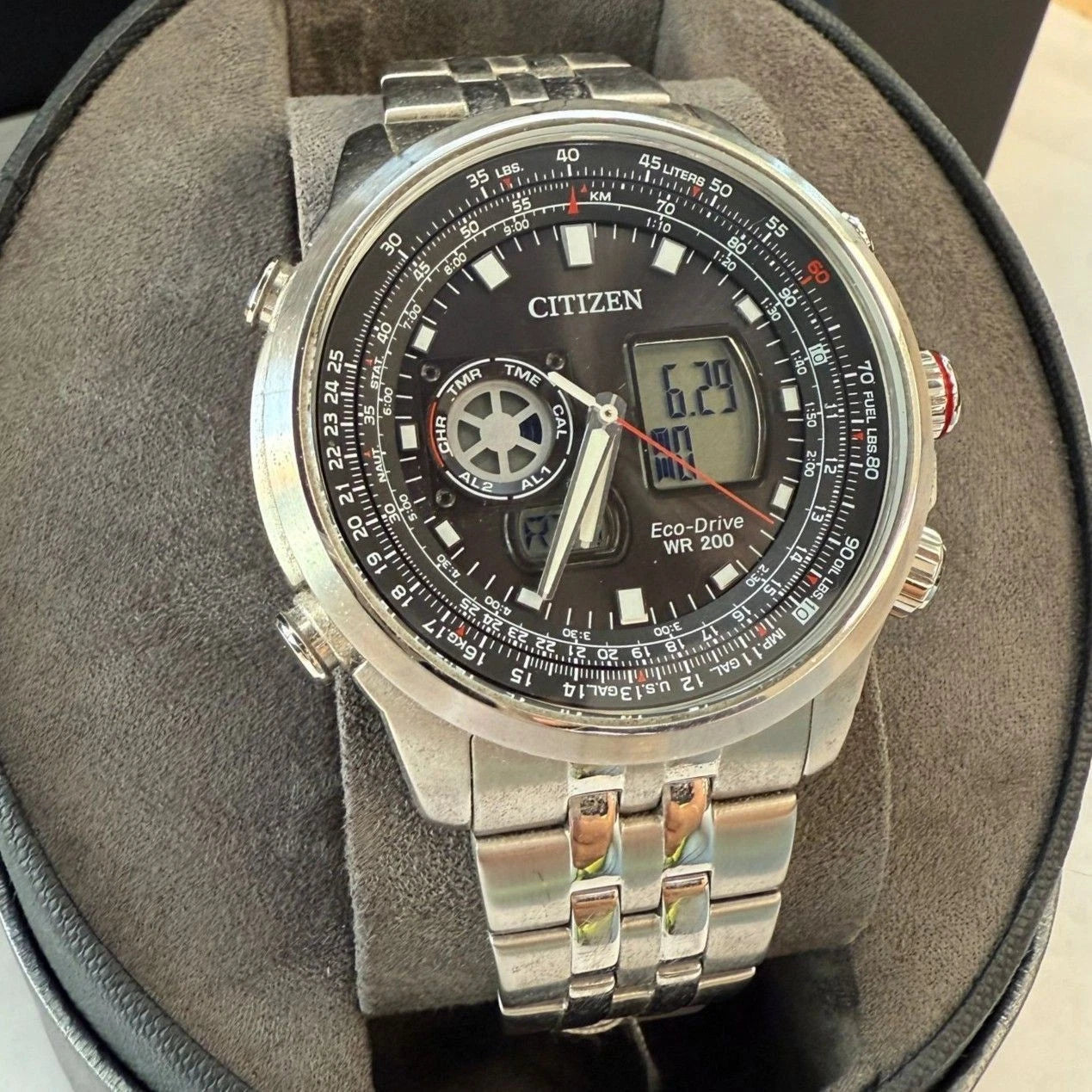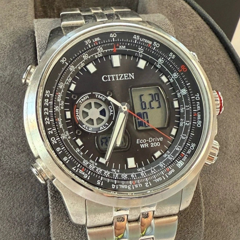 Collector-grade Eco-Drive chronograph with analog-digital display, all stainless steel construction, and original packaging. Built for pilots, adventurers, and Citizen enthusiasts alike.