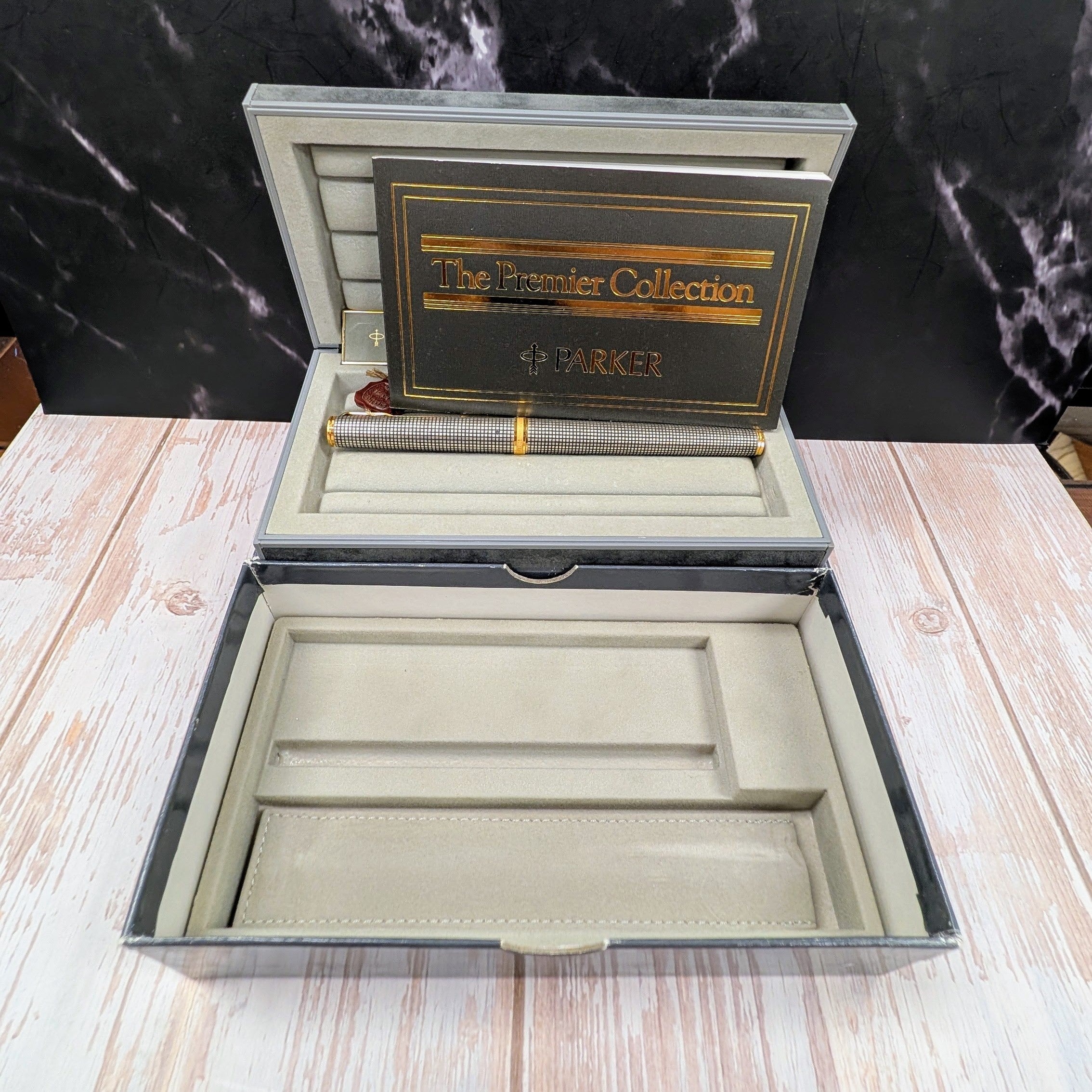 It includes the complete factory set: the original Parker presentation case, Premier Collection booklet, soft travel pouch, the wax seal hang tag marked "Argent Massif," and outer box.