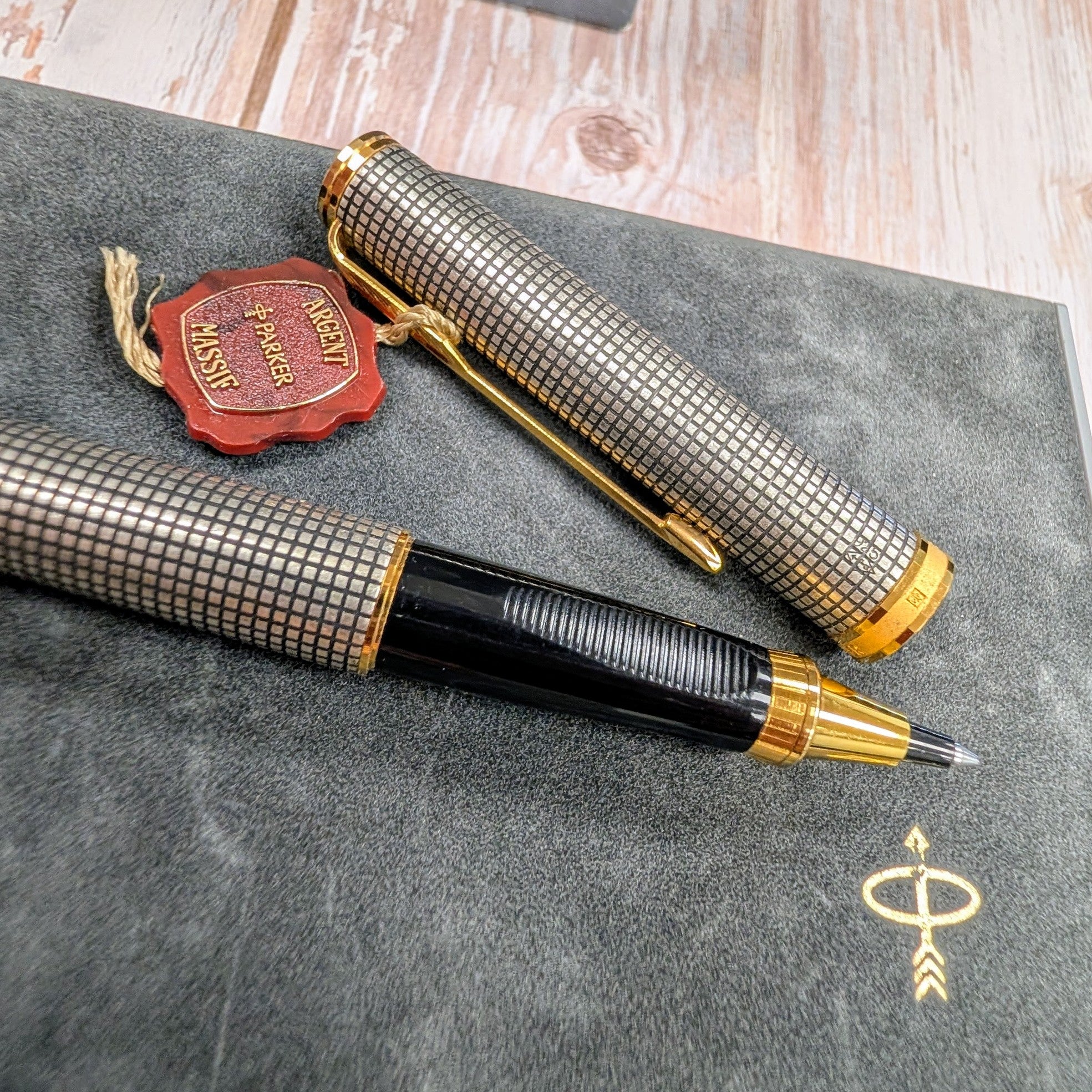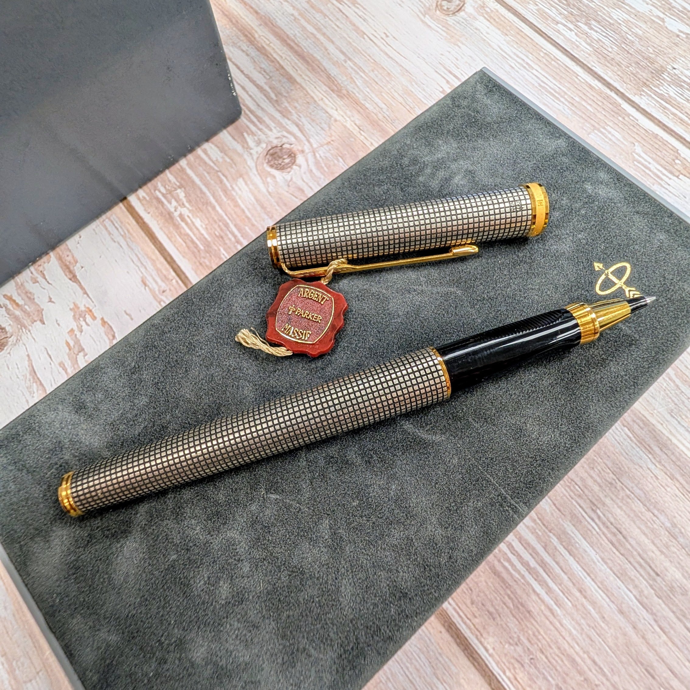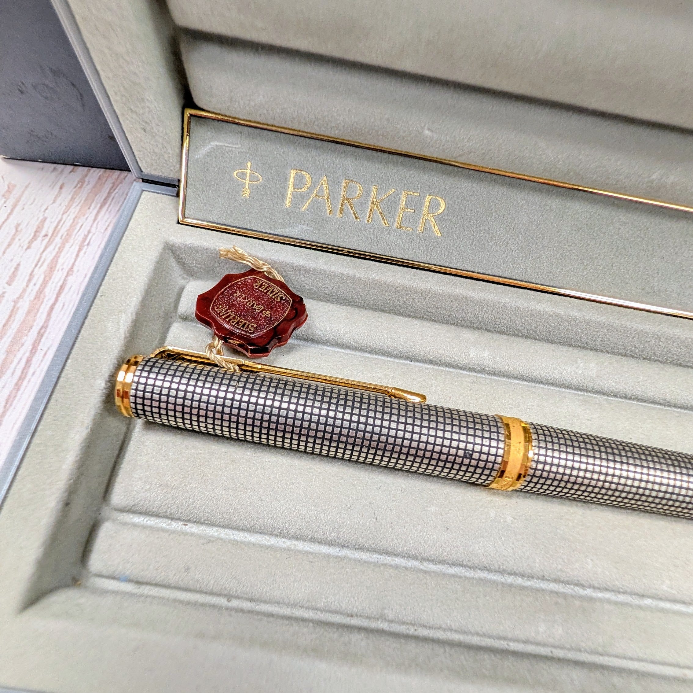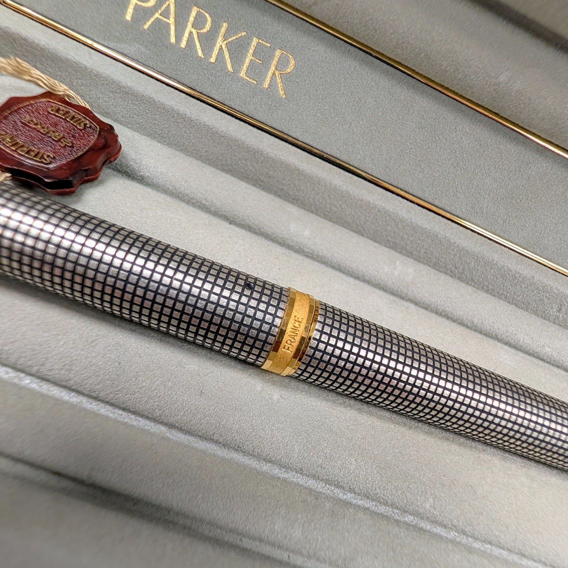 This is an authentic Parker Premier Rollerball Pen from the Premier Collection, made in France in the 1980s/1990s and presented in New Old Stock (NOS) condition. Crafted in solid sterling silver (Argent Massif) with a grid pattern finish, this elegant writing instrument features gold-plated trim and the original capped rollerball tip.