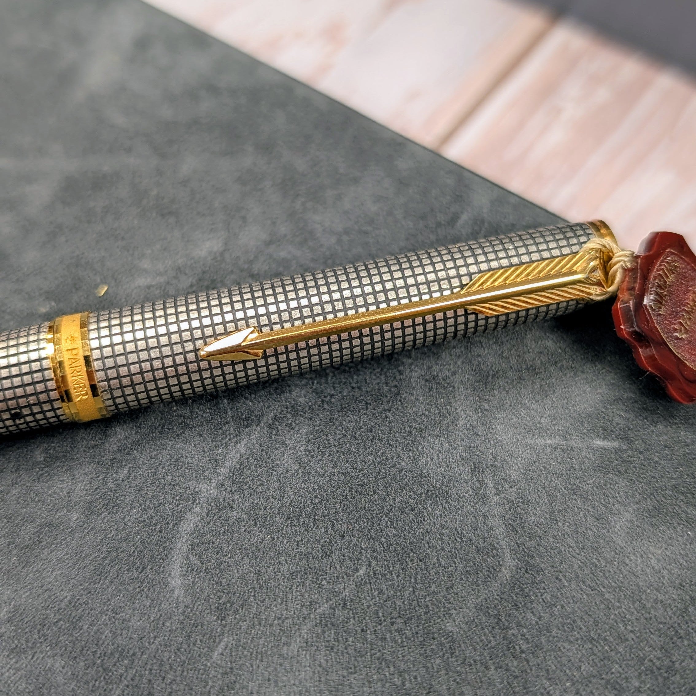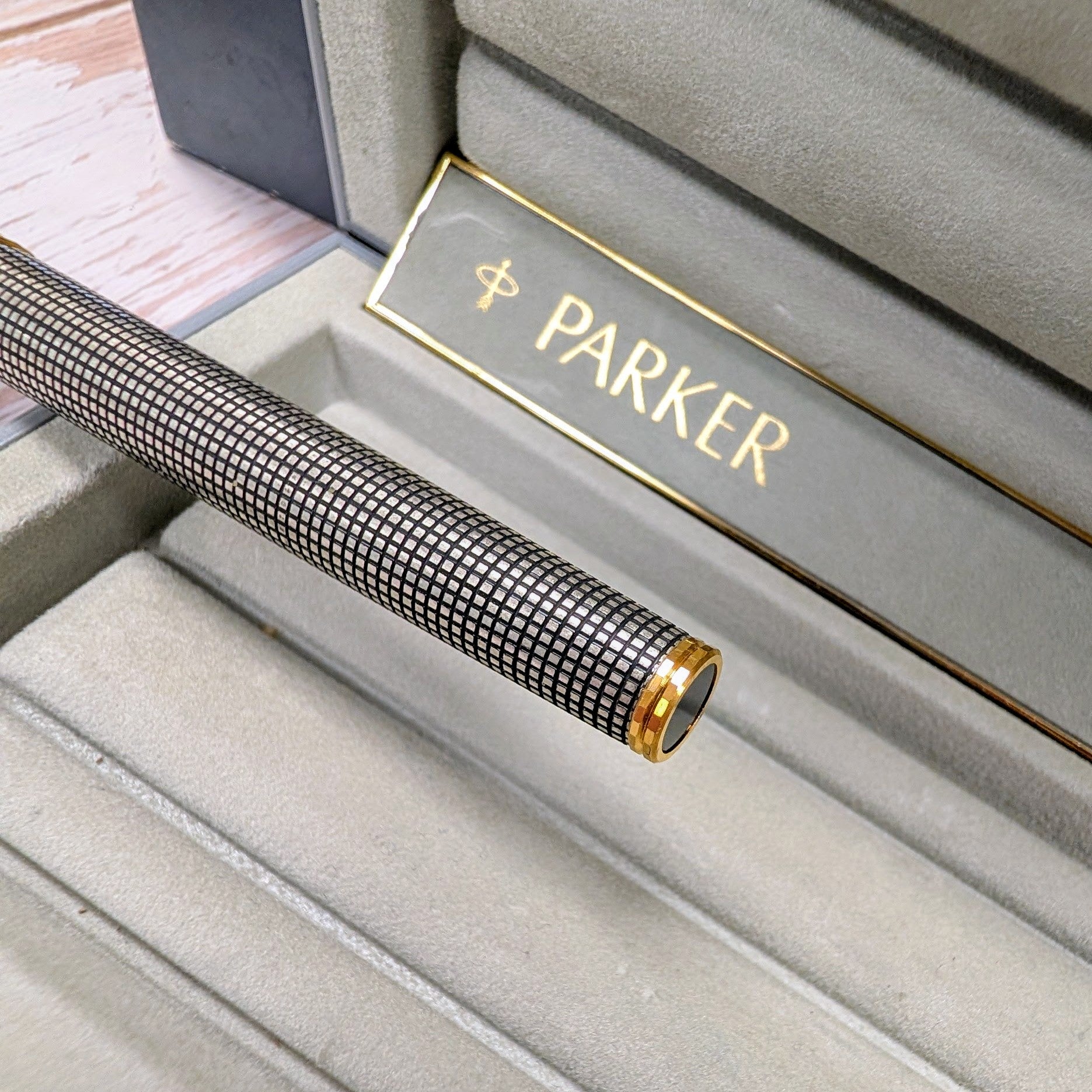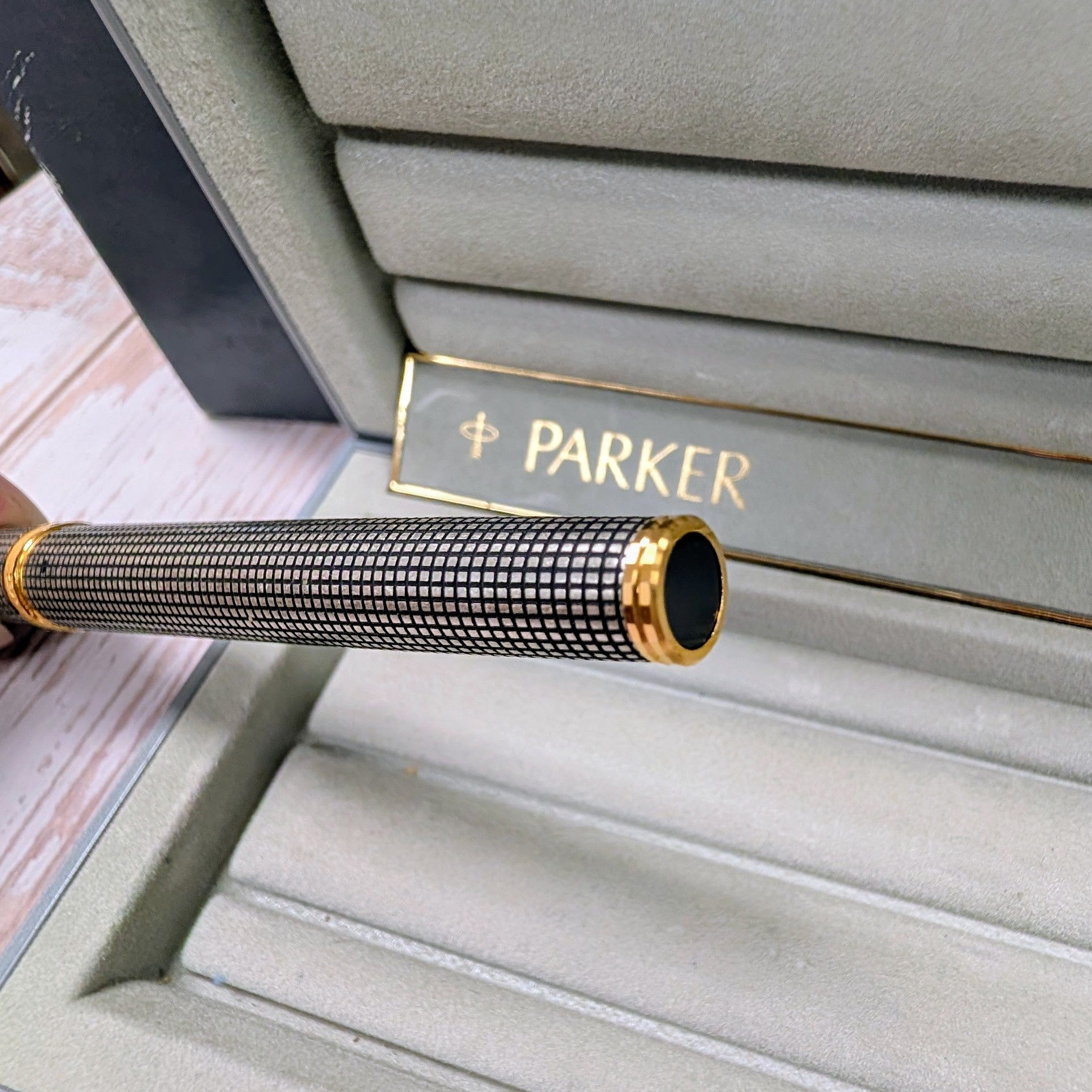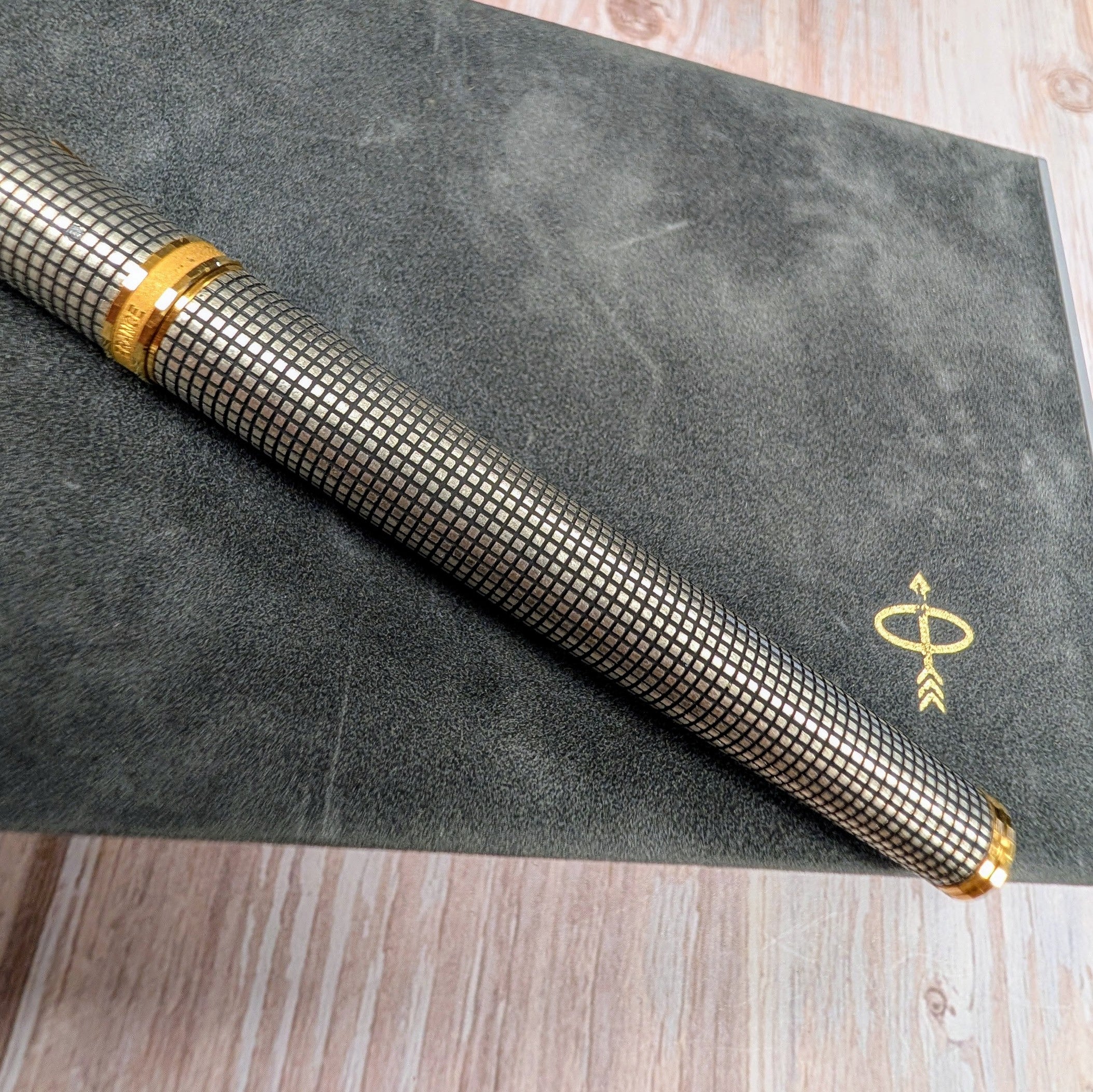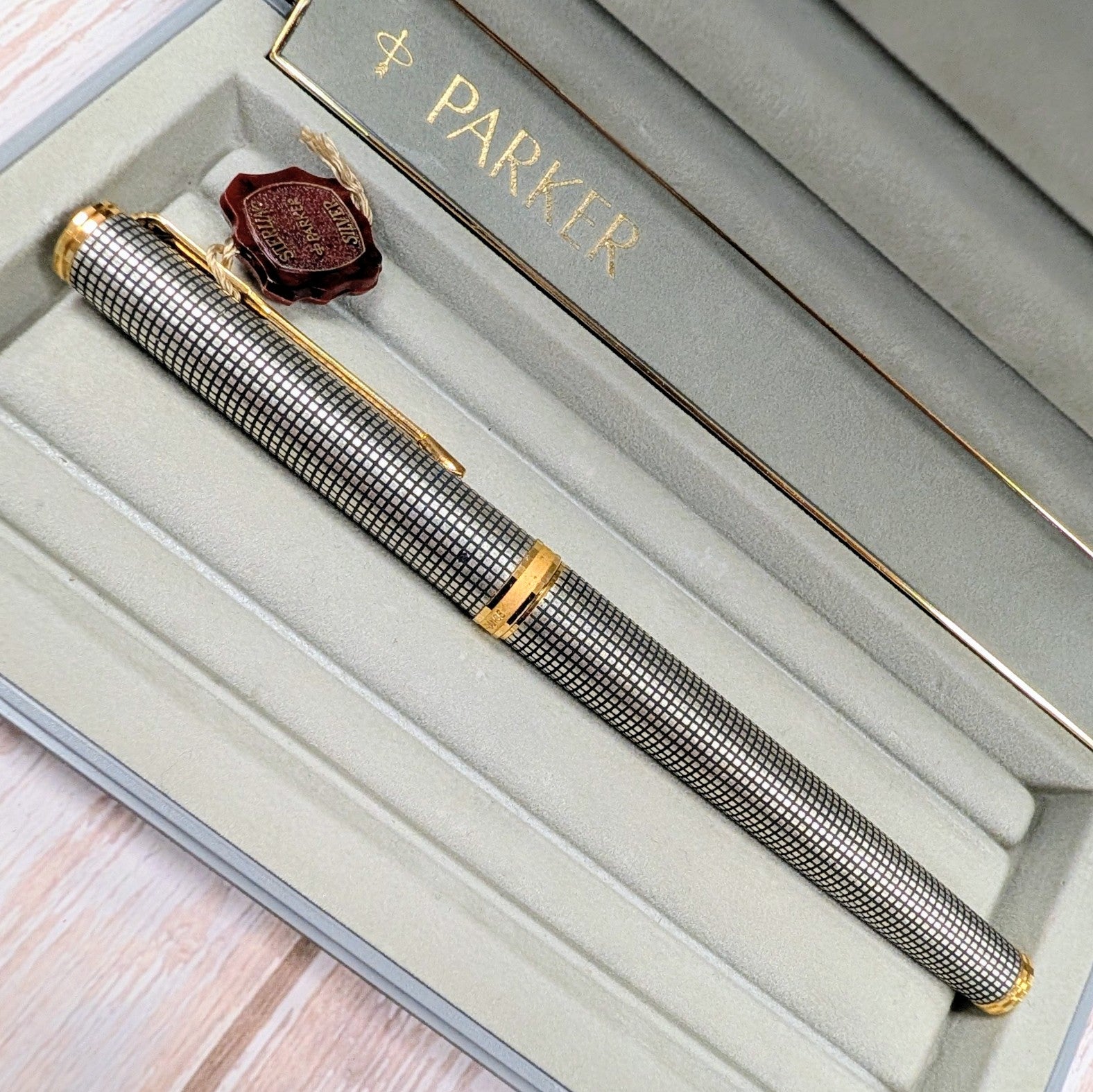 This is an authentic Parker Premier Rollerball Pen from the Premier Collection, made in France in the 1980s/1990s and presented in New Old Stock (NOS) condition. Crafted in solid sterling silver (Argent Massif) with a grid pattern finish, this elegant writing instrument features gold-plated trim and the original capped rollerball tip.