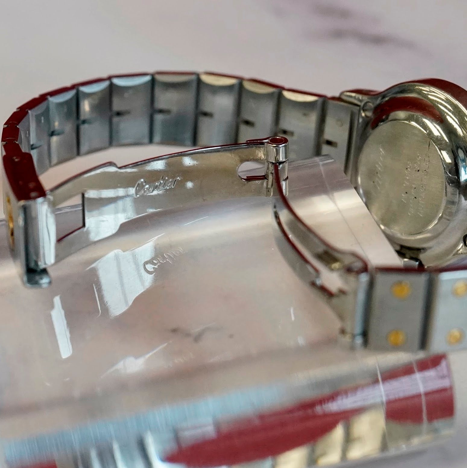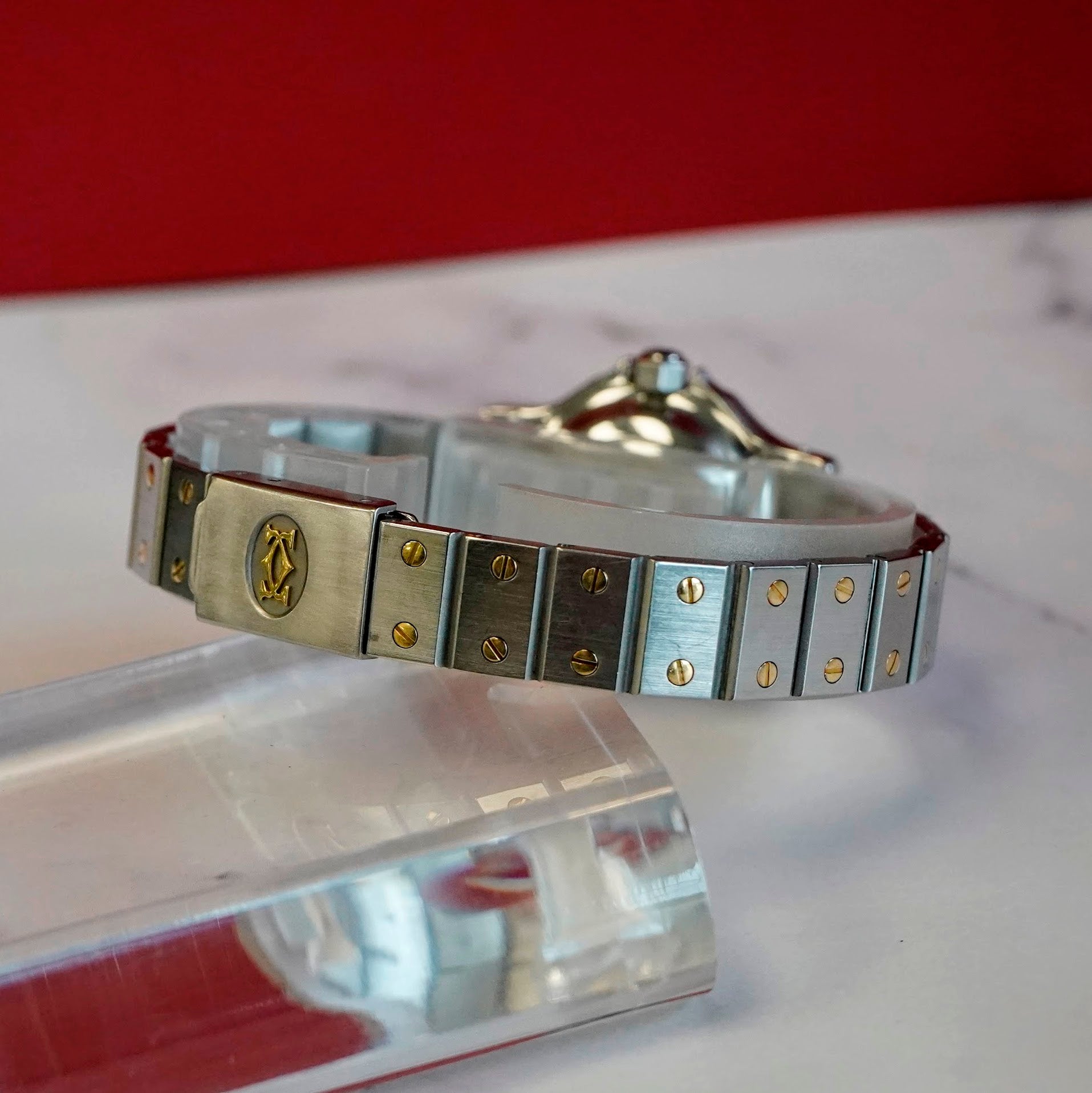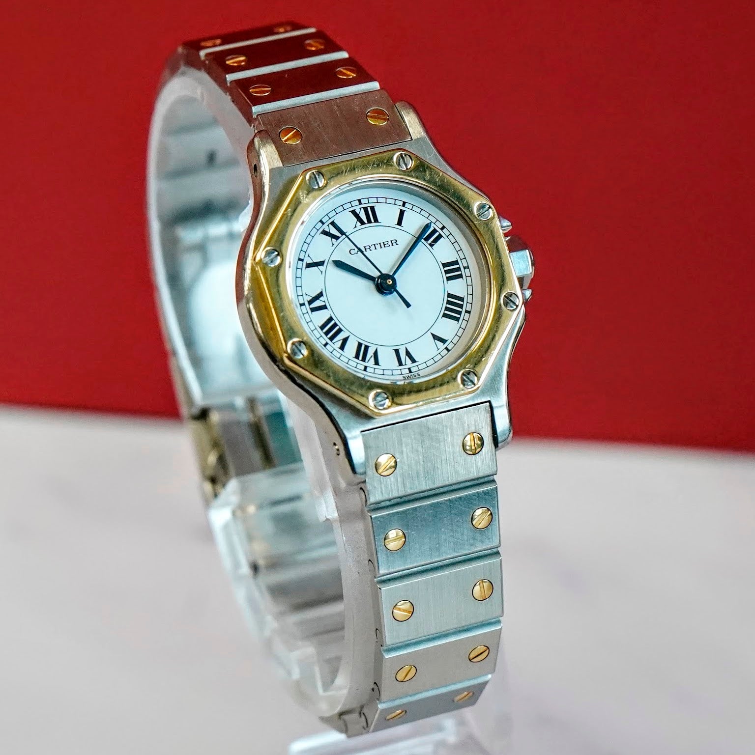 Housed in a 24mm two-tone stainless steel octagonal case with a fixed 18K yellow gold bezel. It comes fitted with a two-tone bracelet in stainless steel with yellow gold screws, offering both comfort and classic Cartier style.