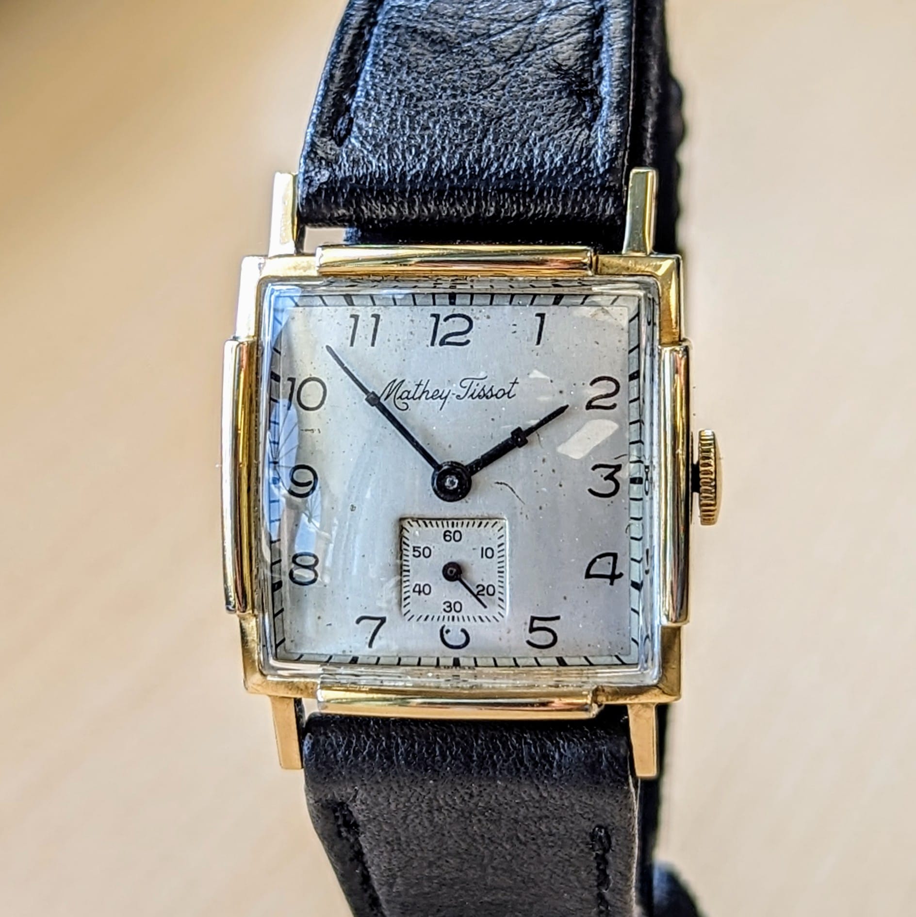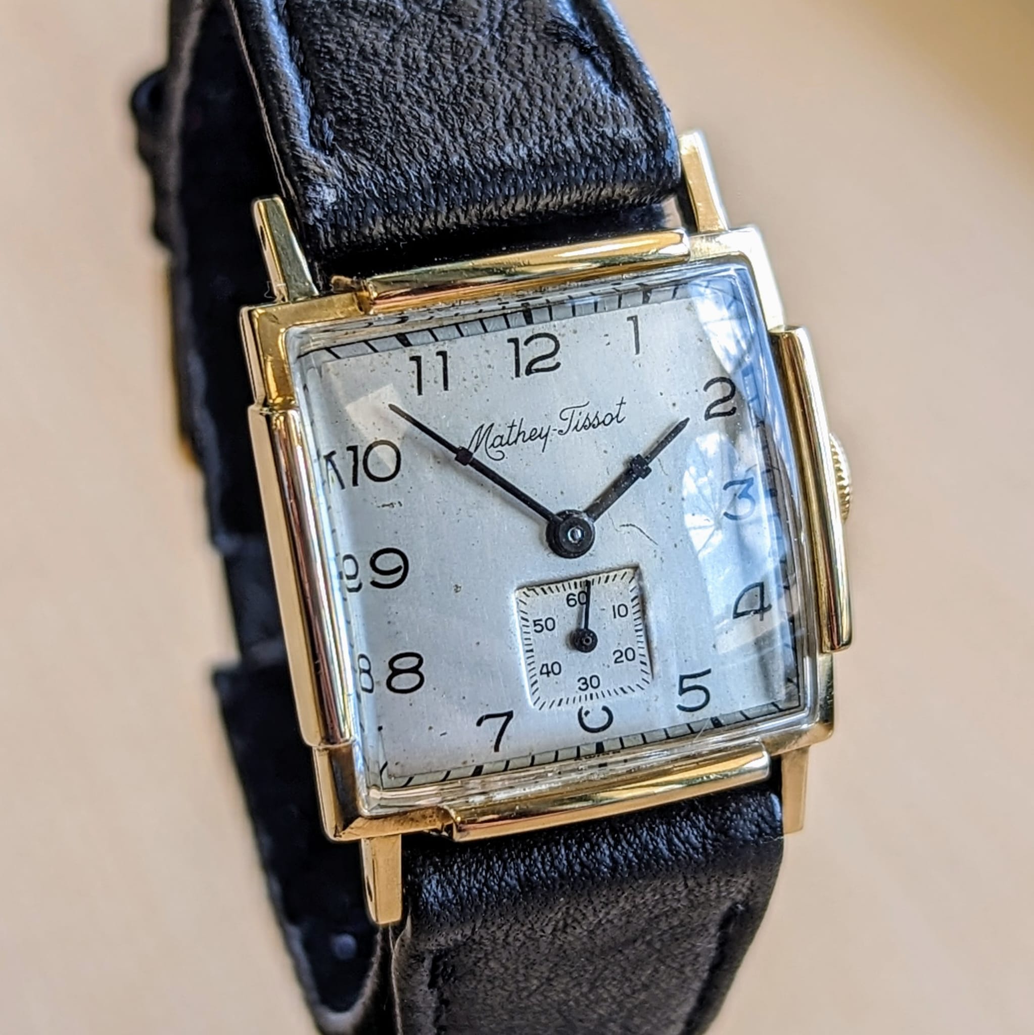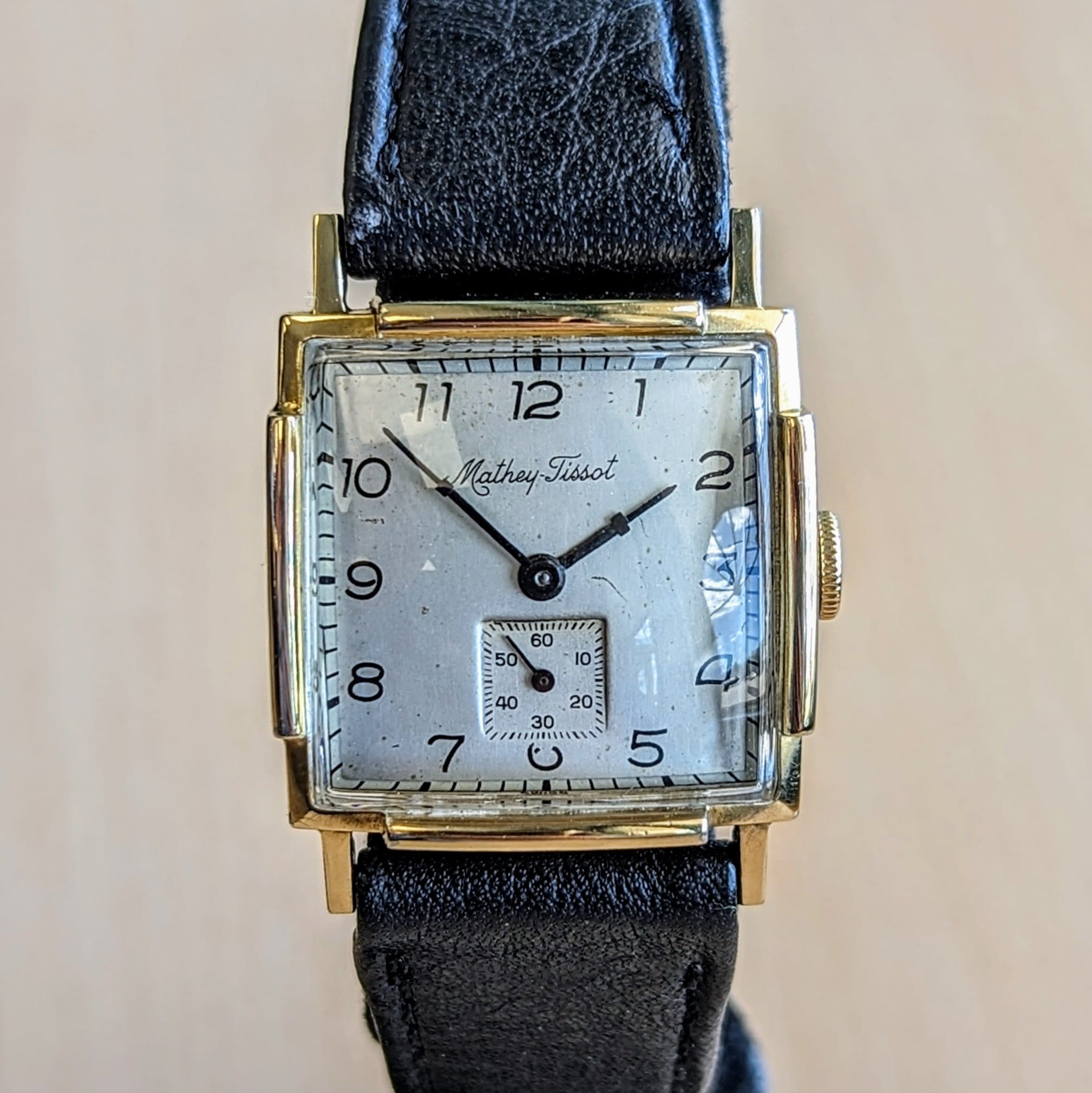 This 1950's Mathey-Tissot wristwatch features a 17-jewels mechanical movement. It has a silver dial with a sub-second dial at 6 o'clock. Cased in a 25mm Square 10K yellow gold-filled case. Swiss made. This vintage timepiece is still in good working condition.