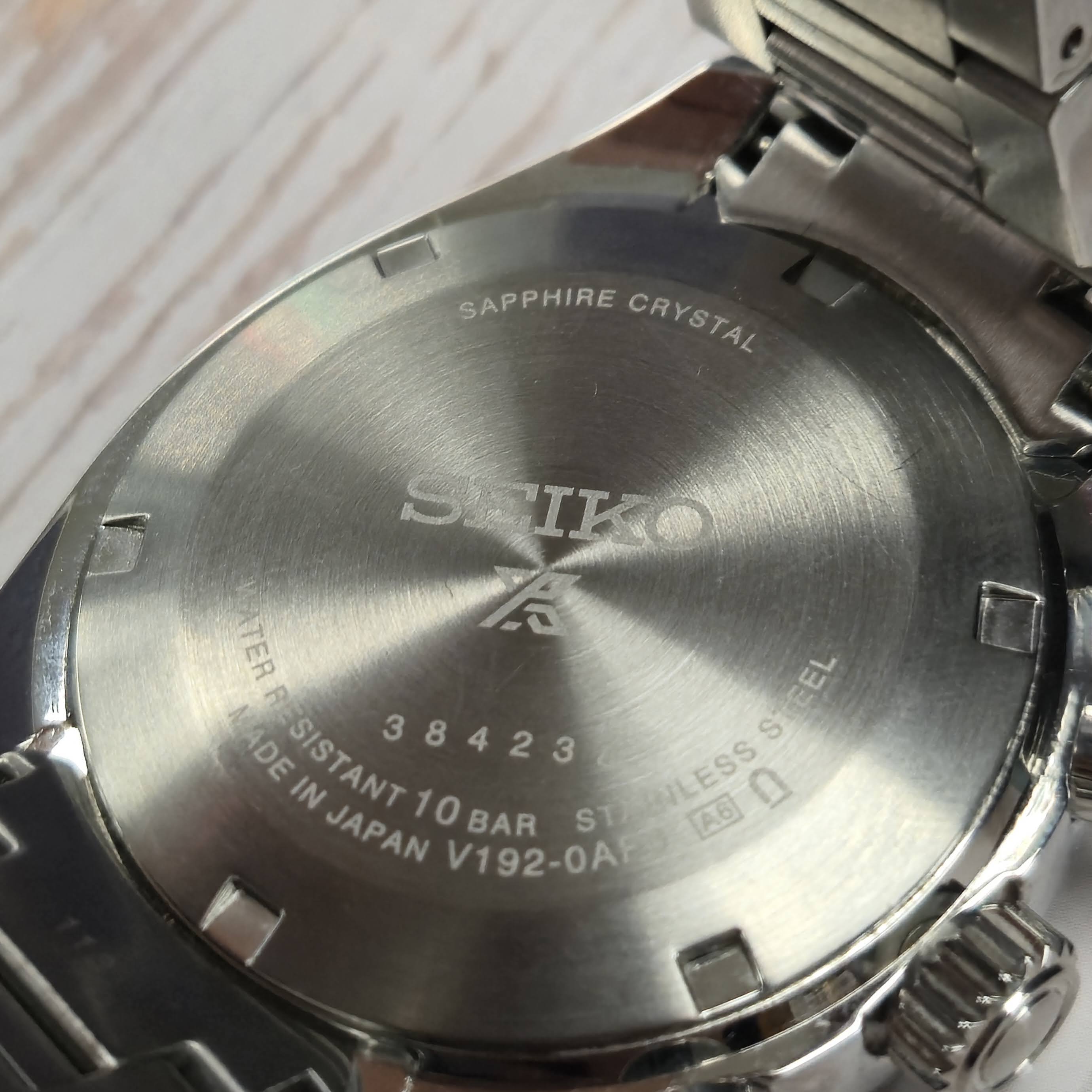 - Case Back Markings: SEIKO Water Resistant 10 bar Stainless steel Made in Japan V-192-0AF Sapphire crystal