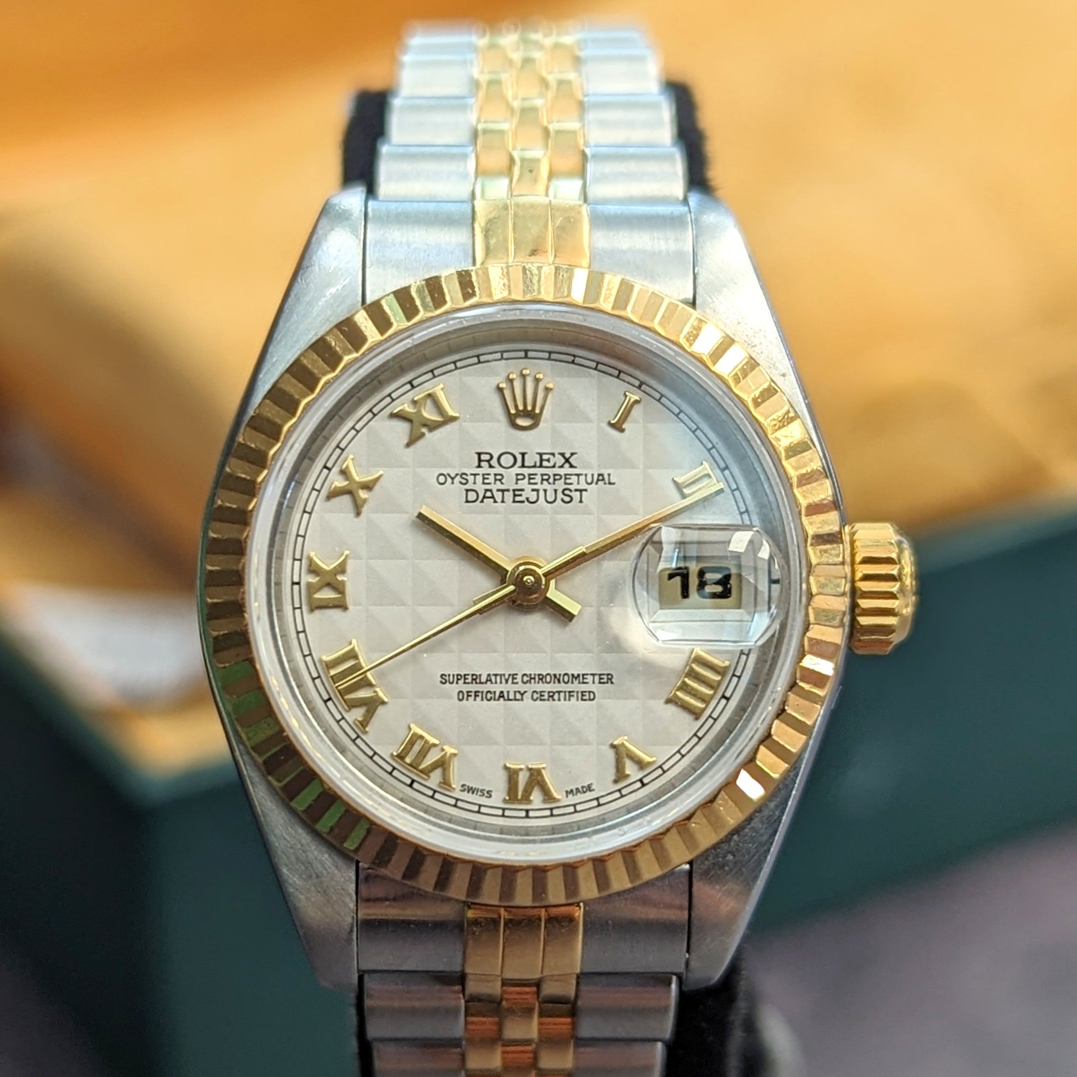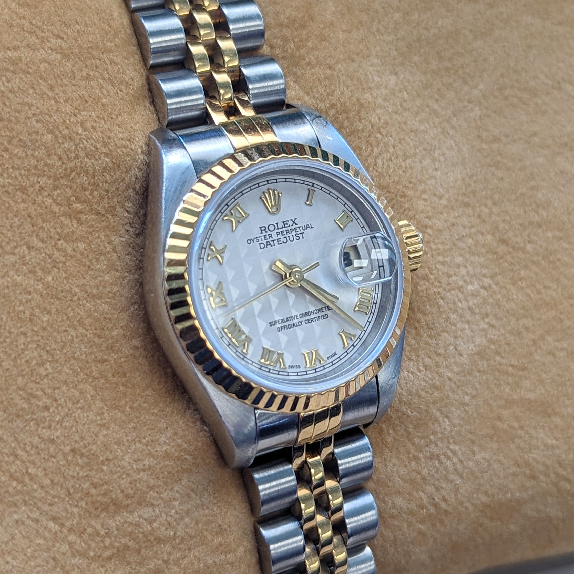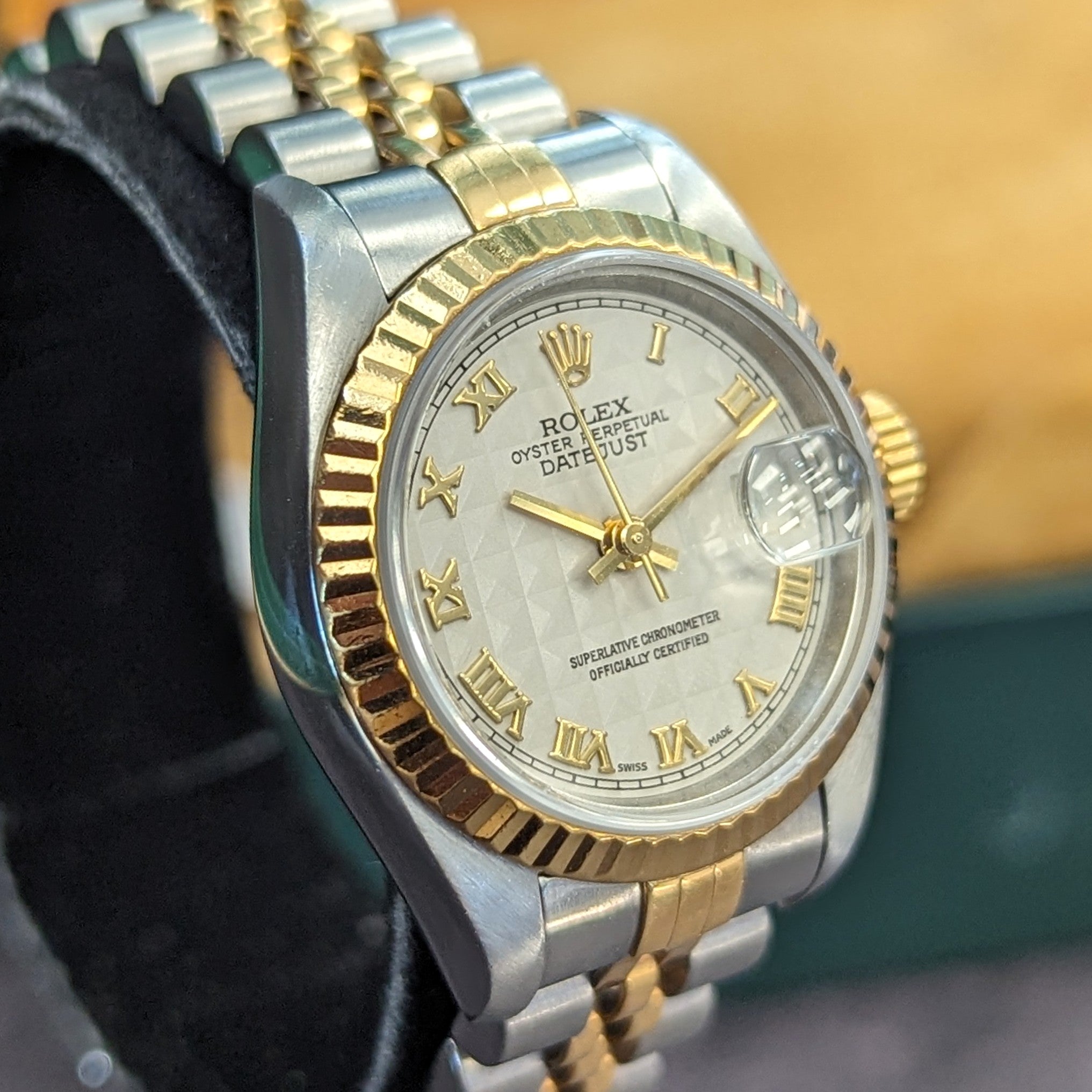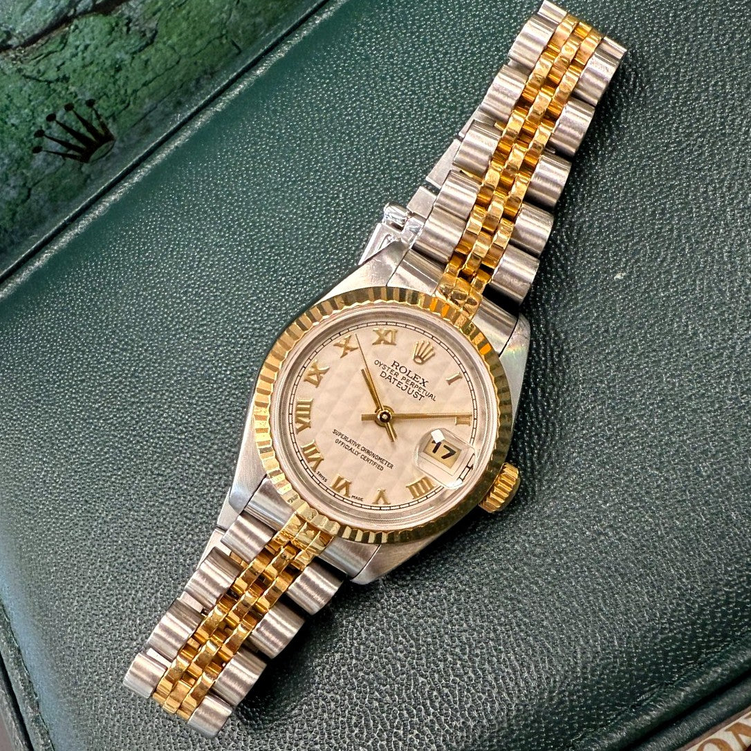 Presenting this 1996 Rolex Lady-Datejust, reference 69173 — a vintage women’s wristwatch that combines elegance with Rolex’s unmatched reputation for precision. Powered by the self-winding Rolex Caliber 2135 with sweep-second hand, 29 jewels and certificate chronometer, this Datejust features the striking Ivory Pyramid dial with applied gold Roman numeral hour markers and matching hands. The iconic Cyclops lens magnifies the date window at 3 o’clock, while the applied Rolex crown proudly sits at 12.