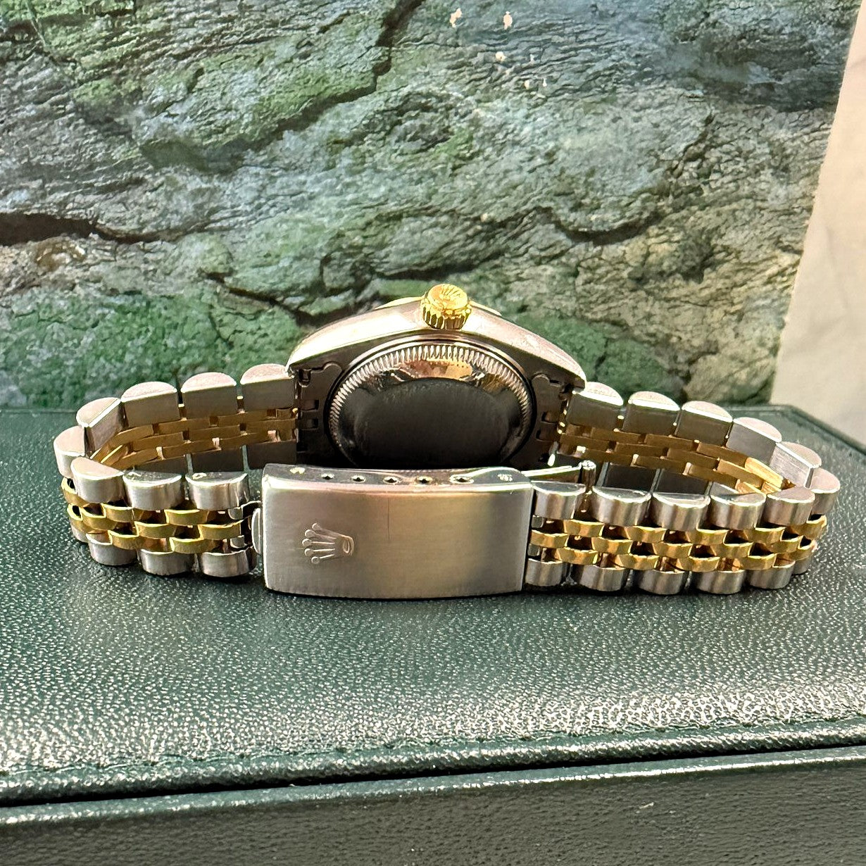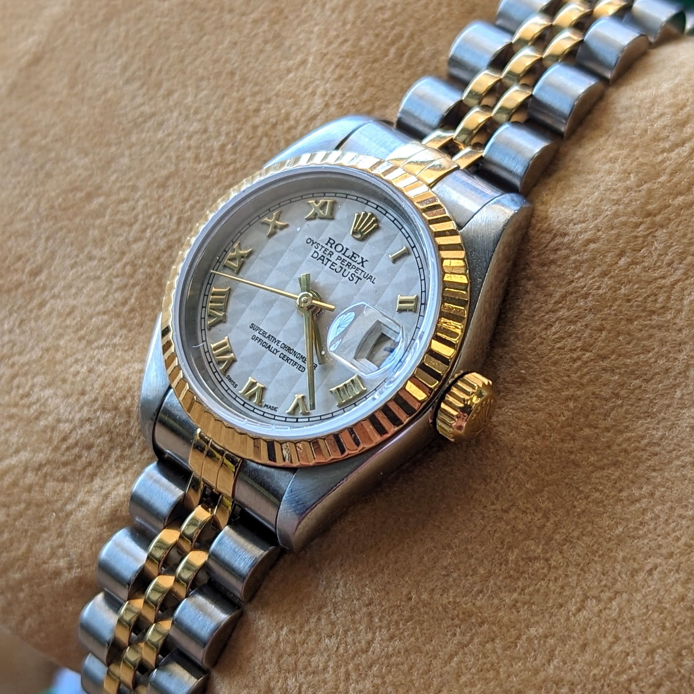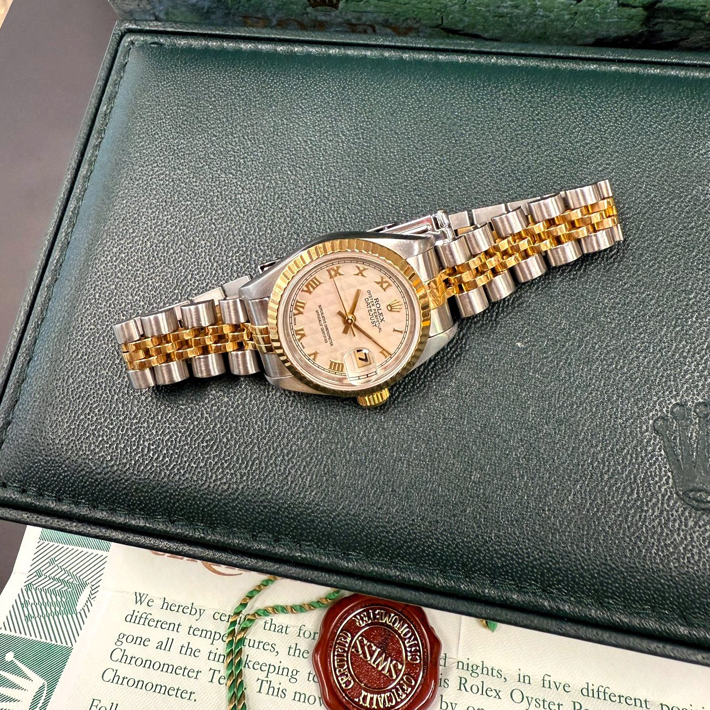 Presenting this 1996 Rolex Lady-Datejust, reference 69173 — a vintage women’s wristwatch that combines elegance with Rolex’s unmatched reputation for precision. Powered by the self-winding Rolex Caliber 2135 with sweep-second hand, 29 jewels and certificate chronometer, this Datejust features the striking Ivory Pyramid dial with applied gold Roman numeral hour markers and matching hands. The iconic Cyclops lens magnifies the date window at 3 o’clock, while the applied Rolex crown proudly sits at 12.