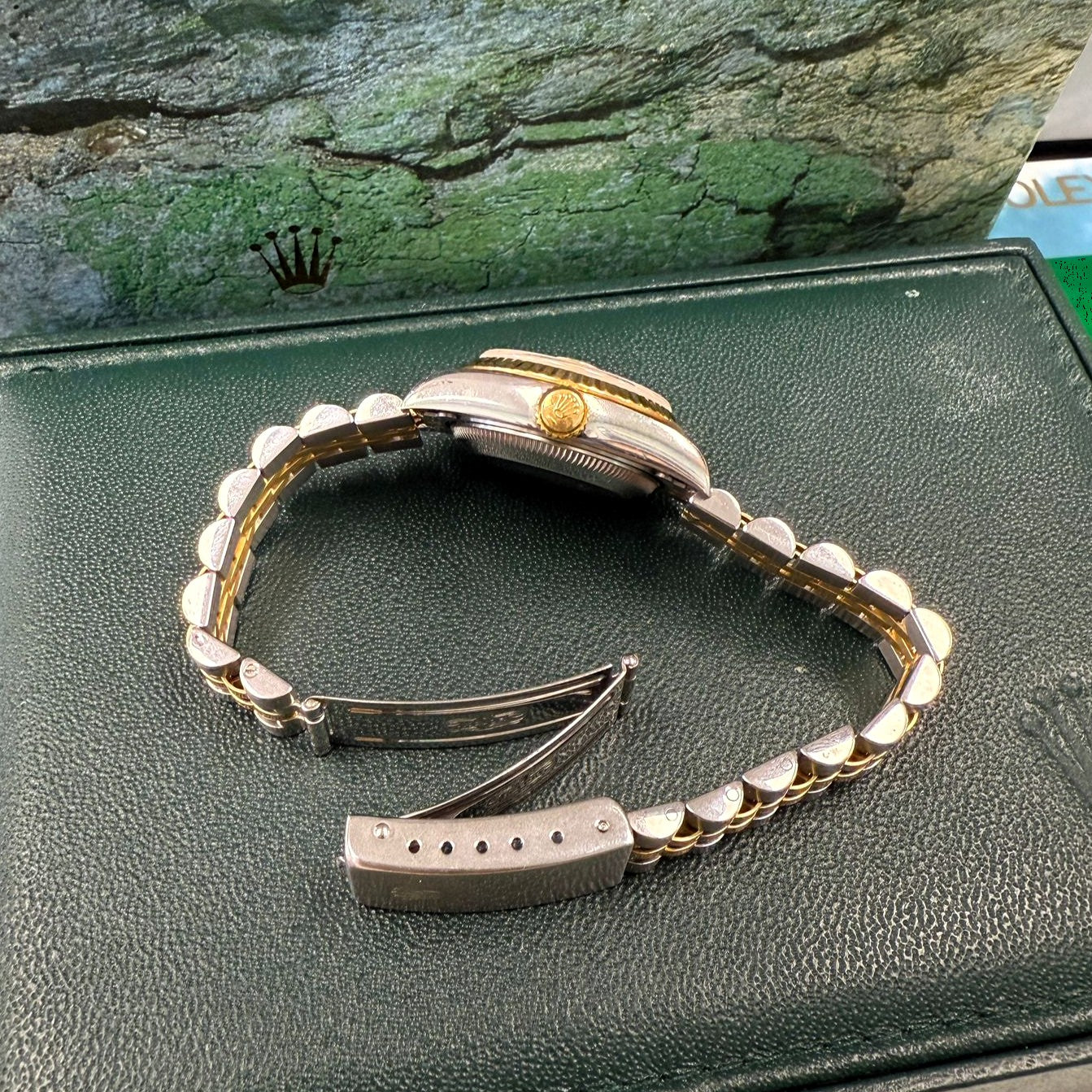 Housed in a 26mm stainless steel Oyster case with an 18k yellow gold fluted bezel, this two-tone beauty is fitted with the classic Jubilee bracelet (ref. 62523D-18) in stainless steel and 18k yellow gold center links. The watch is accompanied by its full original set, including both inner and outer Rolex boxes, chronometer certificate, booklets, and hang tags — making this an exceptional collector’s piece. The serial number confirms a 1996 production year. Fully original and well-preserved, this Lady-Datejust embodies sophistication, heritage, and everyday wearability.