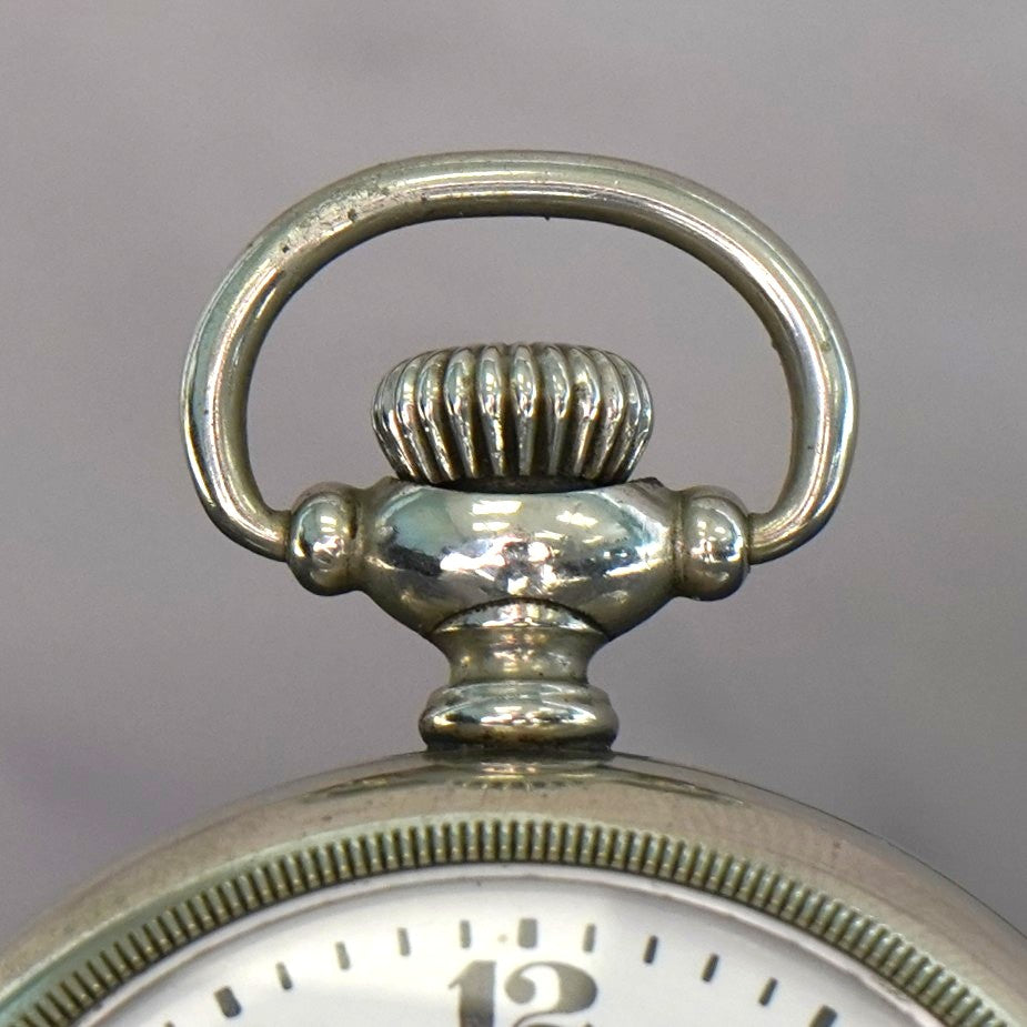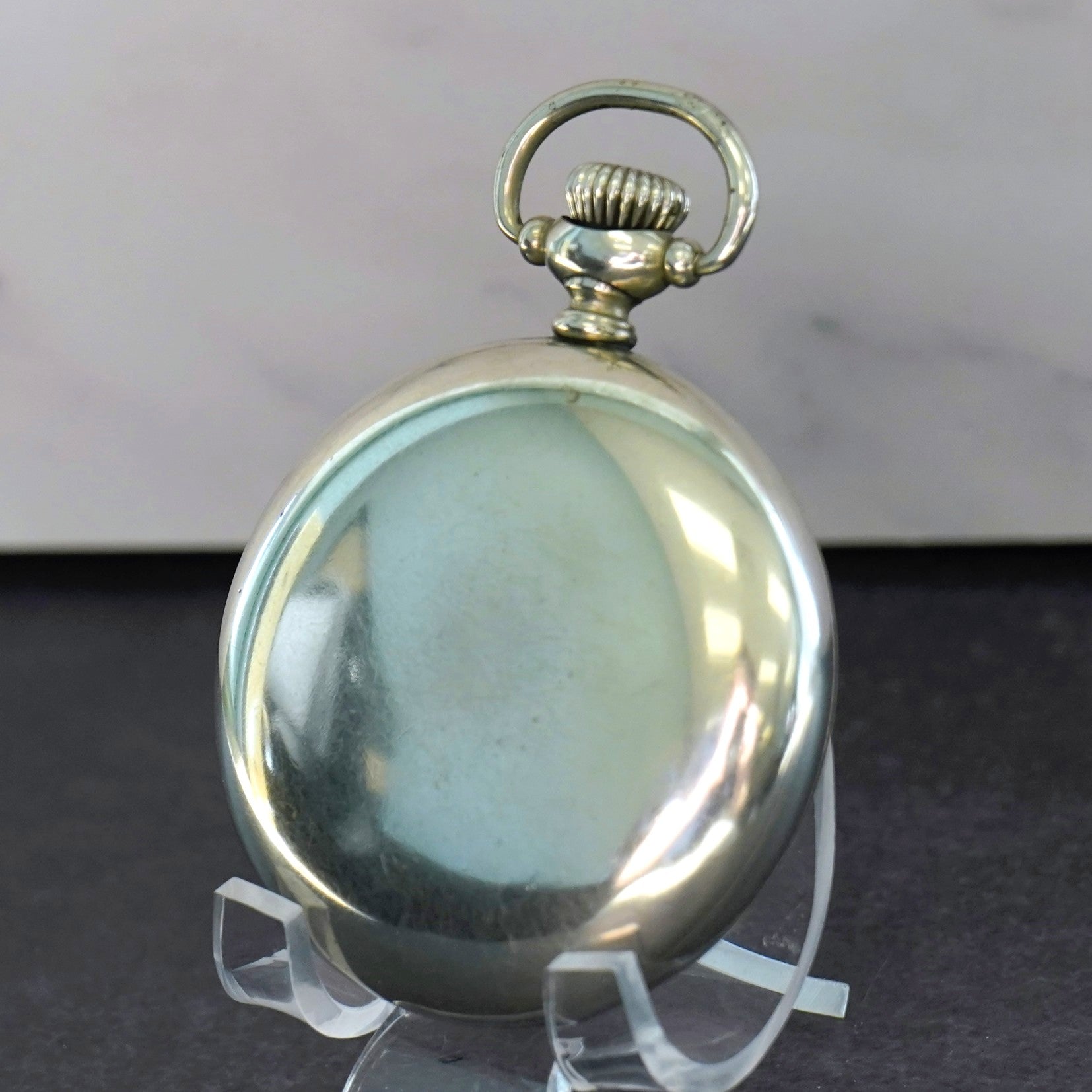 The watch is housed in a 53.7mm nickel round case with polished finish and engraved edge, paired with a classic bow and crown — a typical design for the era.