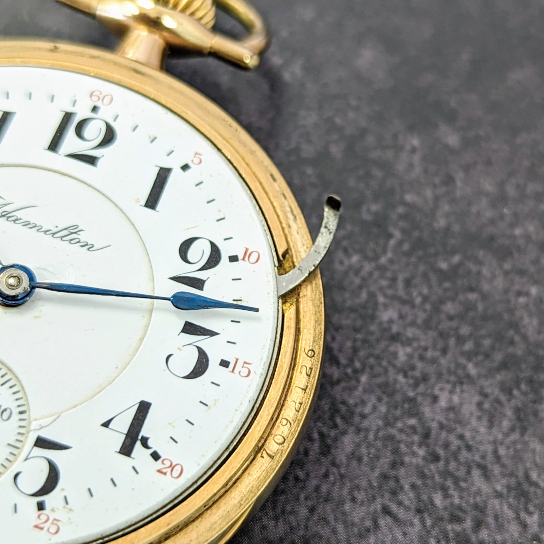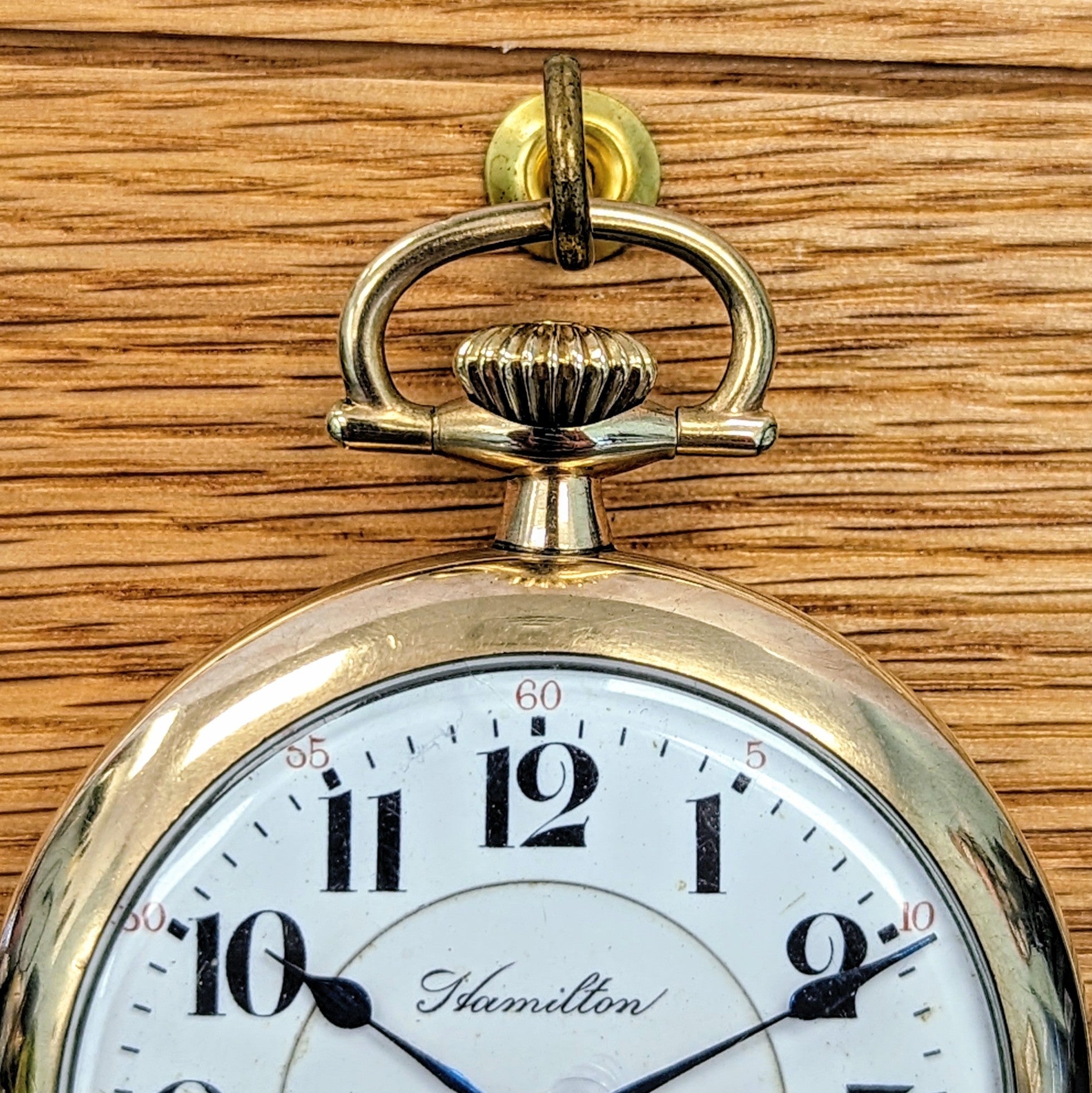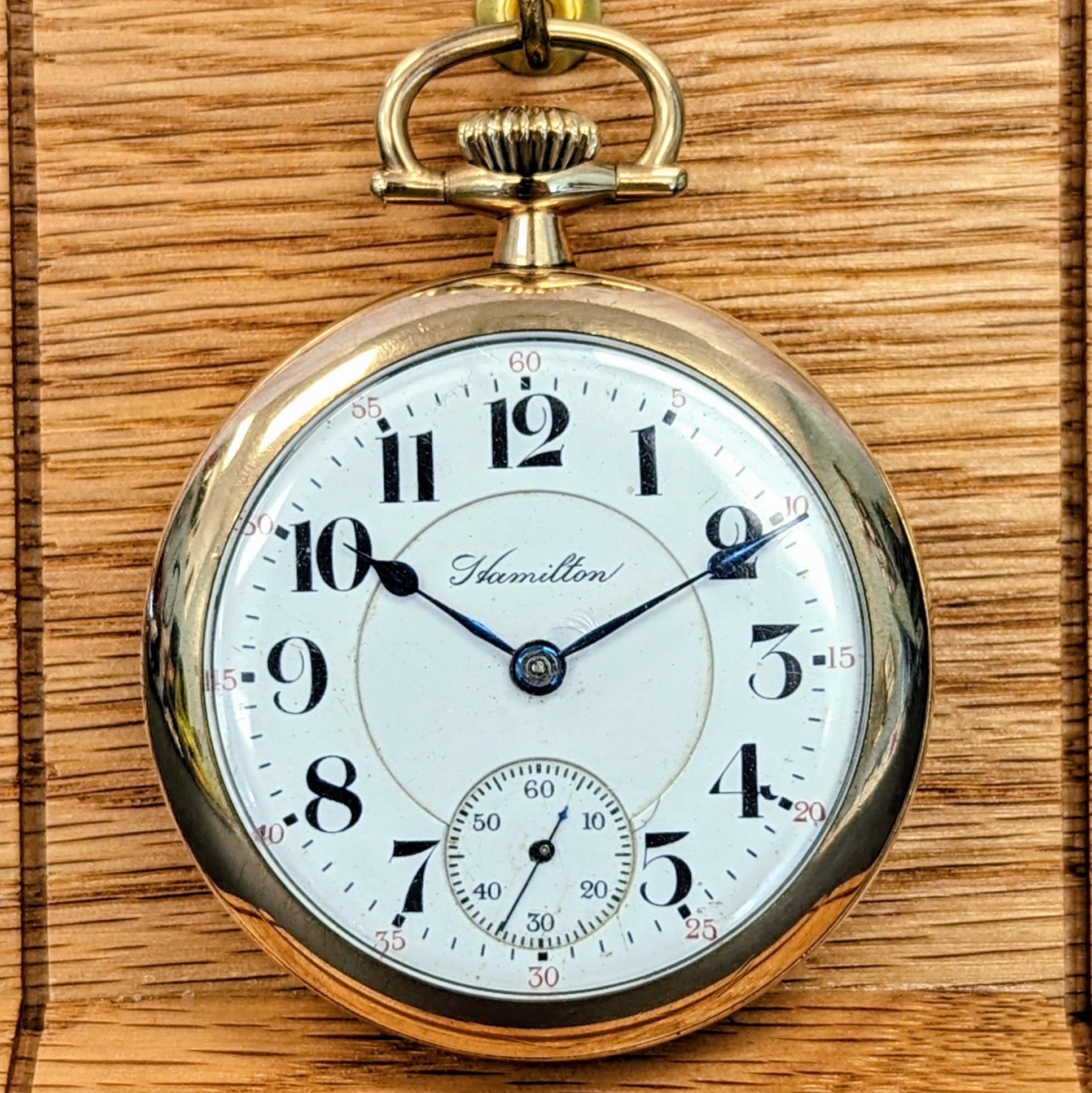 This 1914 Hamilton Railroad pocket watch is a classic example of early 20th-century American watchmaking, crafted during a pivotal time in railroad history. Featuring a clean white enamel dial with bold black Arabic numerals, a black and red outer minute track, and blued steel hands, it offers both timeless design and practical legibility. A sub-seconds dial sits neatly at 6 o’clock, true to the functionality required by railroad standards of the era.