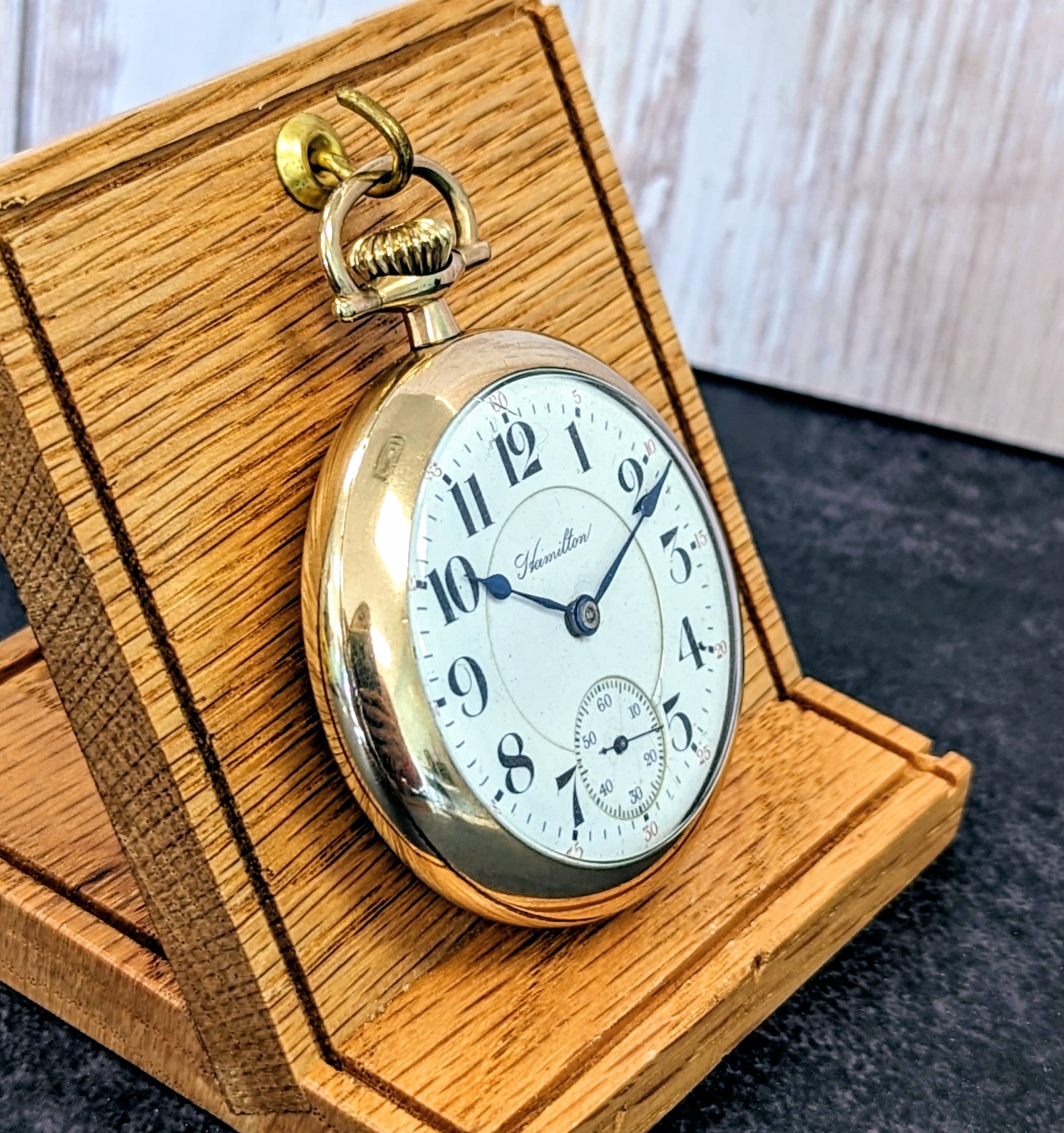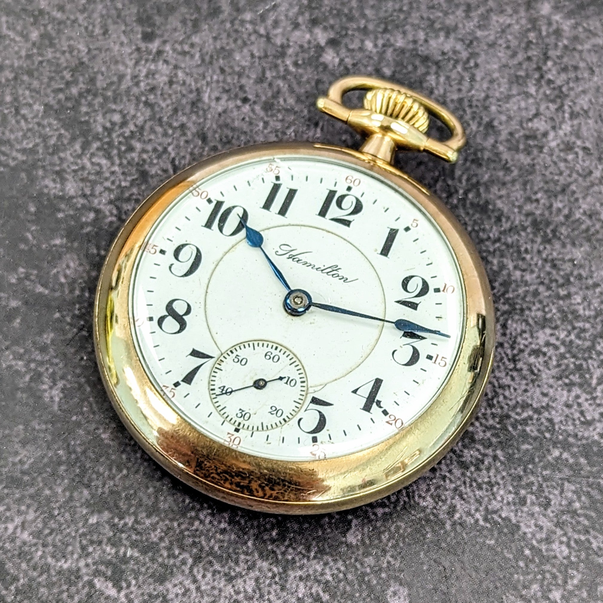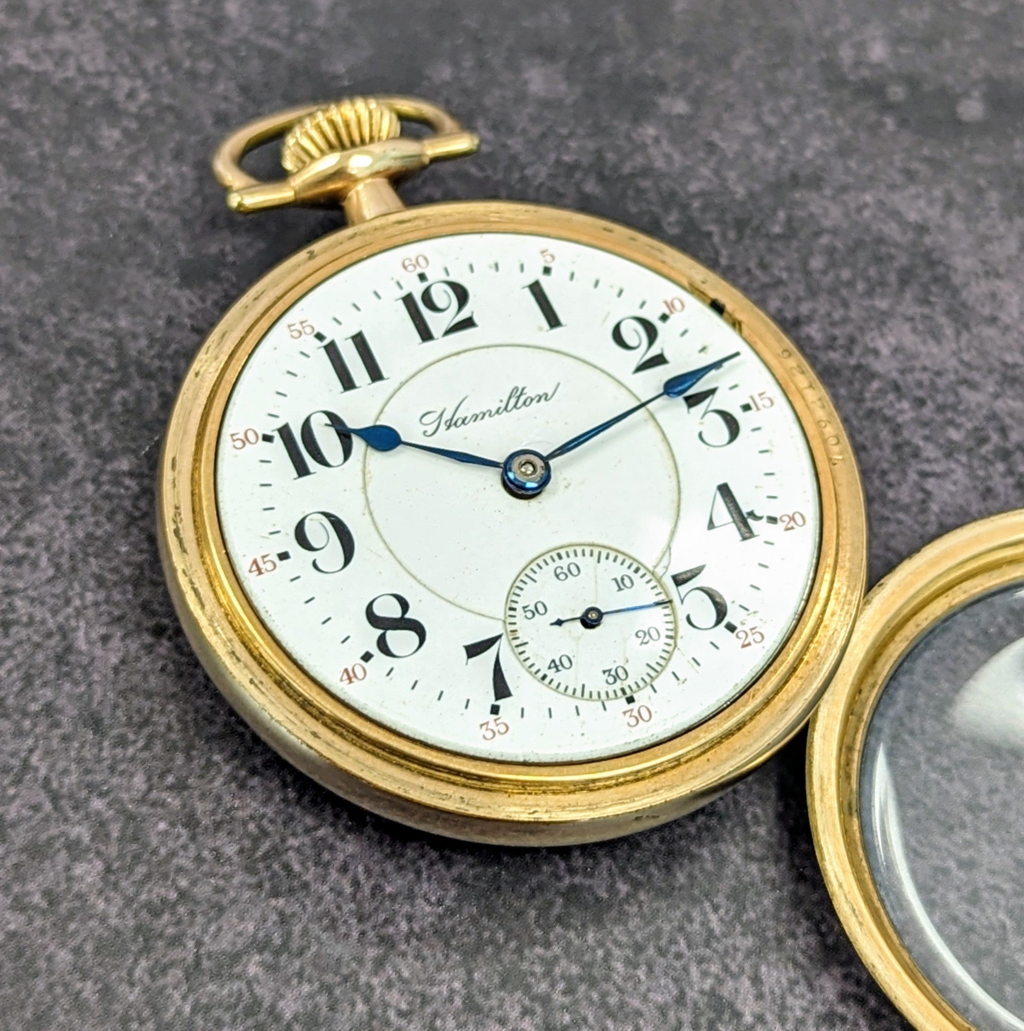 The case is made of yellow gold-filled, with a smooth bezel and screw-back. It shows signs of use consistent with age, but remains in good vintage condition overall. This fine Hamilton timepiece offers a wonderful opportunity to own a functional piece of American horological and railroad heritage.