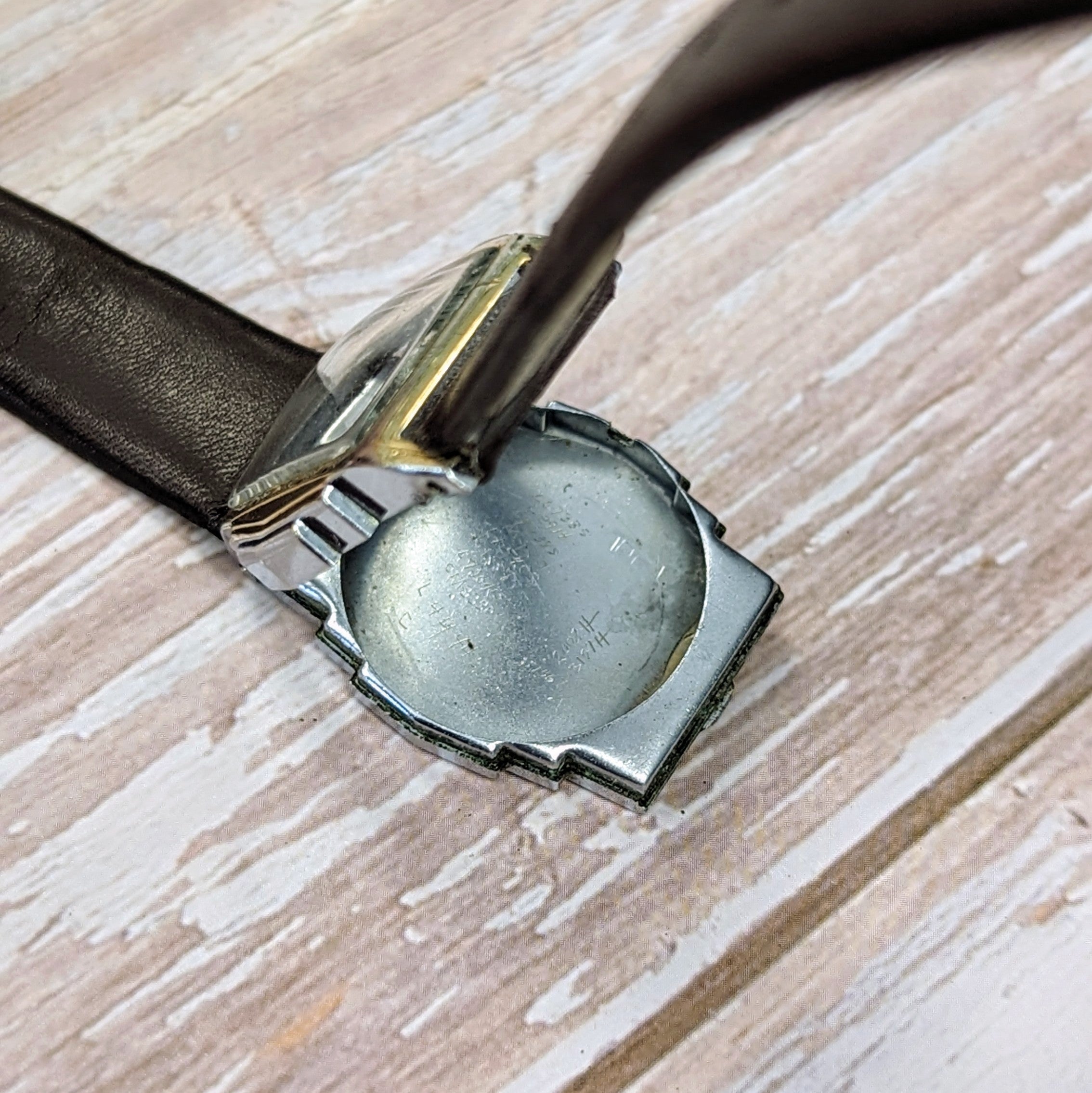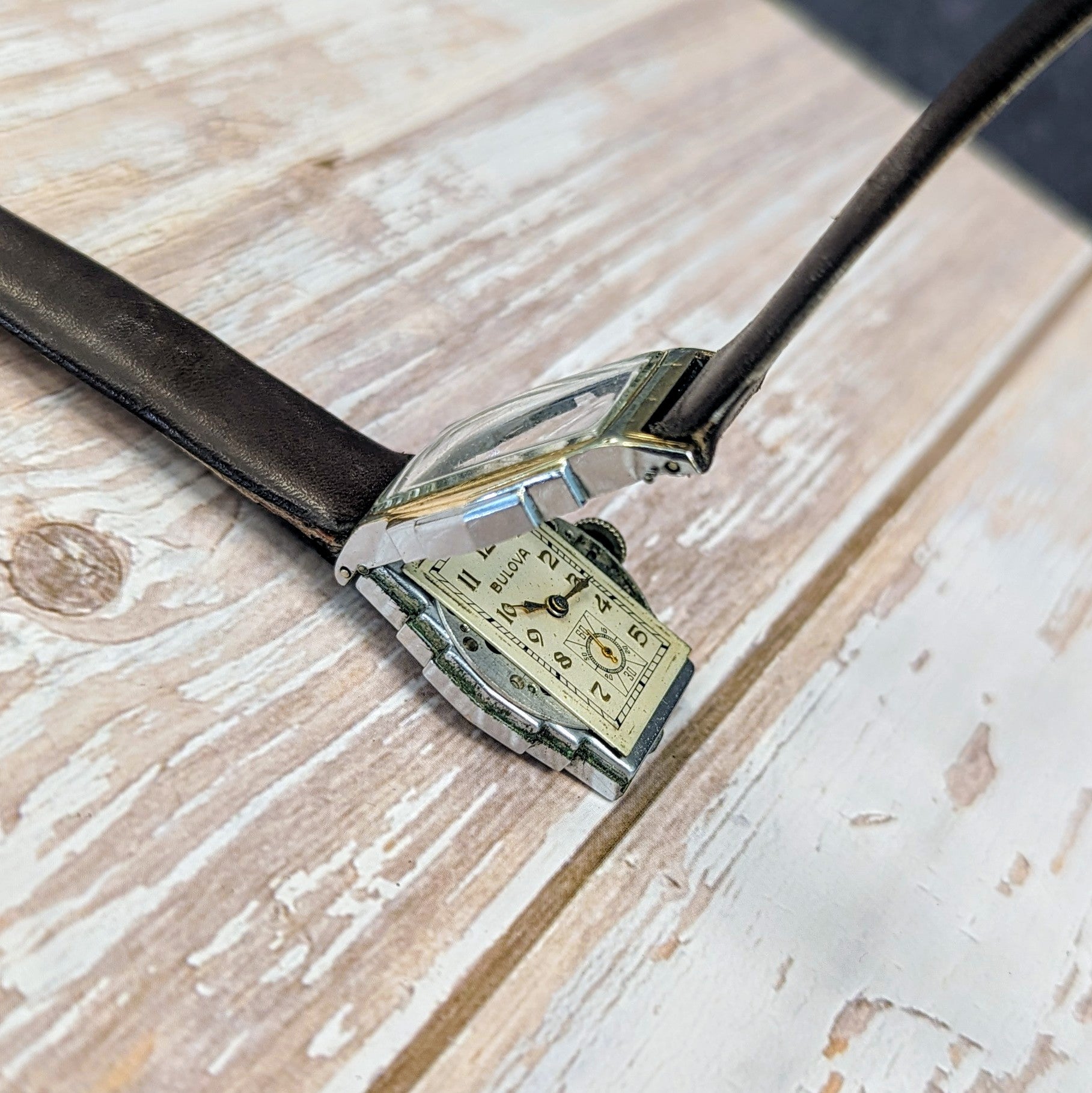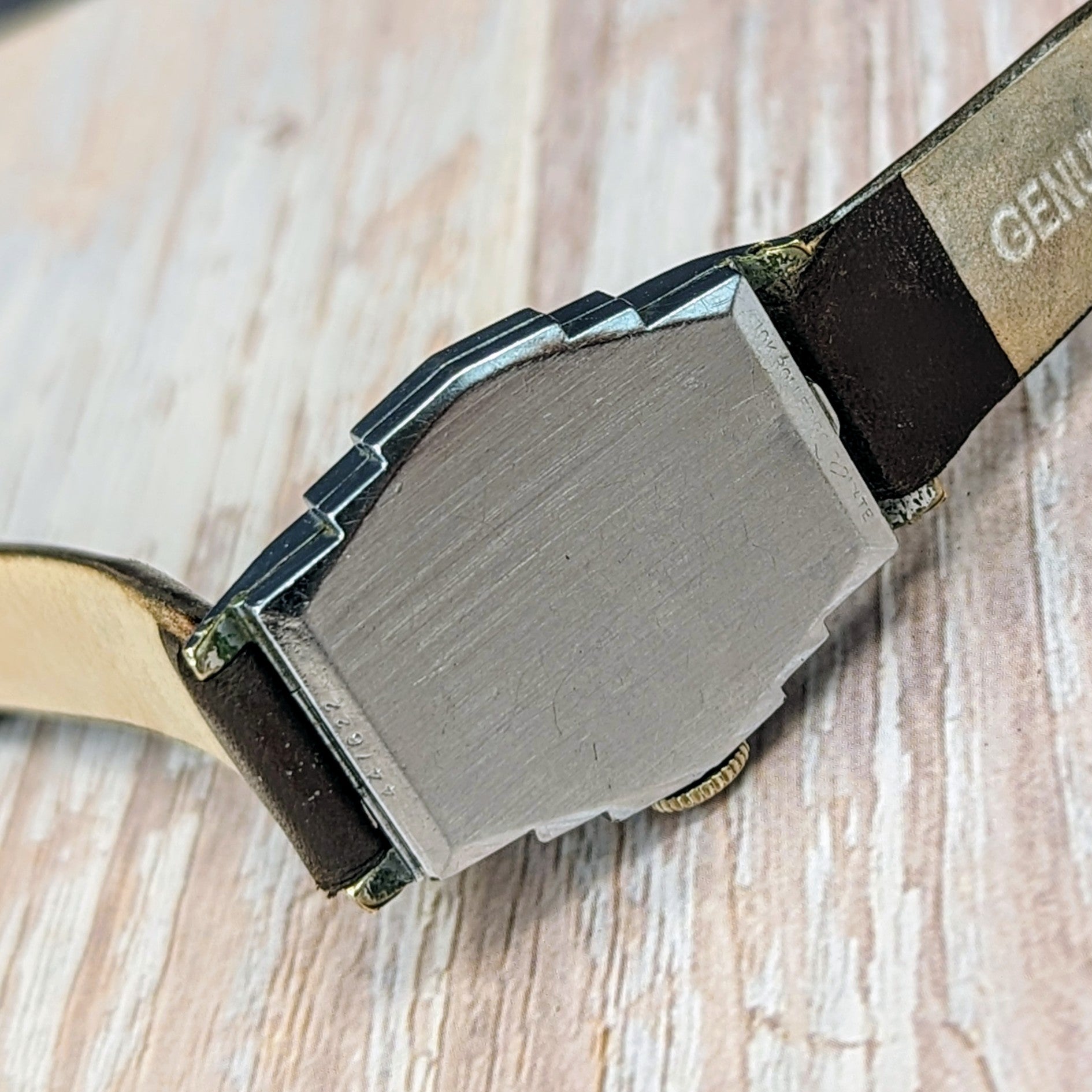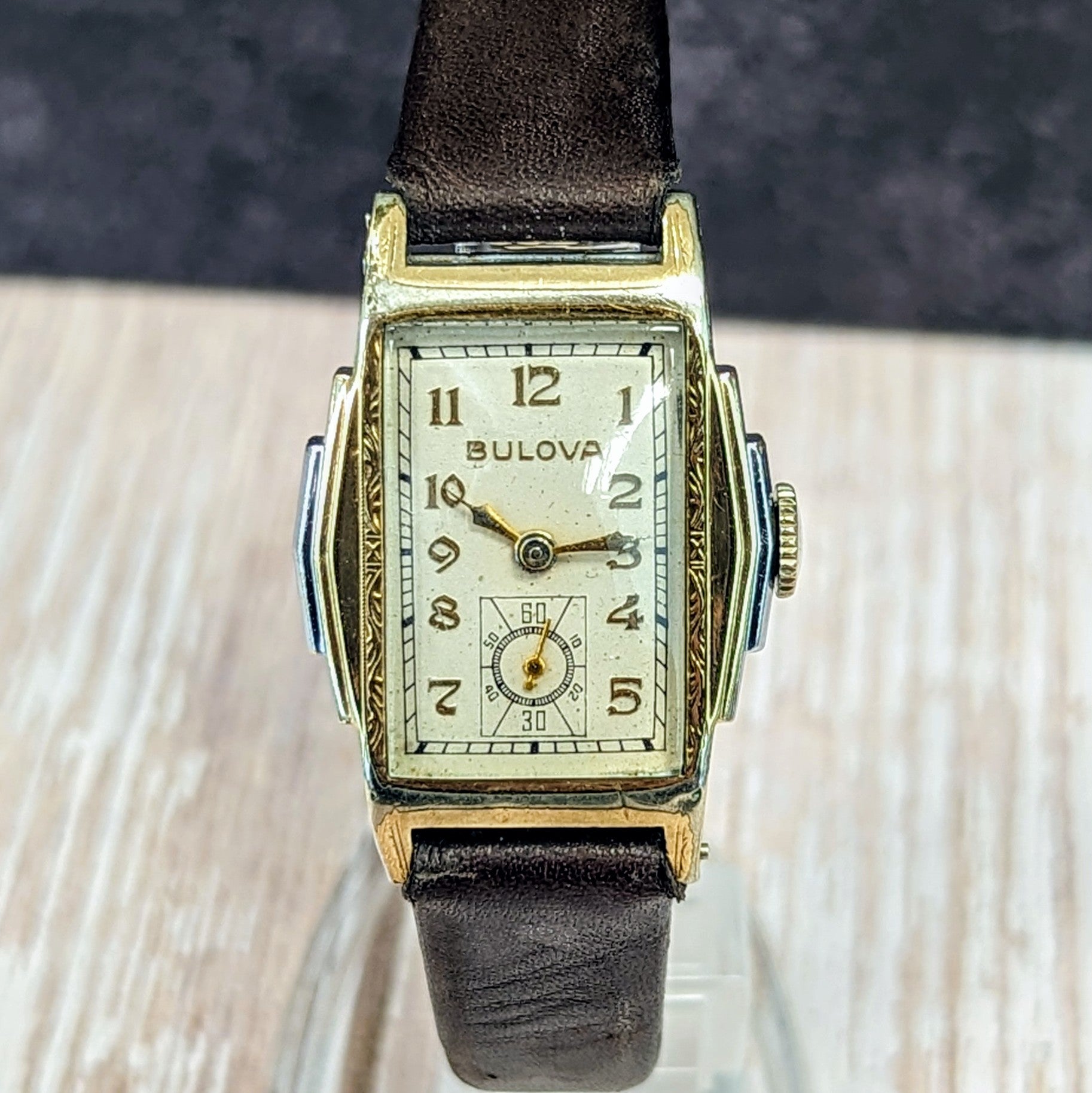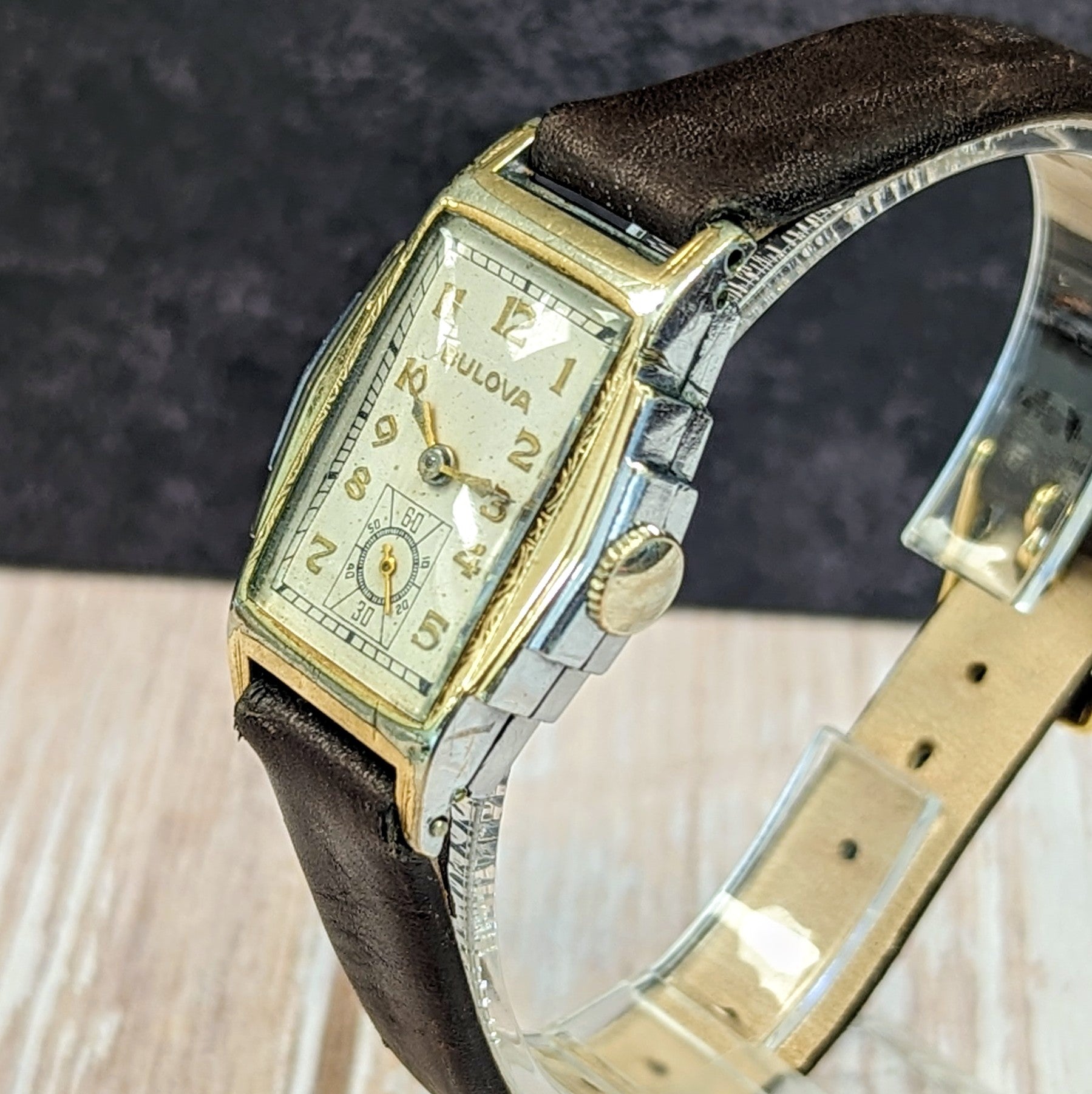 This particular piece is a vintage Bulova 1934 Lone Eagle men’s wristwatch, made in U.S.A. that blends elegant aesthetics with mechanical craftsmanship. The 25x29.7mm case is a beautifully engraved two-tone 10K rolled gold-plated rectangular design, paired with a classic brown leather strap. It’s a rare survivor from the golden age of wristwatches.