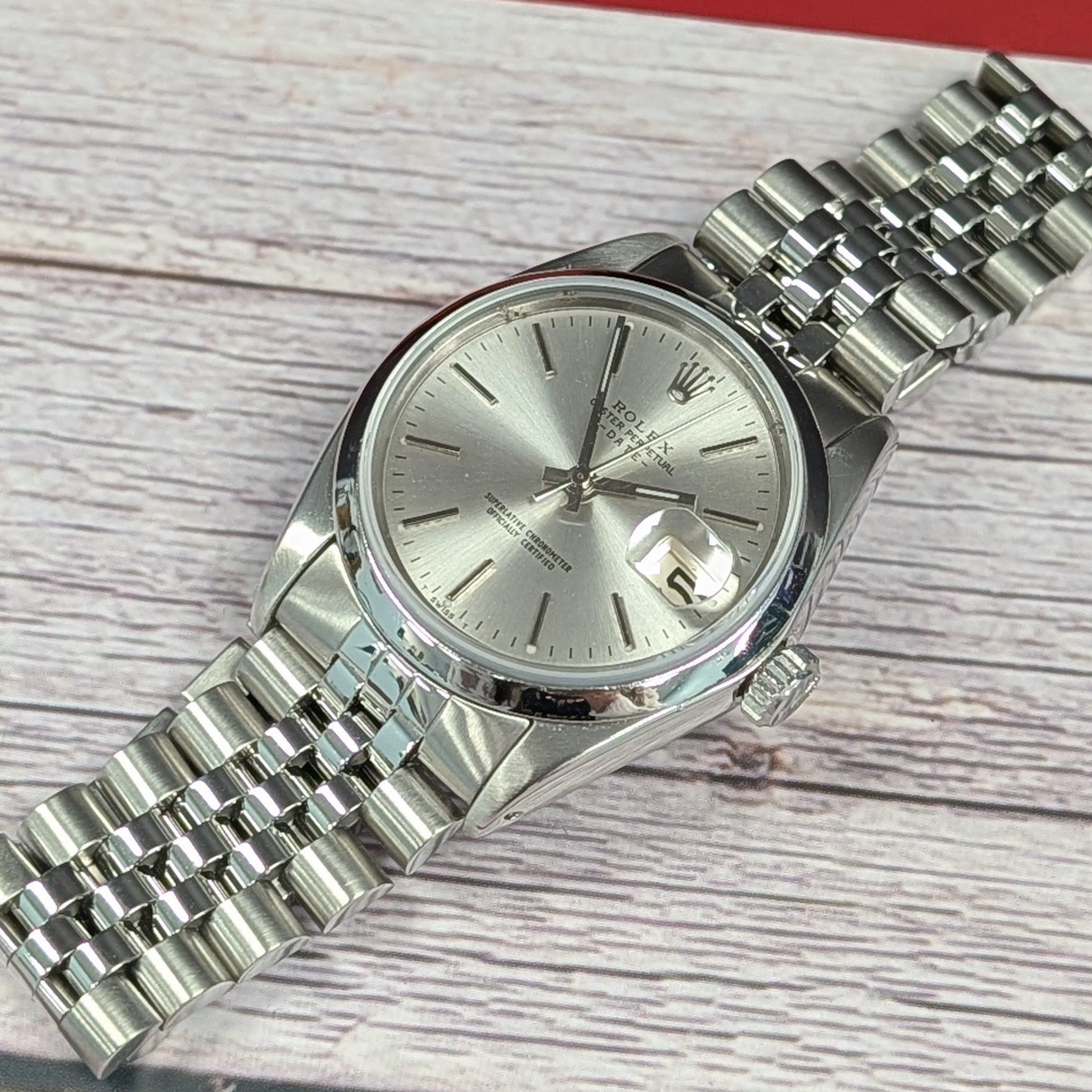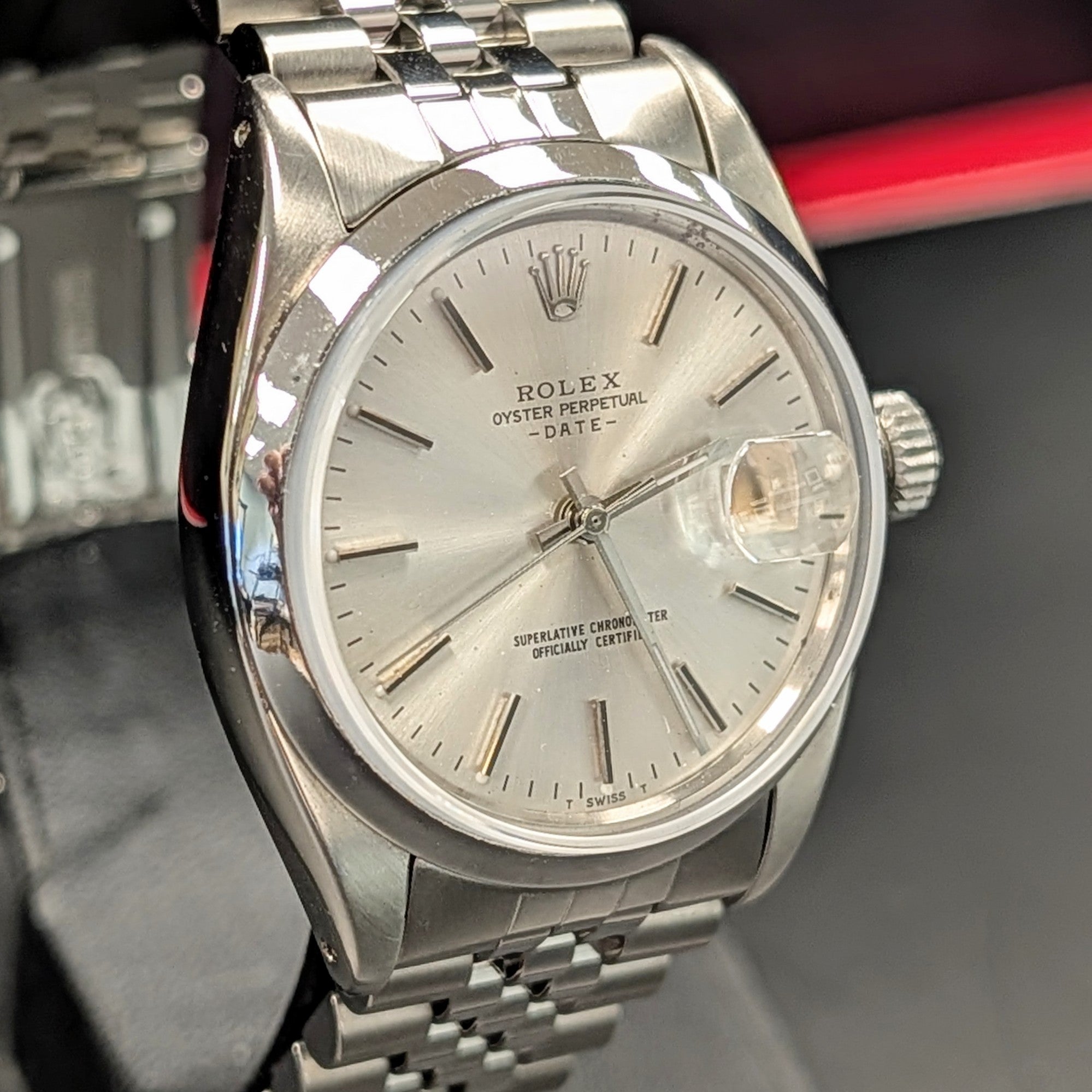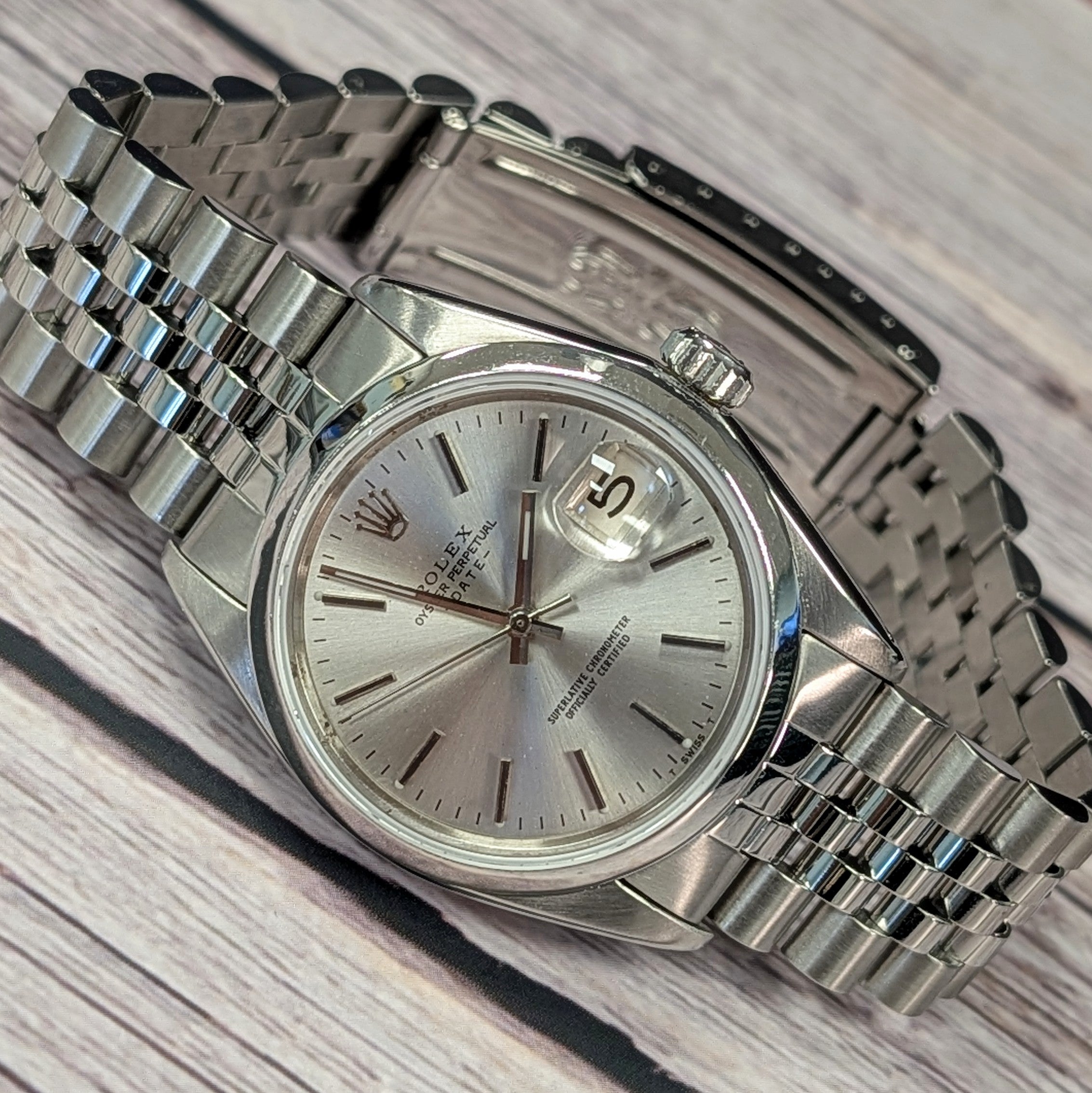 Housed in a 34mm silver-tone stainless steel case with smooth bezel and classic lugs design. The watch features its original signed screw-down crown and robust Oyster case construction. It comes with a Rolex Jubilee bracelet (Ref. 62510H) in stainless steel, offering both comfort and classic style. The watch is in good pre-owned condition with light wear consistent with age, showing a solid case, clean dial, and well-preserved bracelet. Fully inspected and authenticated by our in-house watchmaker, this Rolex Date runs accurately and is ready to wear and enjoy.