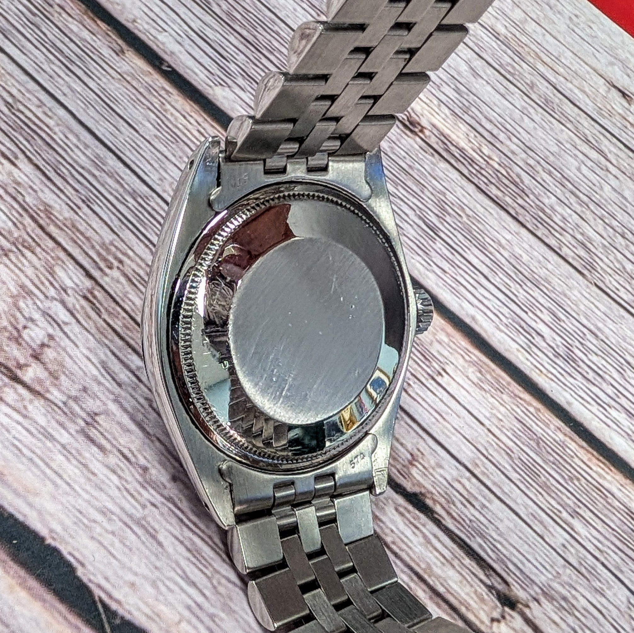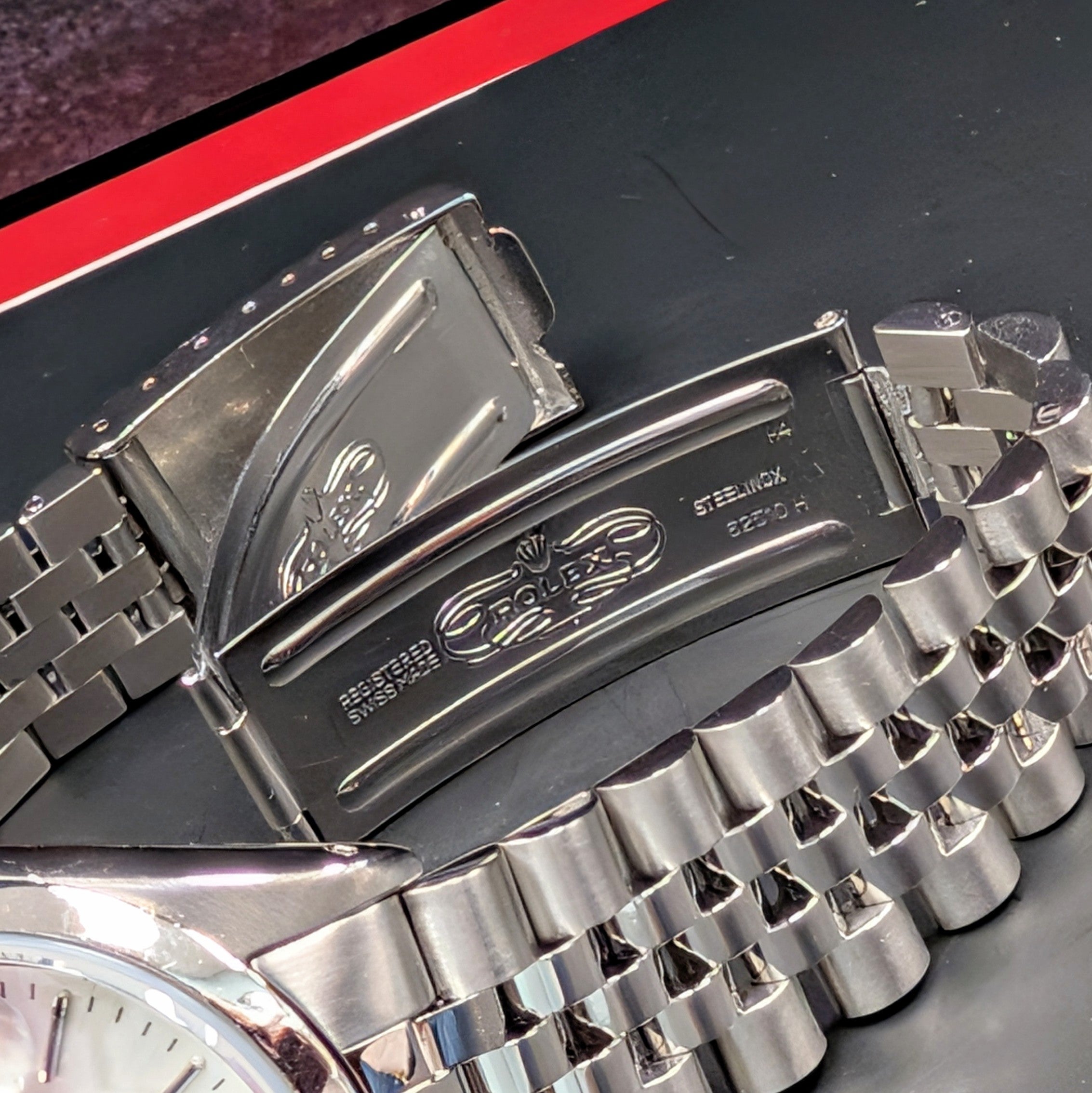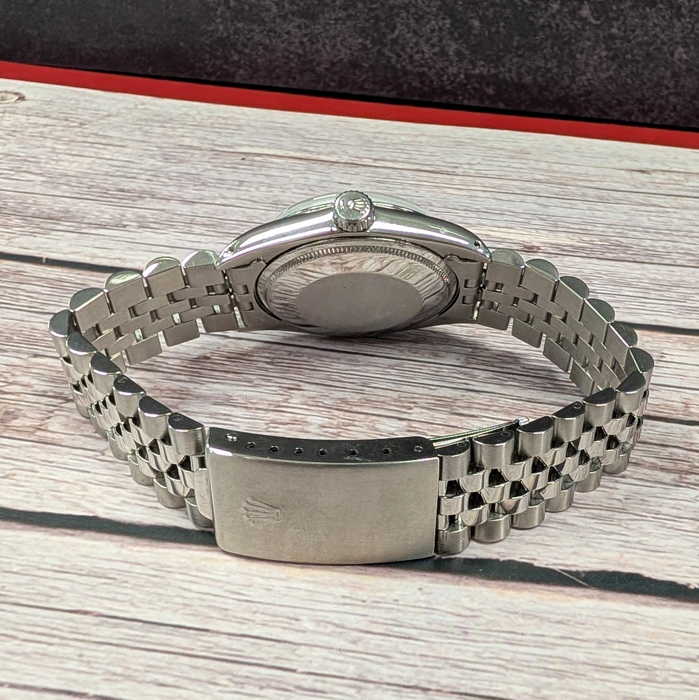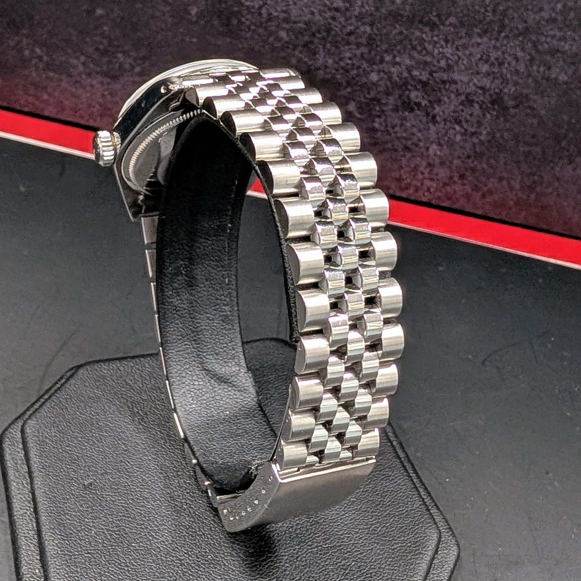 Housed in a 34mm silver-tone stainless steel case with smooth bezel and classic lugs design. The watch features its original signed screw-down crown and robust Oyster case construction. It comes with a Rolex Jubilee bracelet (Ref. 62510H) in stainless steel, offering both comfort and classic style. The watch is in good pre-owned condition with light wear consistent with age, showing a solid case, clean dial, and well-preserved bracelet. Fully inspected and authenticated by our in-house watchmaker, this Rolex Date runs accurately and is ready to wear and enjoy.