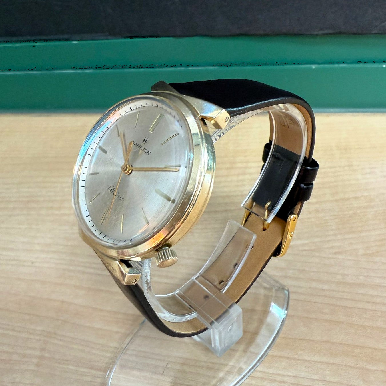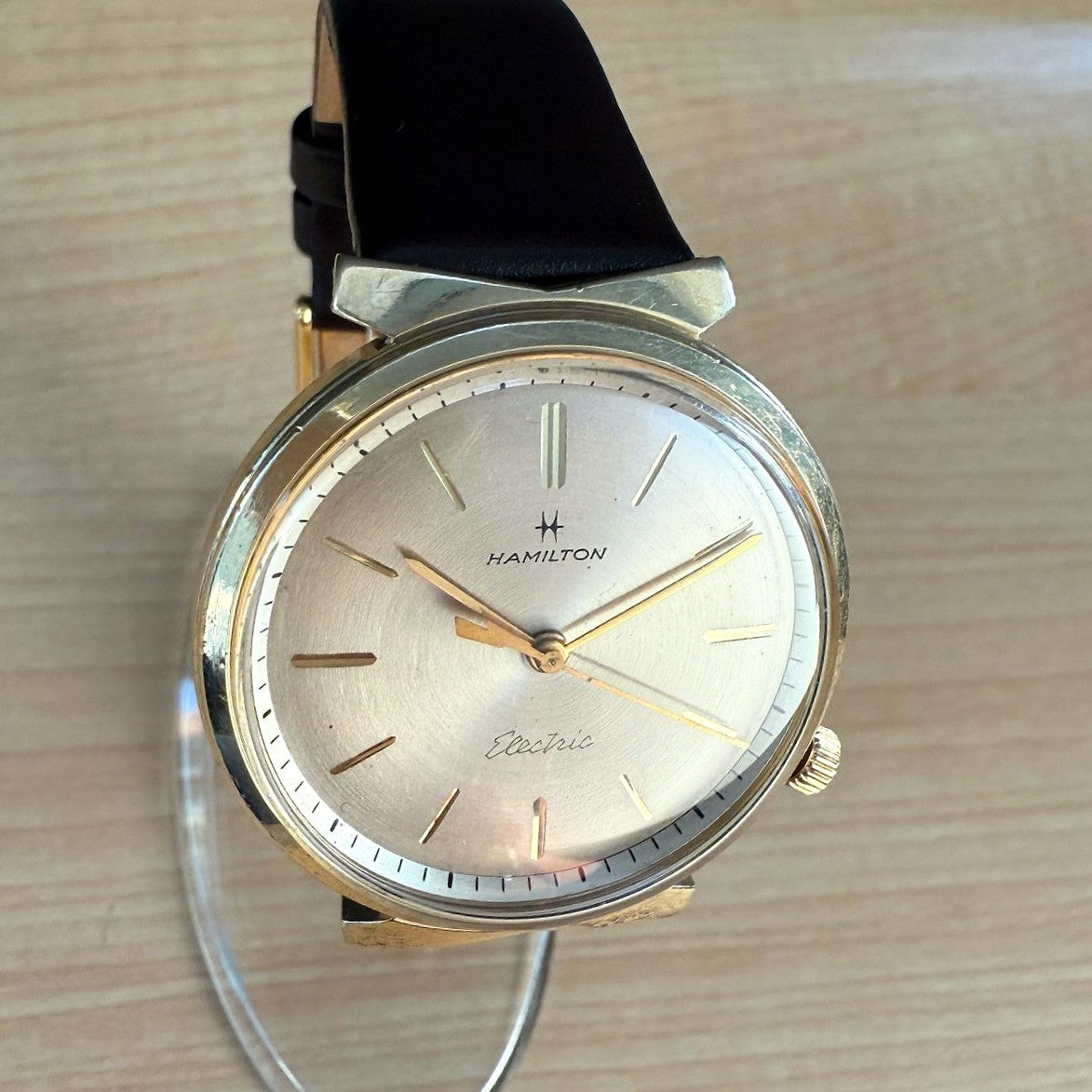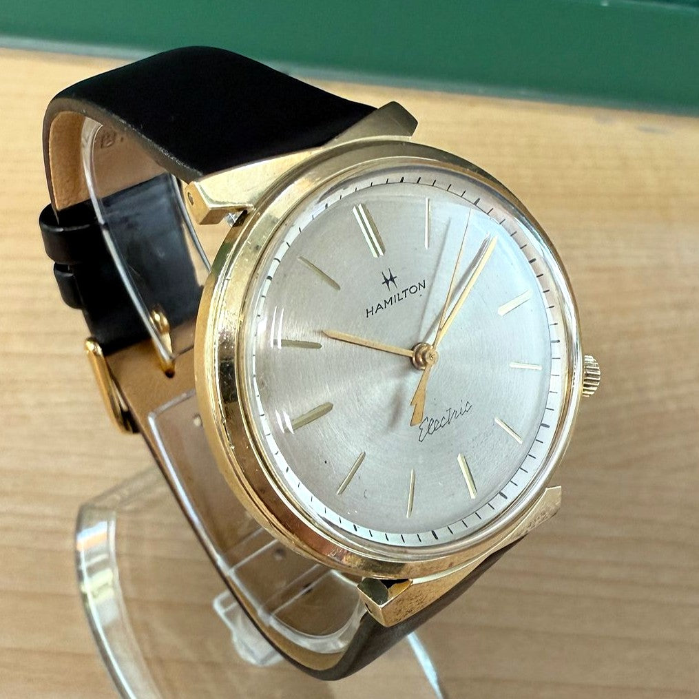 The Hamilton Electric marked a pioneering shift in watchmaking by drawing on an unconventional power source—what the company described as “an energy cell no larger than a shirt button.” Although battery-powered, the movement remained largely mechanical, using no transistors or electronic components, making it a significant precursor to the modern quartz revolution. Development began around 1946 in Lancaster, Pennsylvania under the codename "Project X," but it wasn’t until January 3, 1957, at a press conference held at the Savoy Plaza Hotel in New York City, that Hamilton officially unveiled the world’s first electric watch: the Hamilton Electric 500. Available in a range of bold, asymmetrical case designs, all featured the innovative caliber 500 (or 500A). However, the technology faced challenges—the 500’s delicate electrical contact system proved too fragile, leading to widespread servicing issues and poor acceptance among watchmakers. Rushing to be first to market, Hamilton struggled with early quality control, resulting in many units being returned for adjustments. It wasn’t until 1961, with the release of the improved caliber 505, that many of these problems were addressed, offering a more reliable and serviceable movement.
