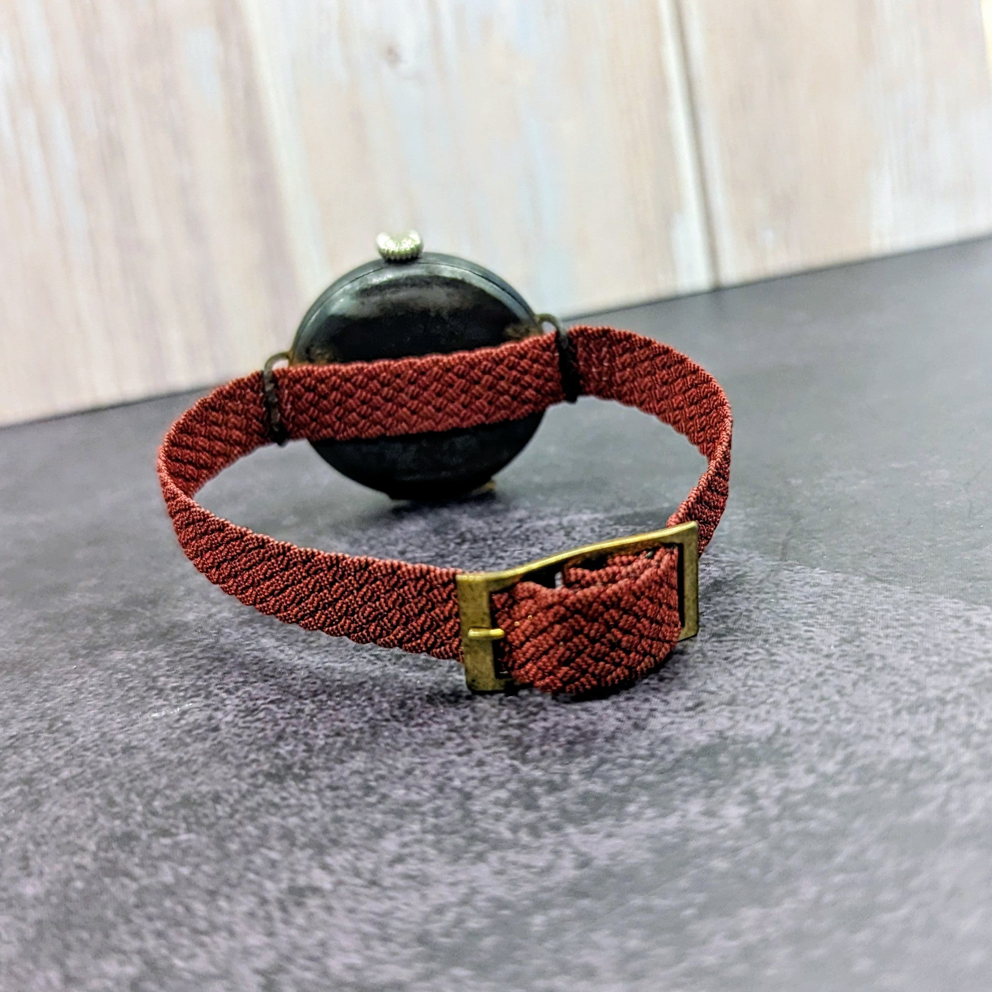 The watch is housed in a round “gunmetal” case with wire lugs and a snap-on back, typical of World War I-era trench watches. The crown is onion-shaped and manually wound. The case shows oxidation and surface wear consistent with age. It is coming with a red nylon one-pice strap. The watch is currently Running and serviced on 09/2025.