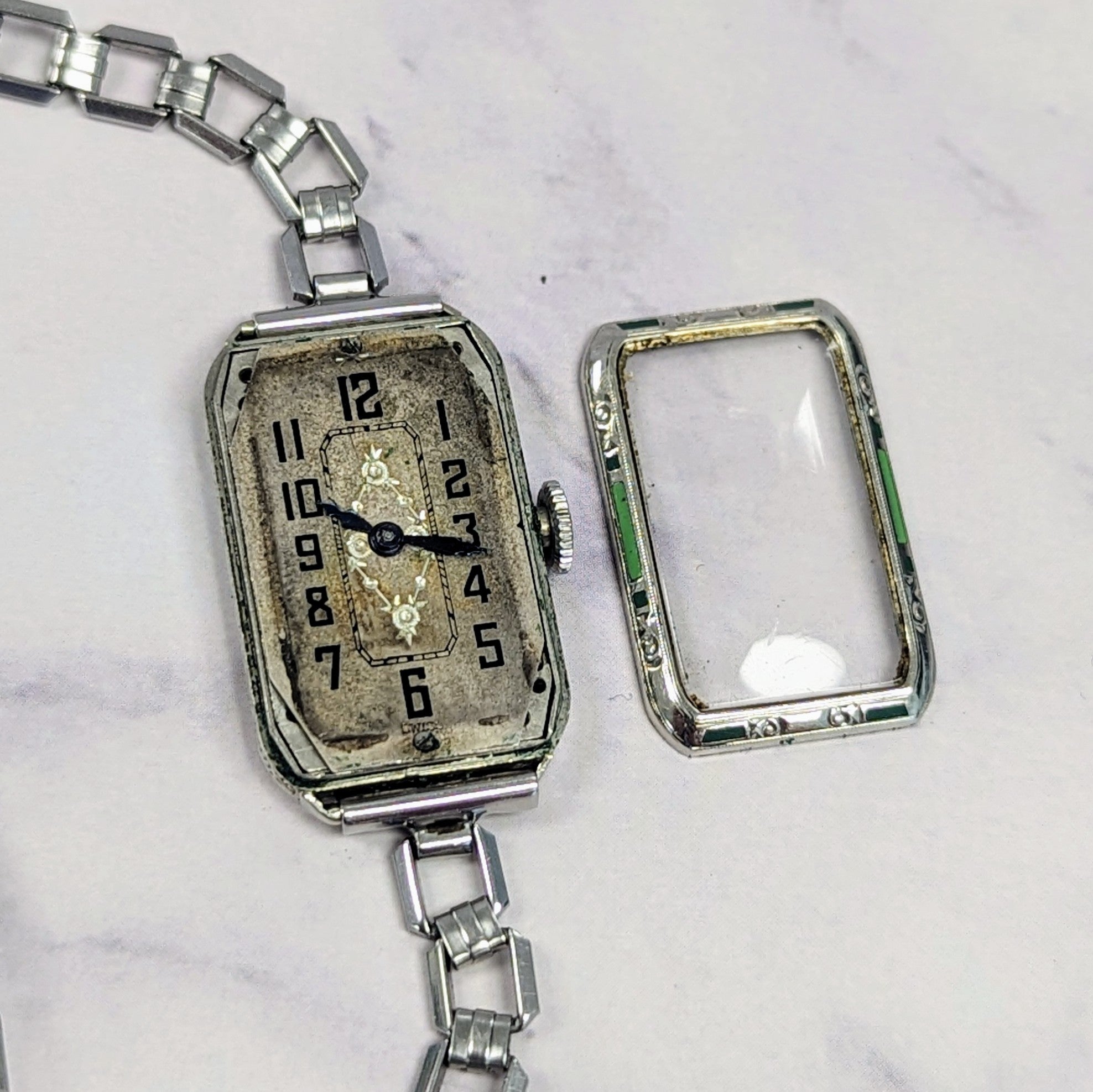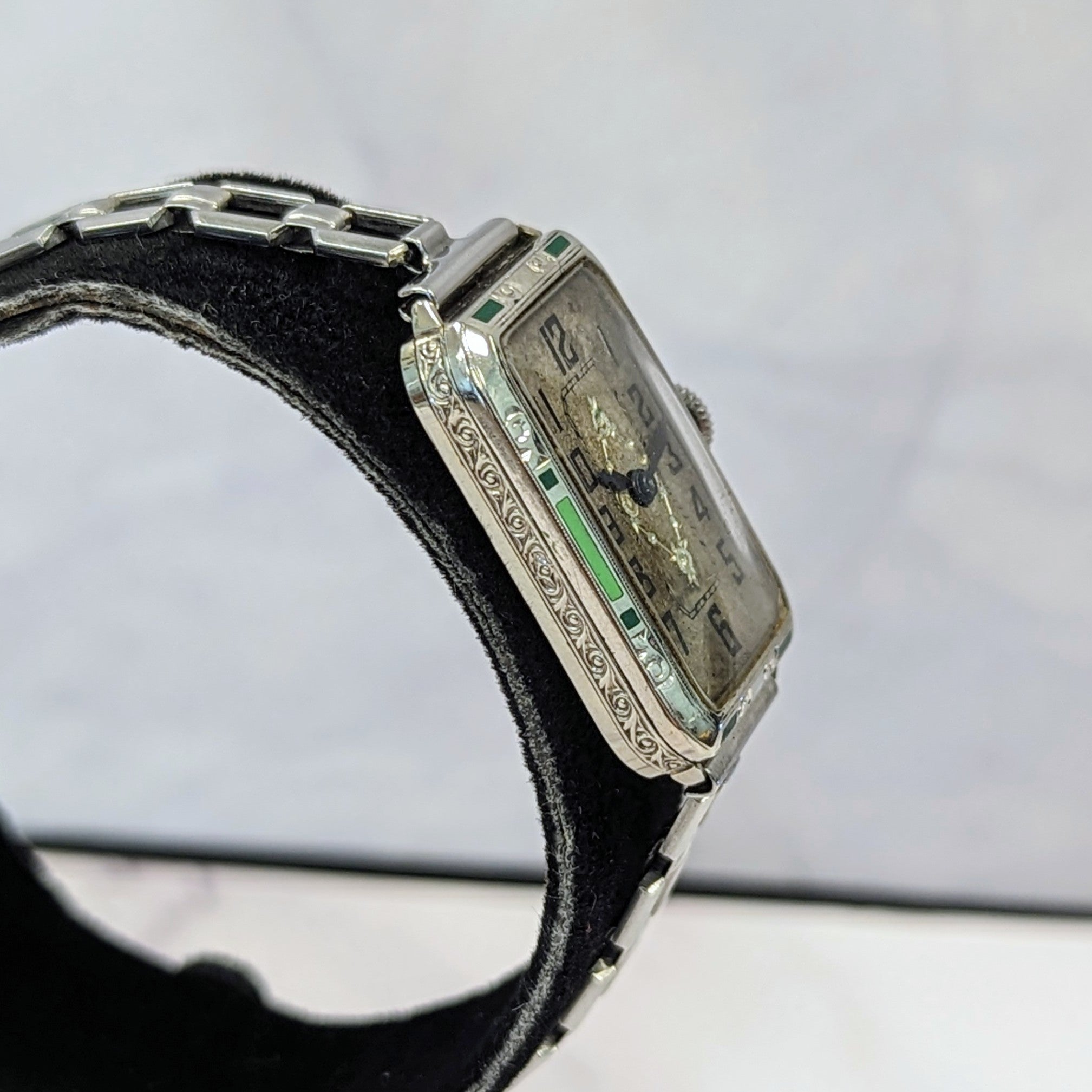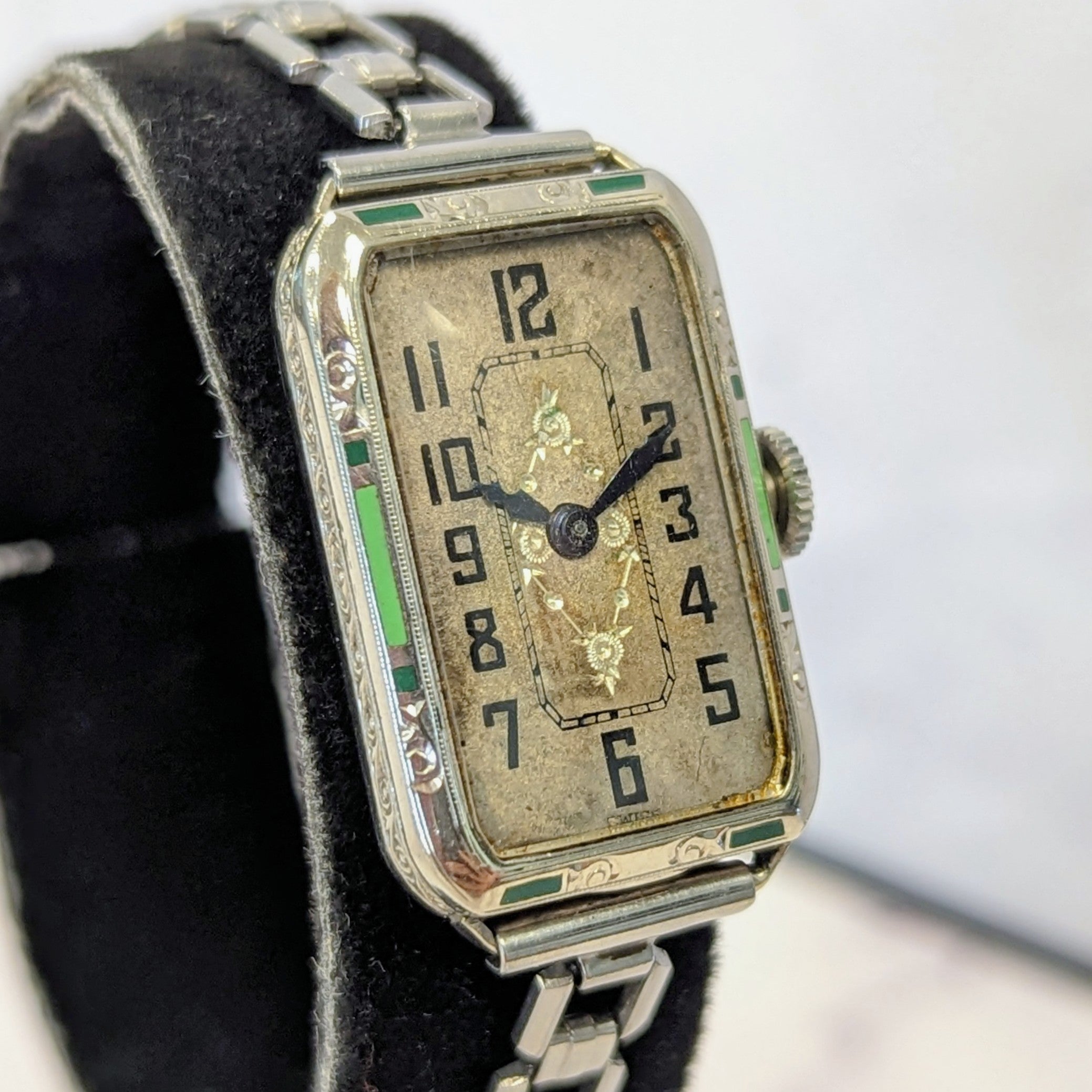 1932 ELGIN Art Deco Ladies Watch Grade 484 Black & Green Enamel Tank Case 15J
