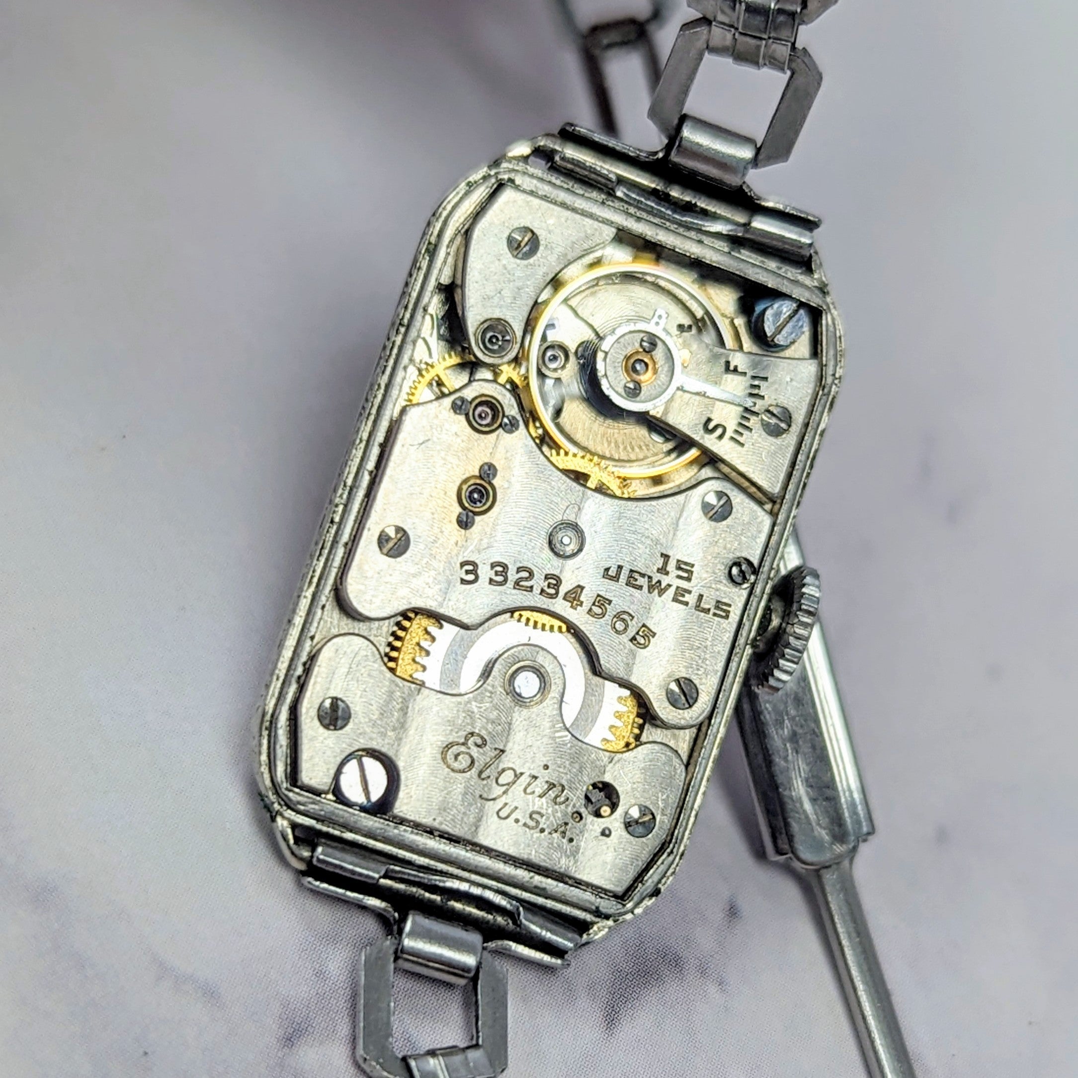 This is a vintage Elgin Art Deco ladies mechanical wristwatch, dated from 1932. It is a manual-wind watch powered by an original Elgin Watch Co. mechanical movement caliber grade 484, featuring 15 jewels, size 18/0s and model 1. It operates at 18,000 vibrations per hour with an approximate 35-hour power reserve. Made in United States.