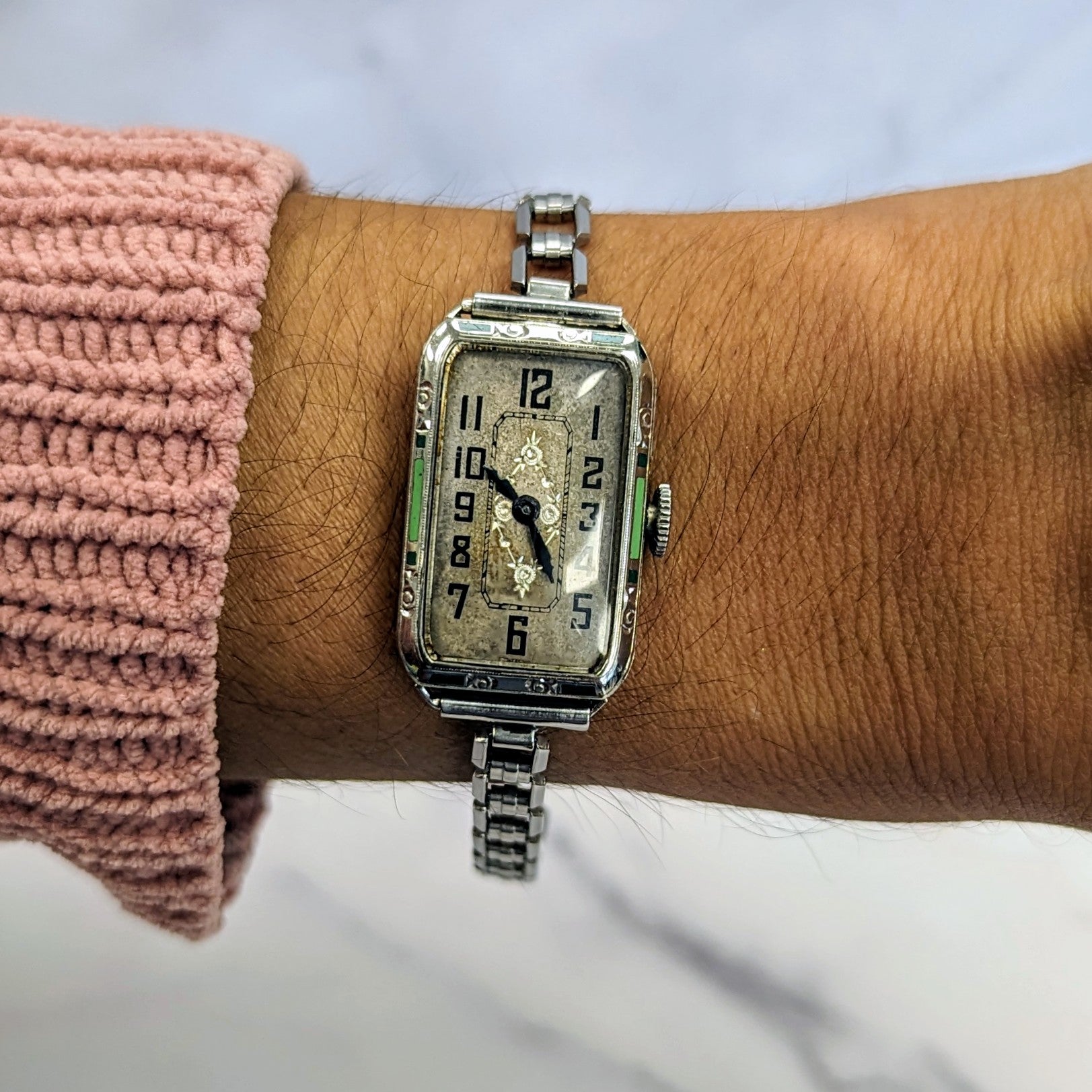 Cased in a 17.2x26.5mm black and green enamel tank case with integrated lugs design, crafted in 14K white gold filled. It features a engraved finish and is paired with the original stainless steel bracelet. This timepiece presents well with signs of honest aging. Fully inspected and authenticated. Running and wearable.