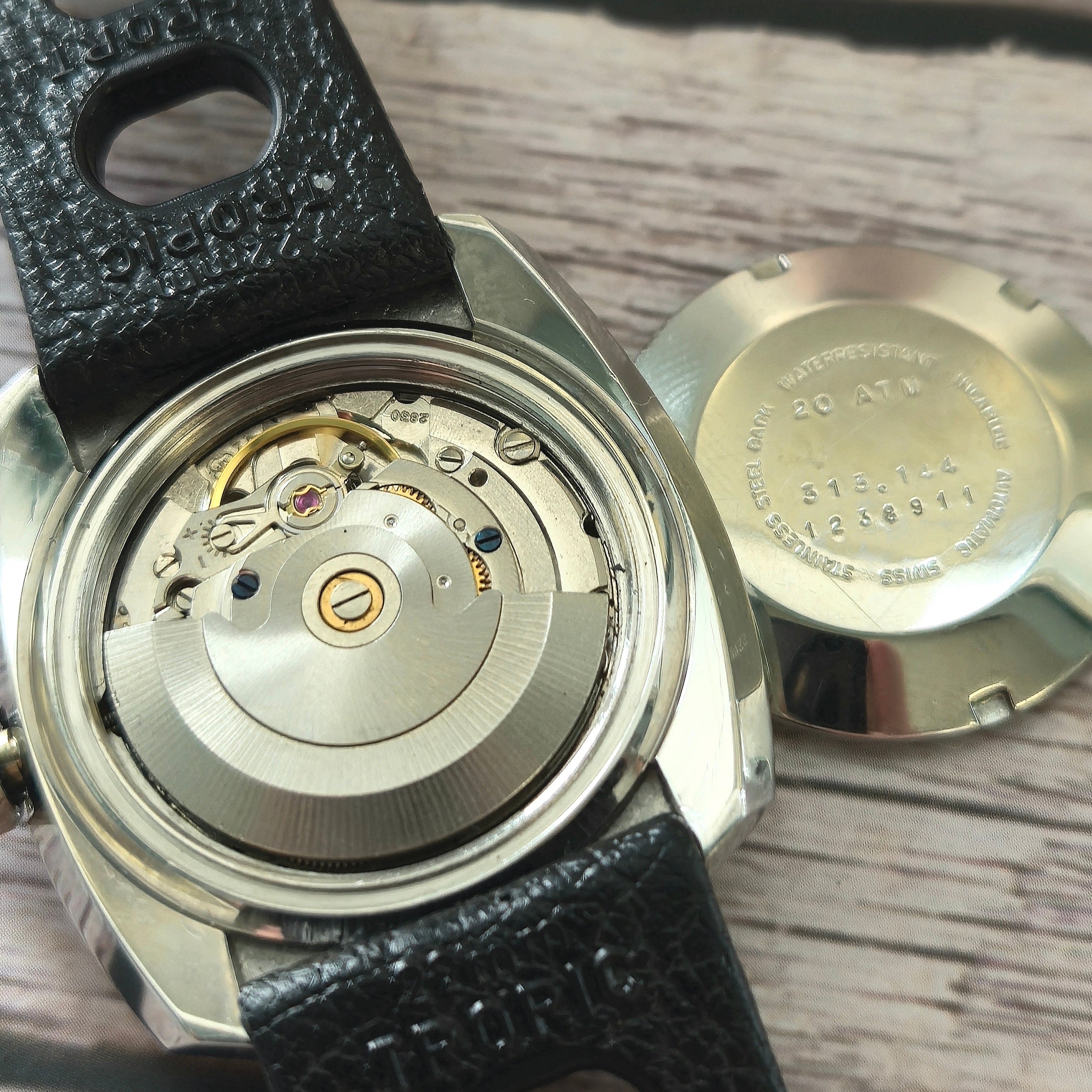 - Case Back Markings: Stainless Steel Back Water Resistant 20 ATM Incabloc Automatic Swiss 313.144 1238911