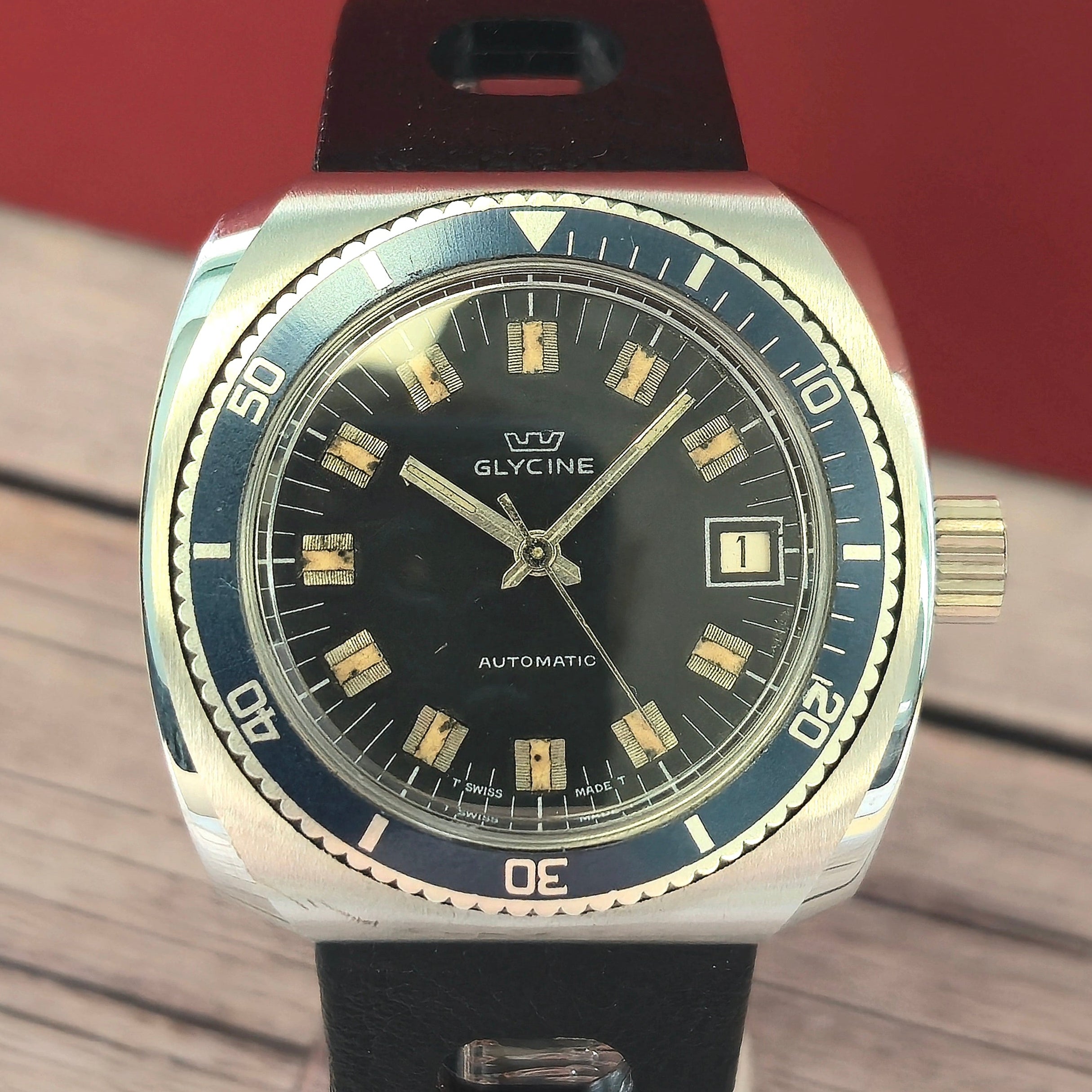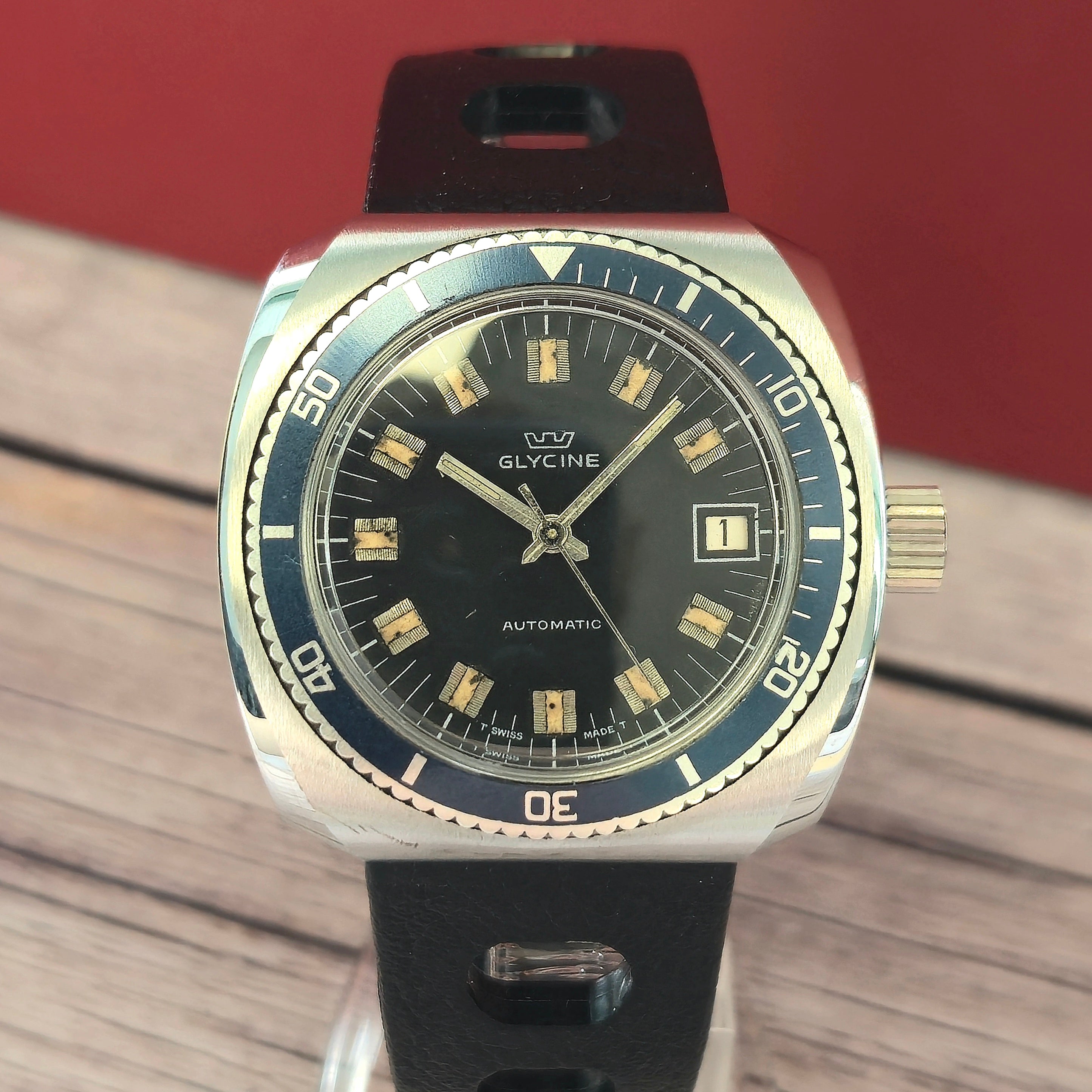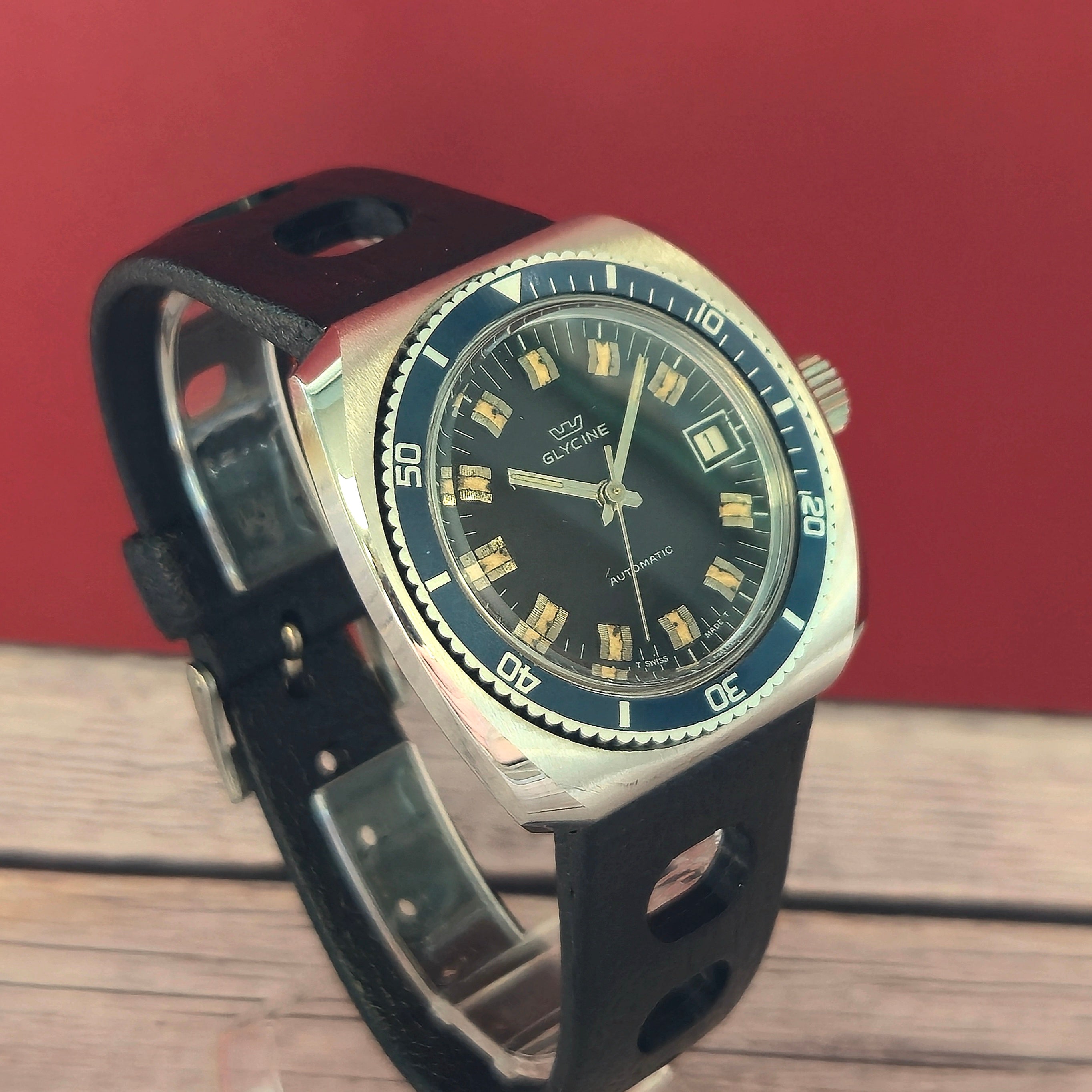 Cased in a 38mm cushion stainless steel case back with brushed/polished finish, integrated lugs design and a blue bi-directional rotating bezel. It comes on a black rubber two-piece strap. It remains in very good vintage condition consistent with age. It is ready to wear and enjoy.