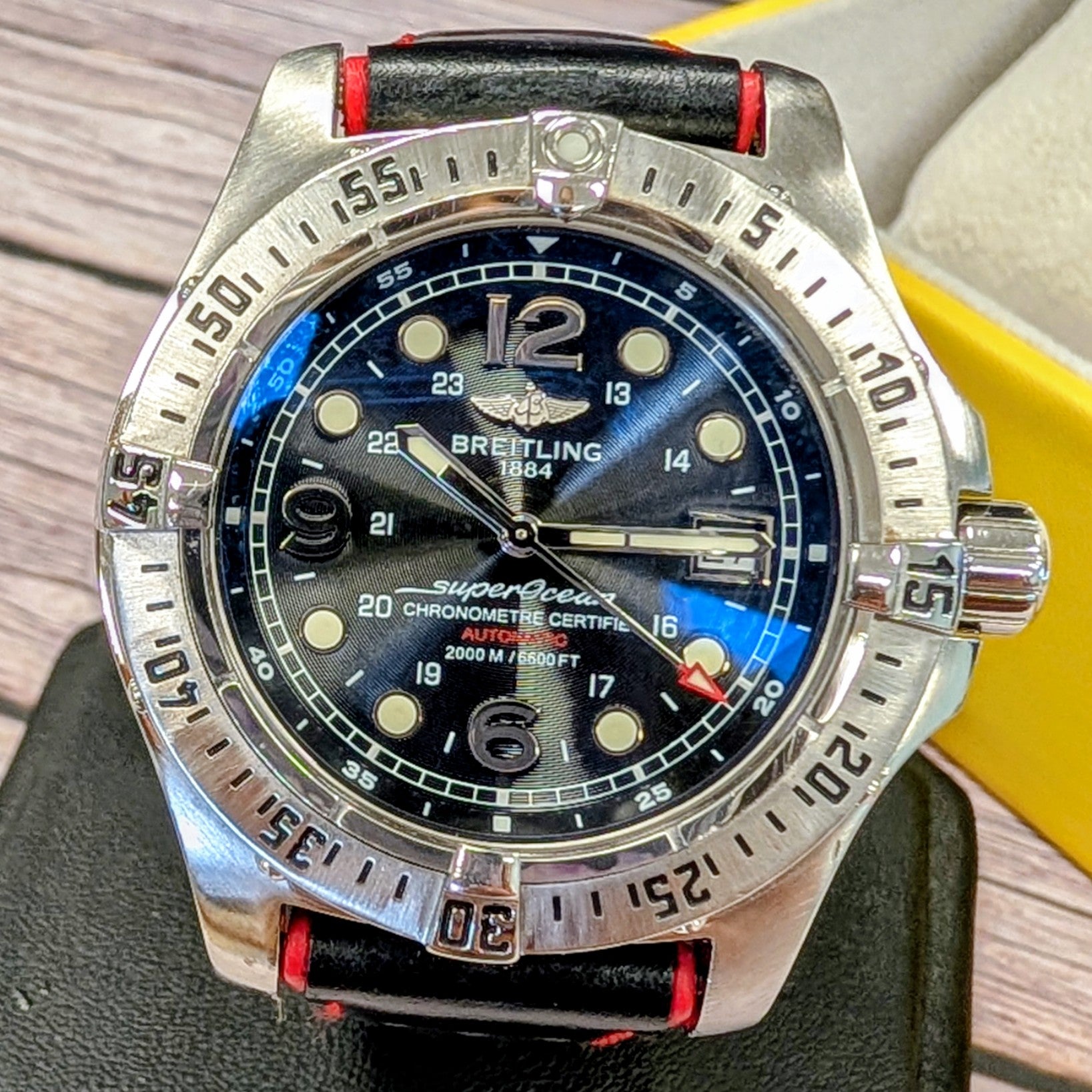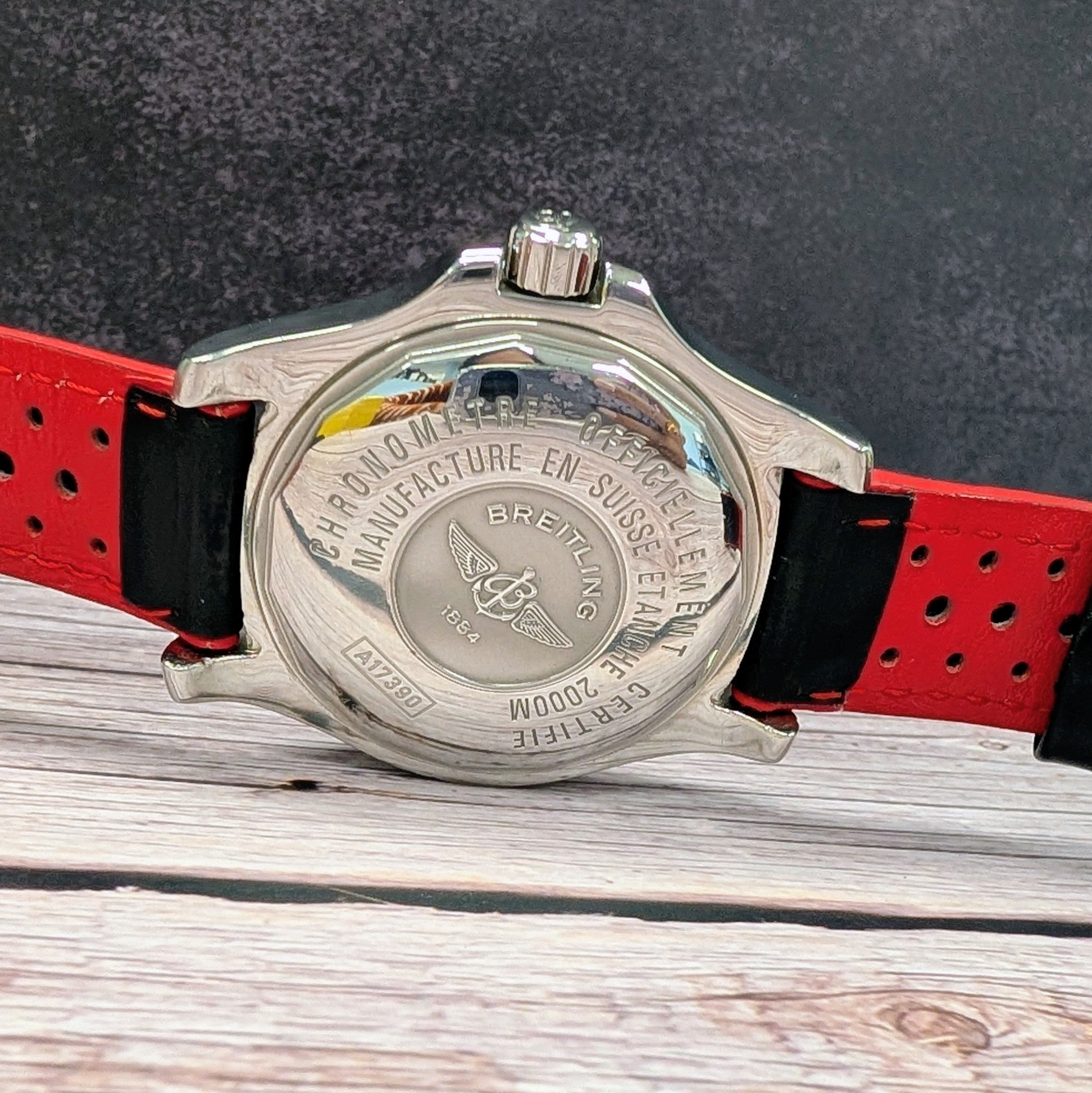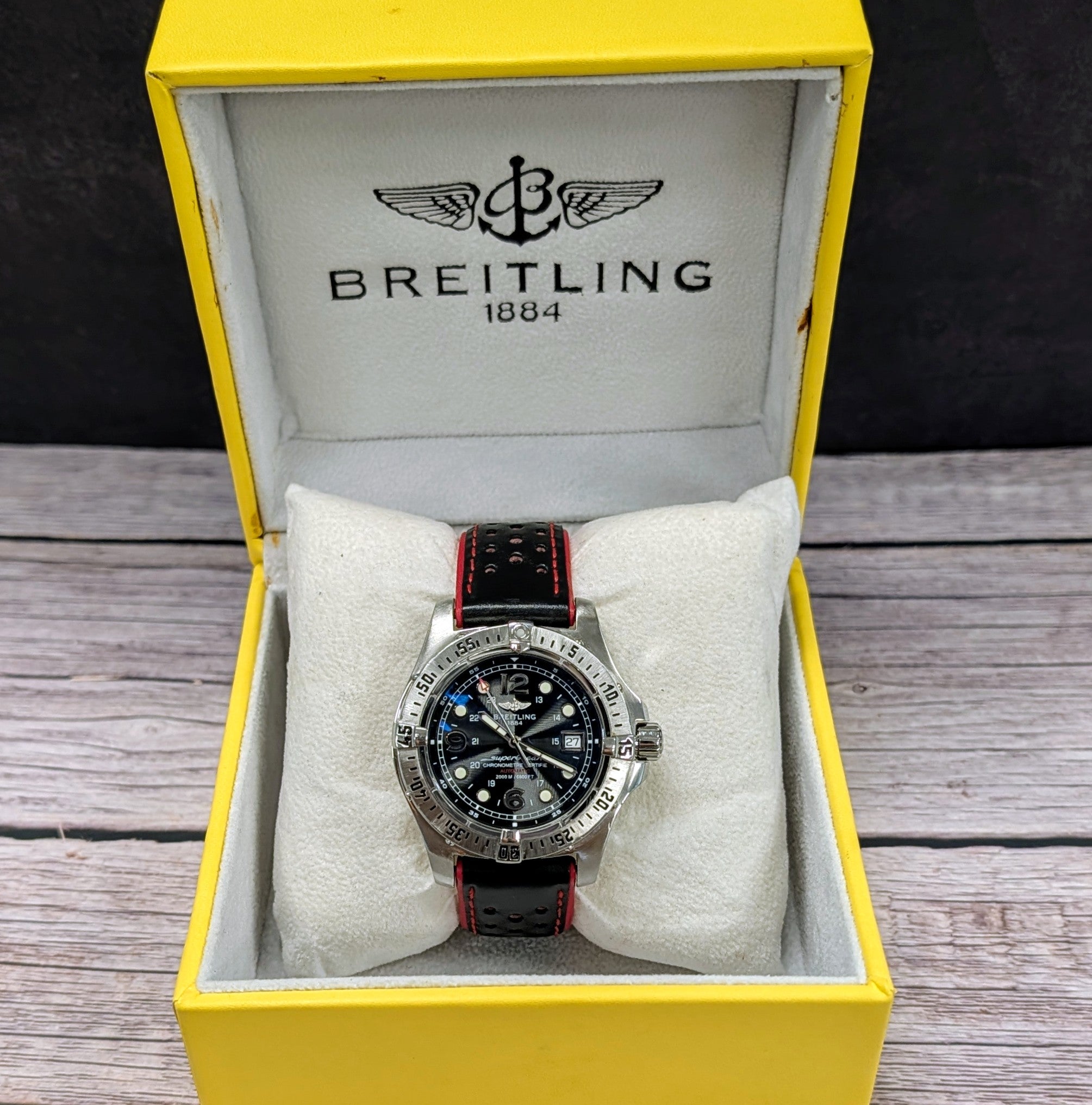 The watch is coming with a black and red leather strap and in a Breitling box. Fully inspected and authenticated by our in-house watchmaker, this timepiece runs accurately and is ready to wear and enjoy.