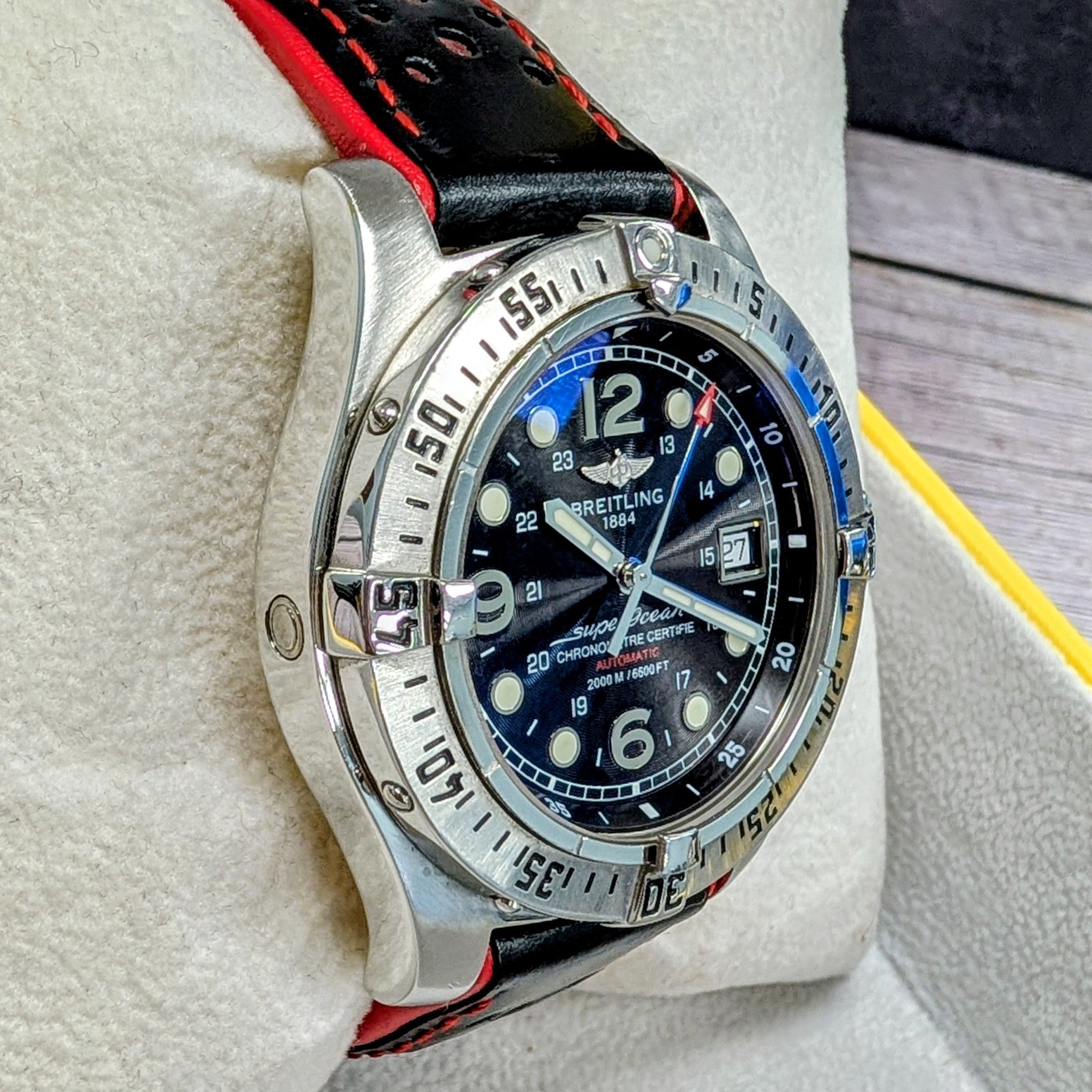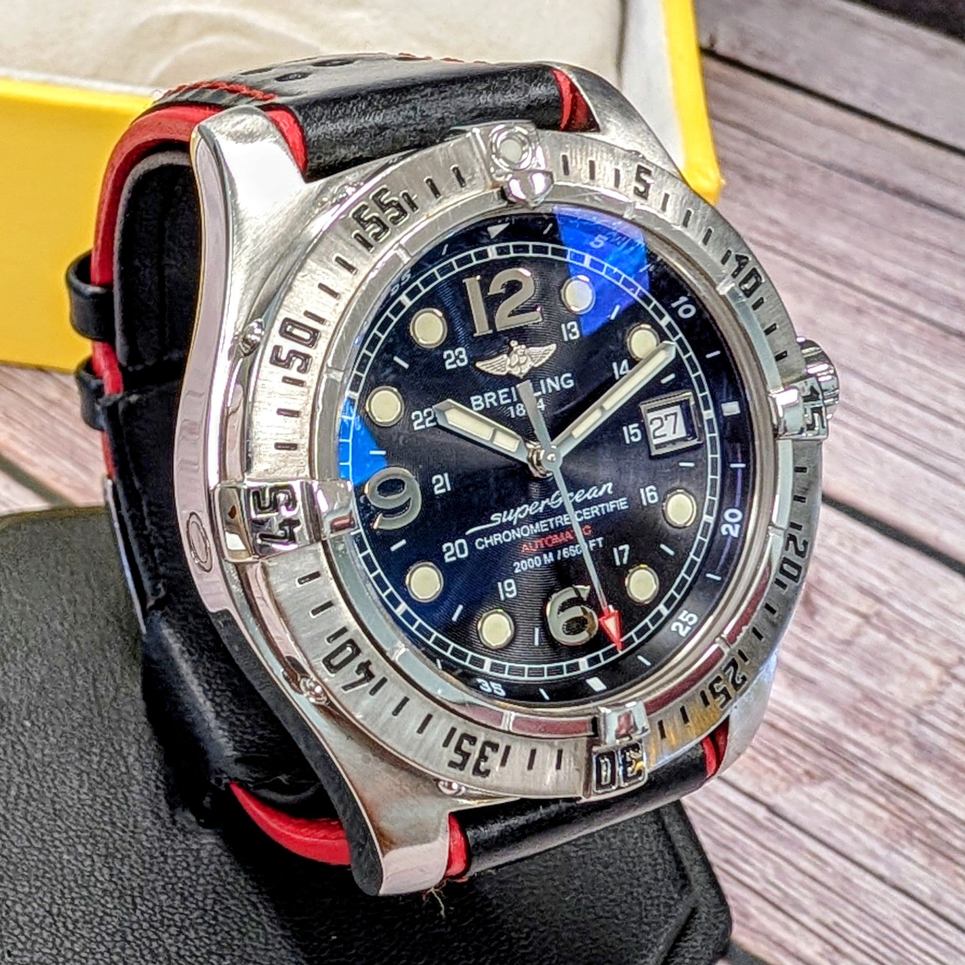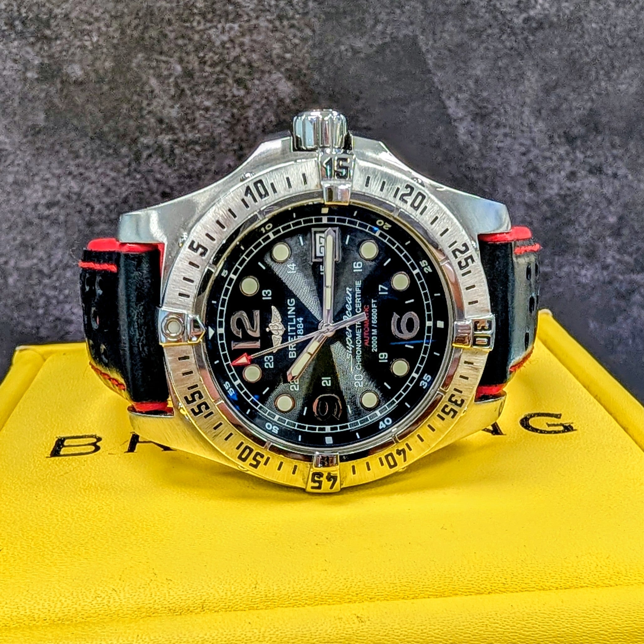 The watch is coming with a black and red leather strap and in a Breitling box. Fully inspected and authenticated by our in-house watchmaker, this timepiece runs accurately and is ready to wear and enjoy.