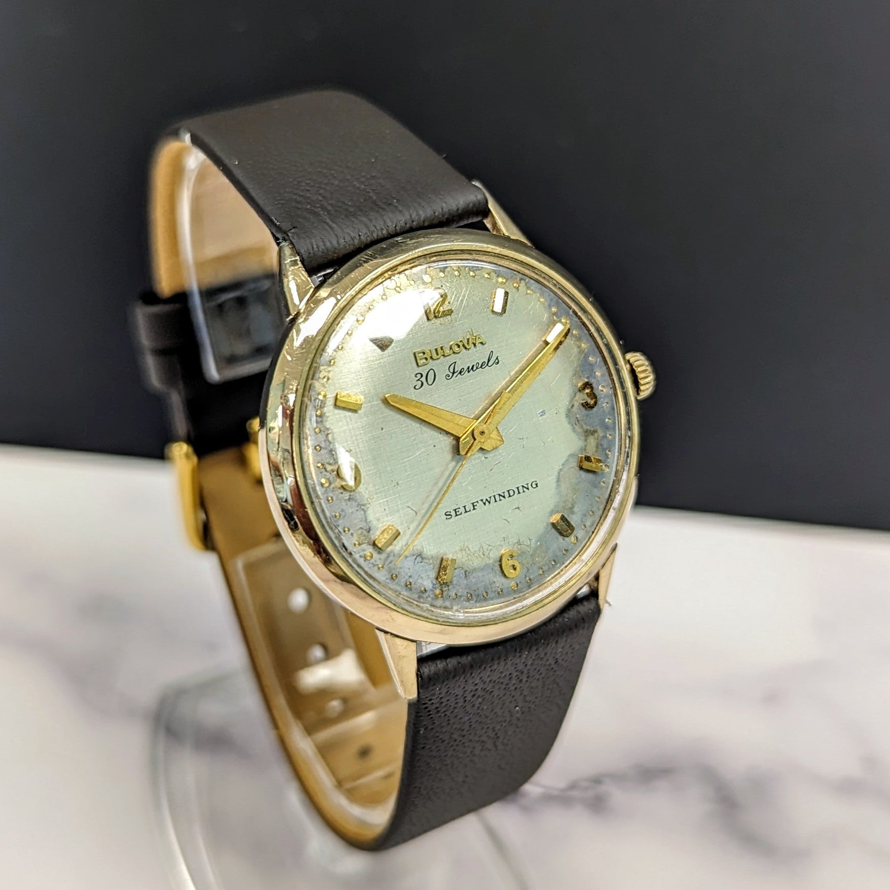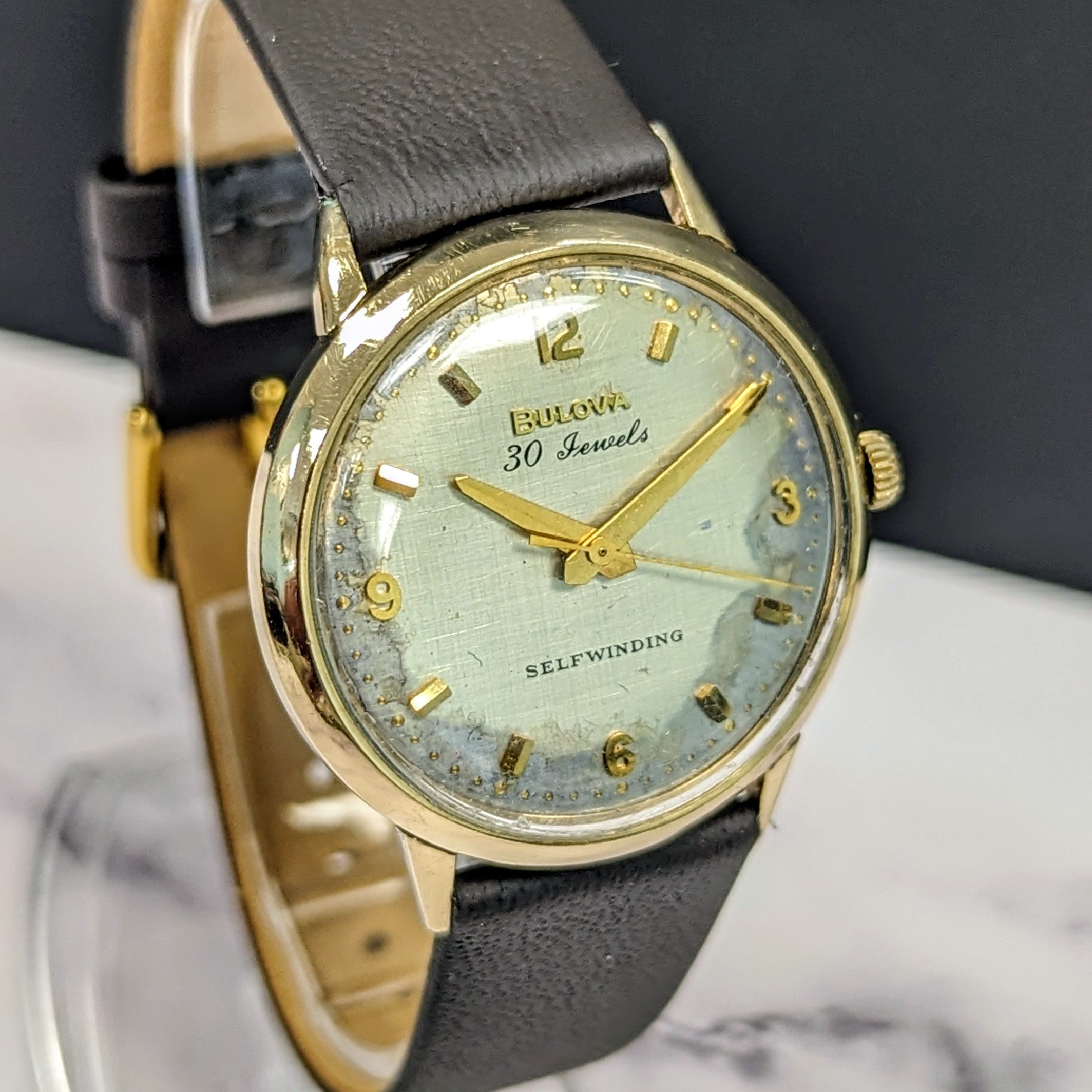 - Features: Applied gold indices with Arabic numerals, outer minute track, and gold-tone dauphine hands. The dial is showing a bit of charming patina and age.