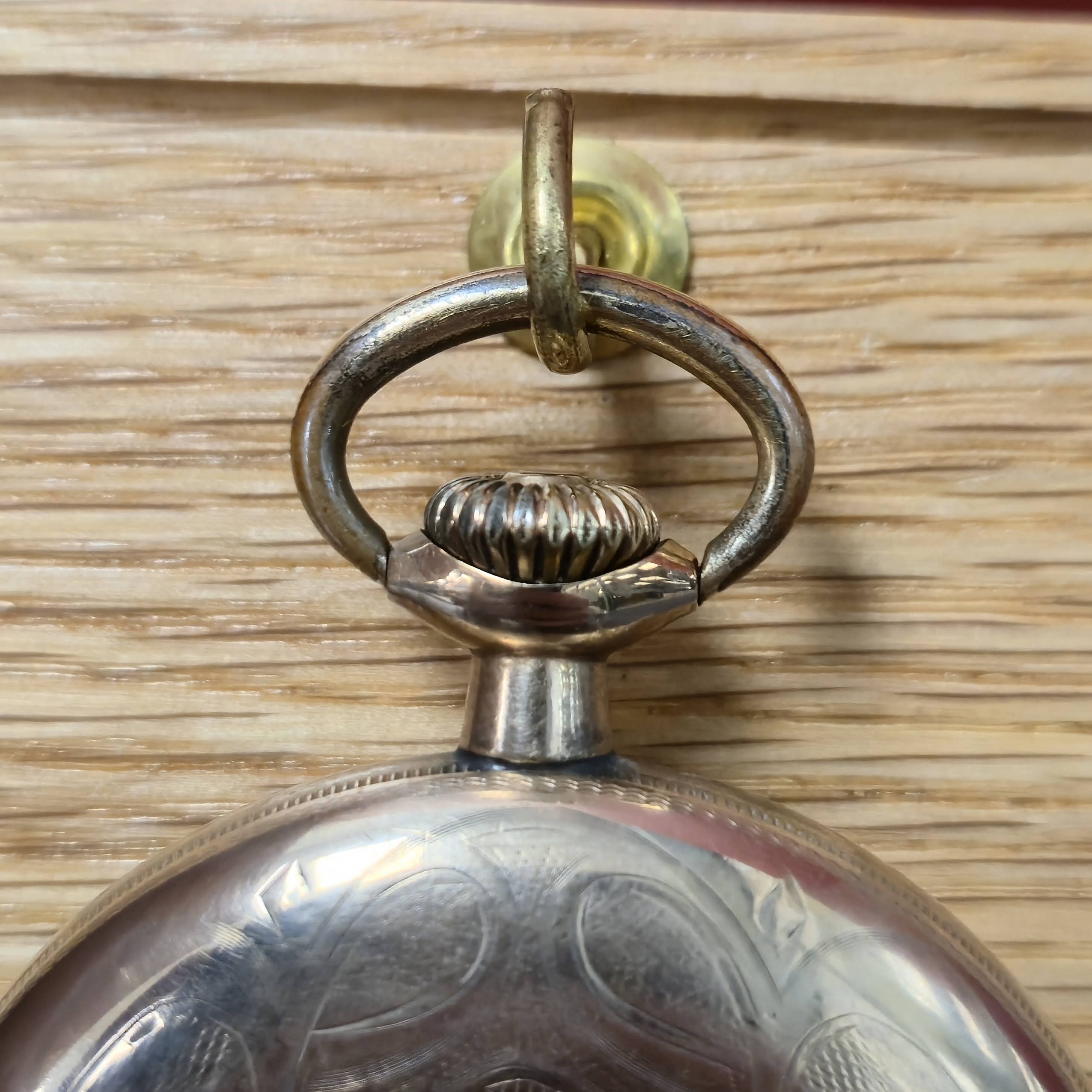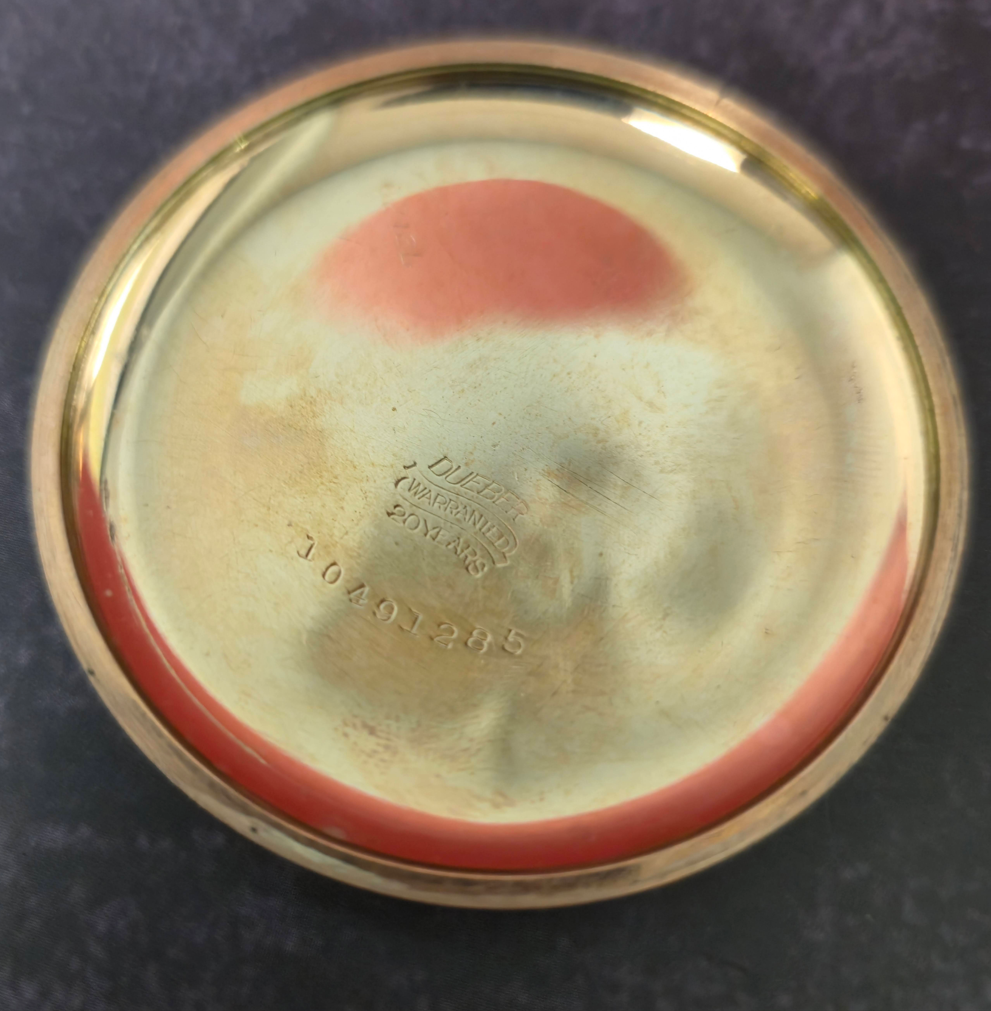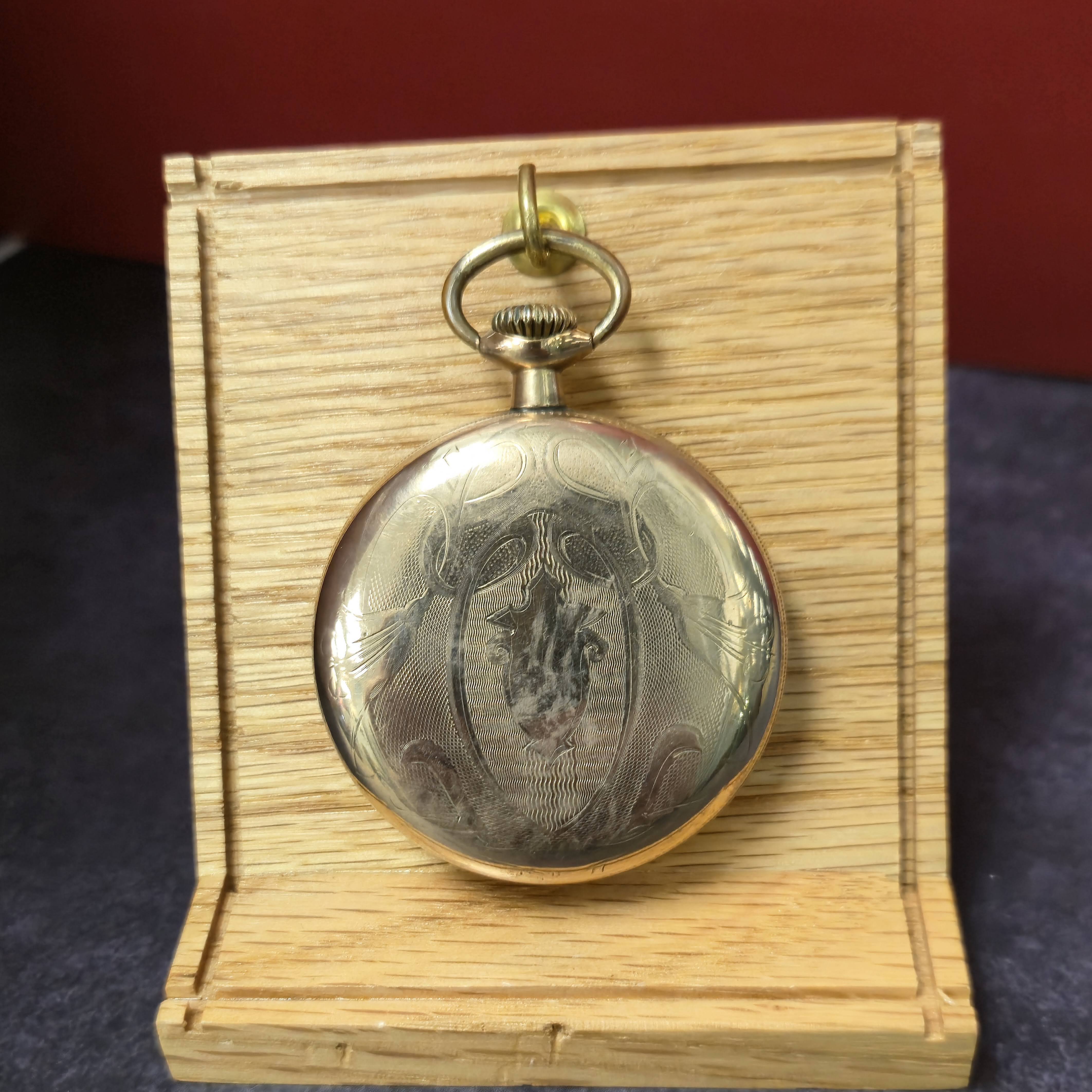 The watch is housed in a 49mm round 10K yellow gold filled case with engraved finish and smooth bezel, paired with a classic bow and onion-style crown — a typical design.