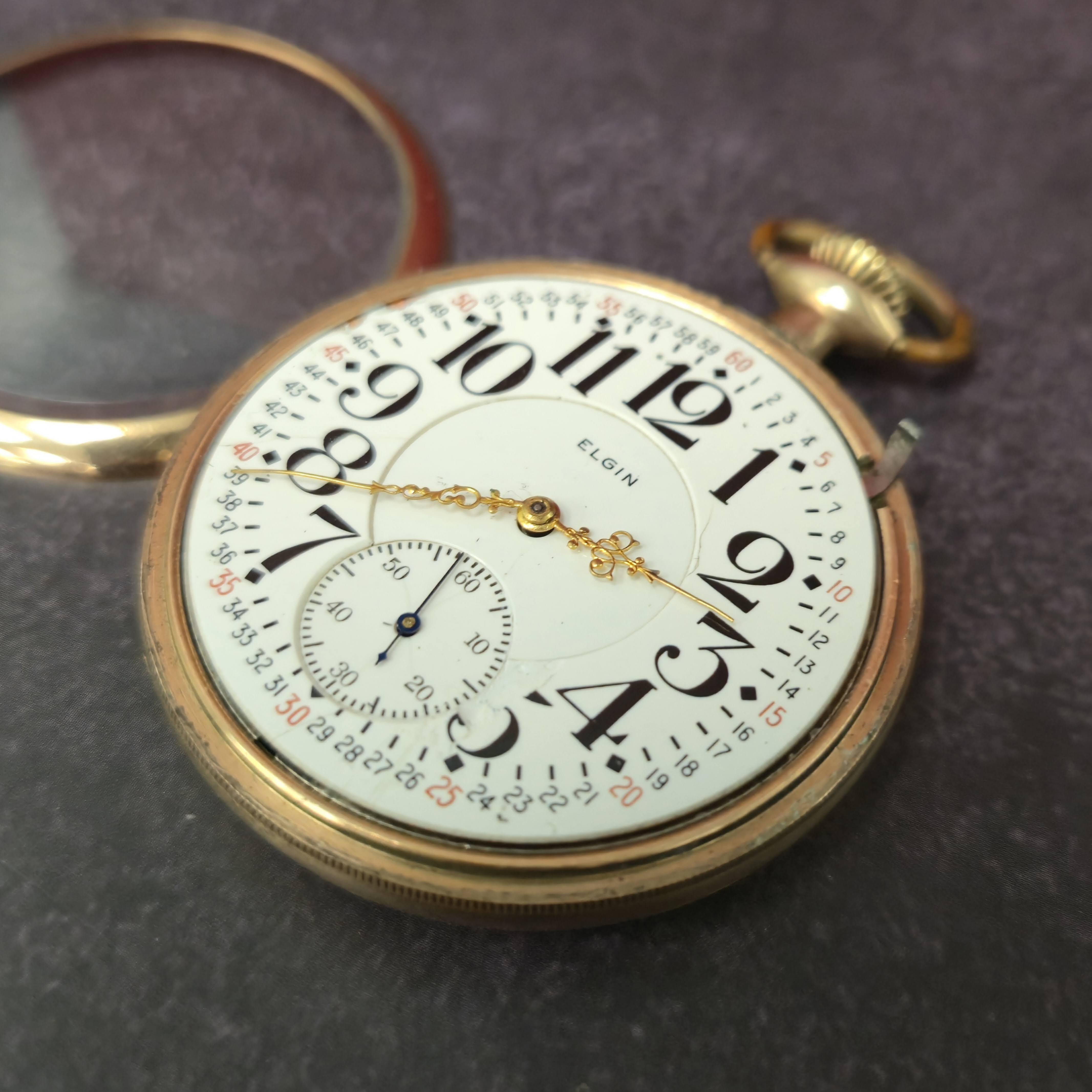 This is a vintage Elgin pocket watch, a classic American timepiece dating to 1919, featuring a white enamel dial with elegant Arabic numerals, a bold/red minute track, and a small seconds sub-dial at 6 o’clock. It has an elegant ornate gilt hands in a classic filigree (Louis XV-style) design.
