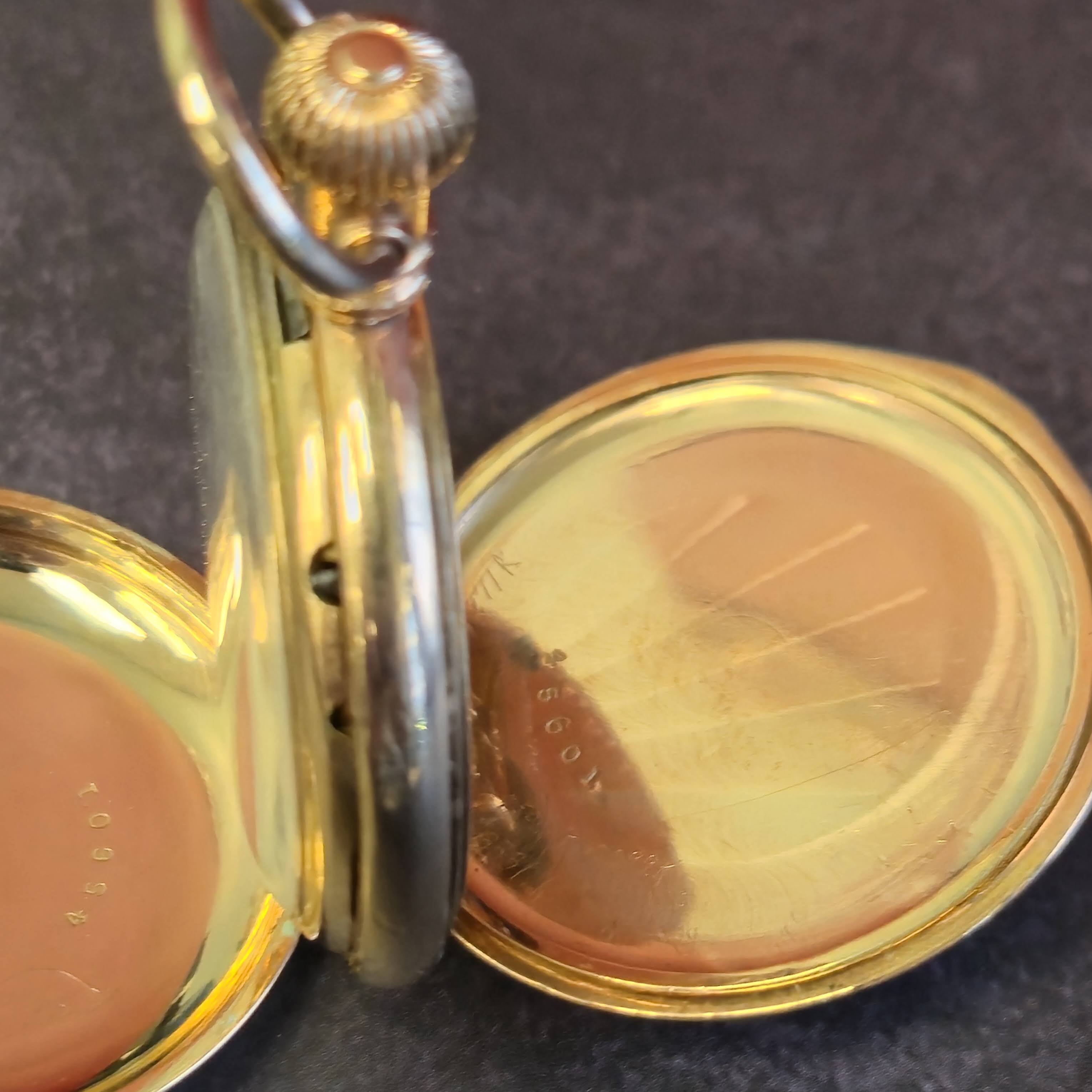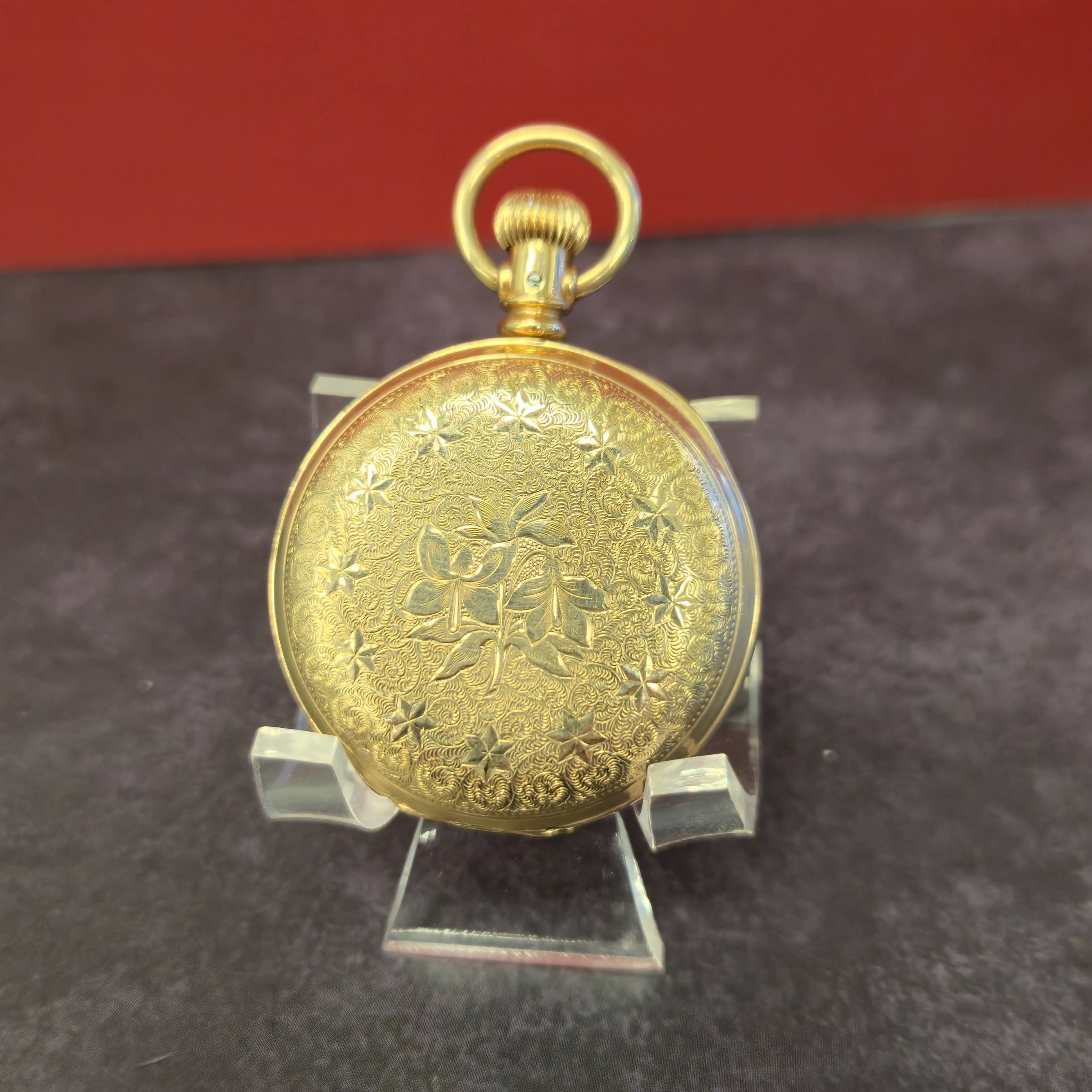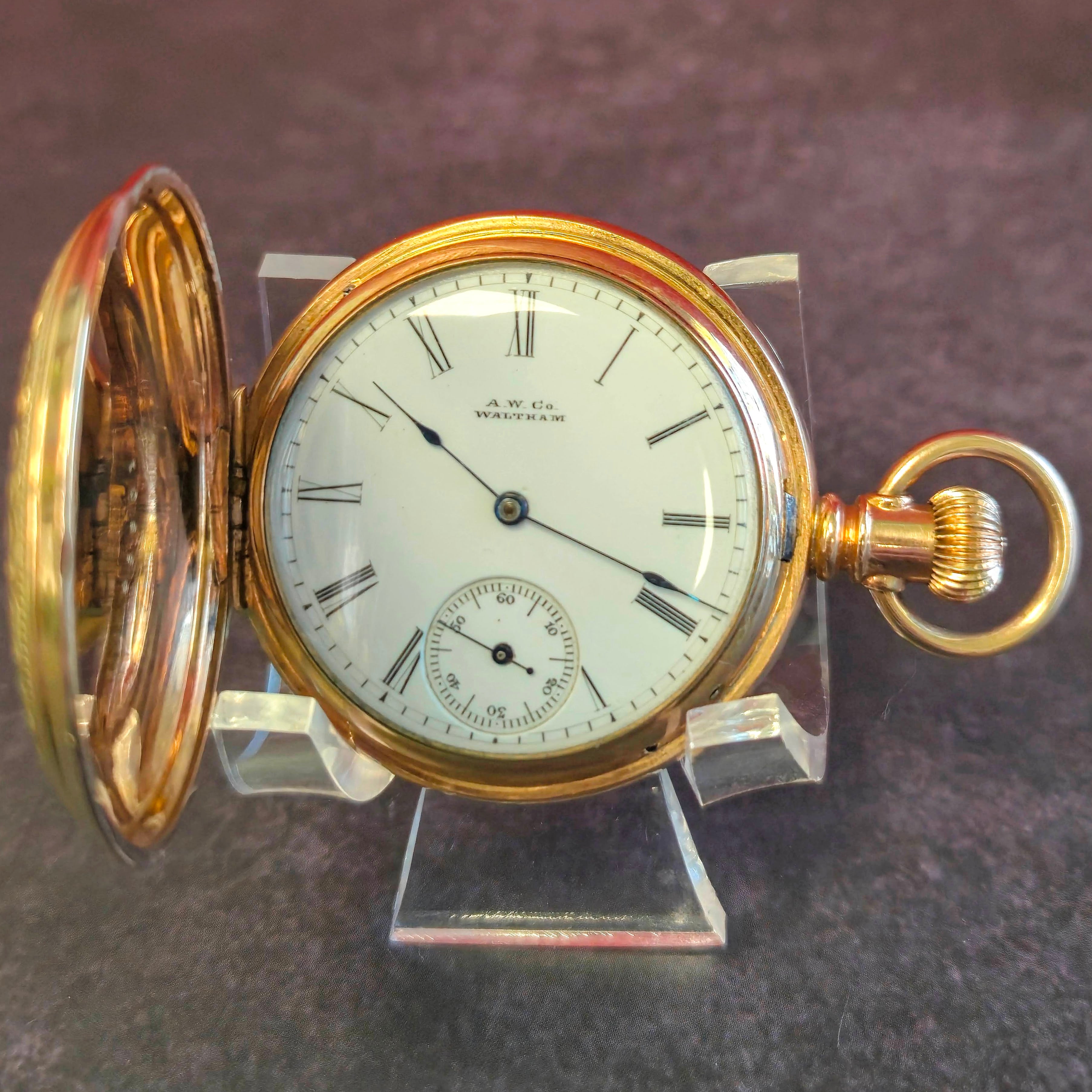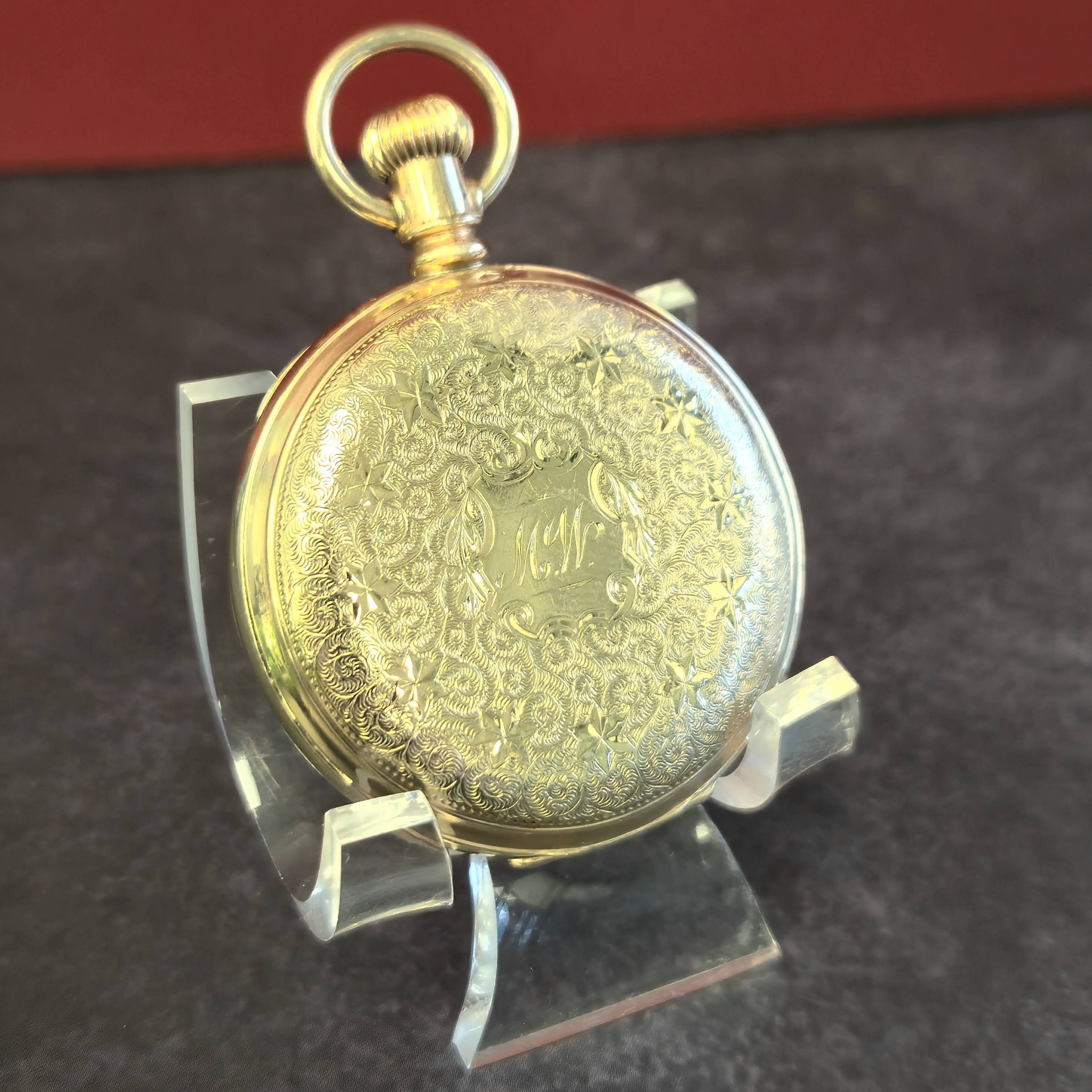 It is a manual-wind pocket watch powered by the original Waltham Watch Co. mechanical movement grade Wm. Ellery with 11 jewels, size 6s, model 1873, small second hand, featuring a lever-set function and made in the United States. The gold-tone 40mm round gold filled hunter case with engraved details and double-hinged back. It is paired with a classic bow and onion-design crown.