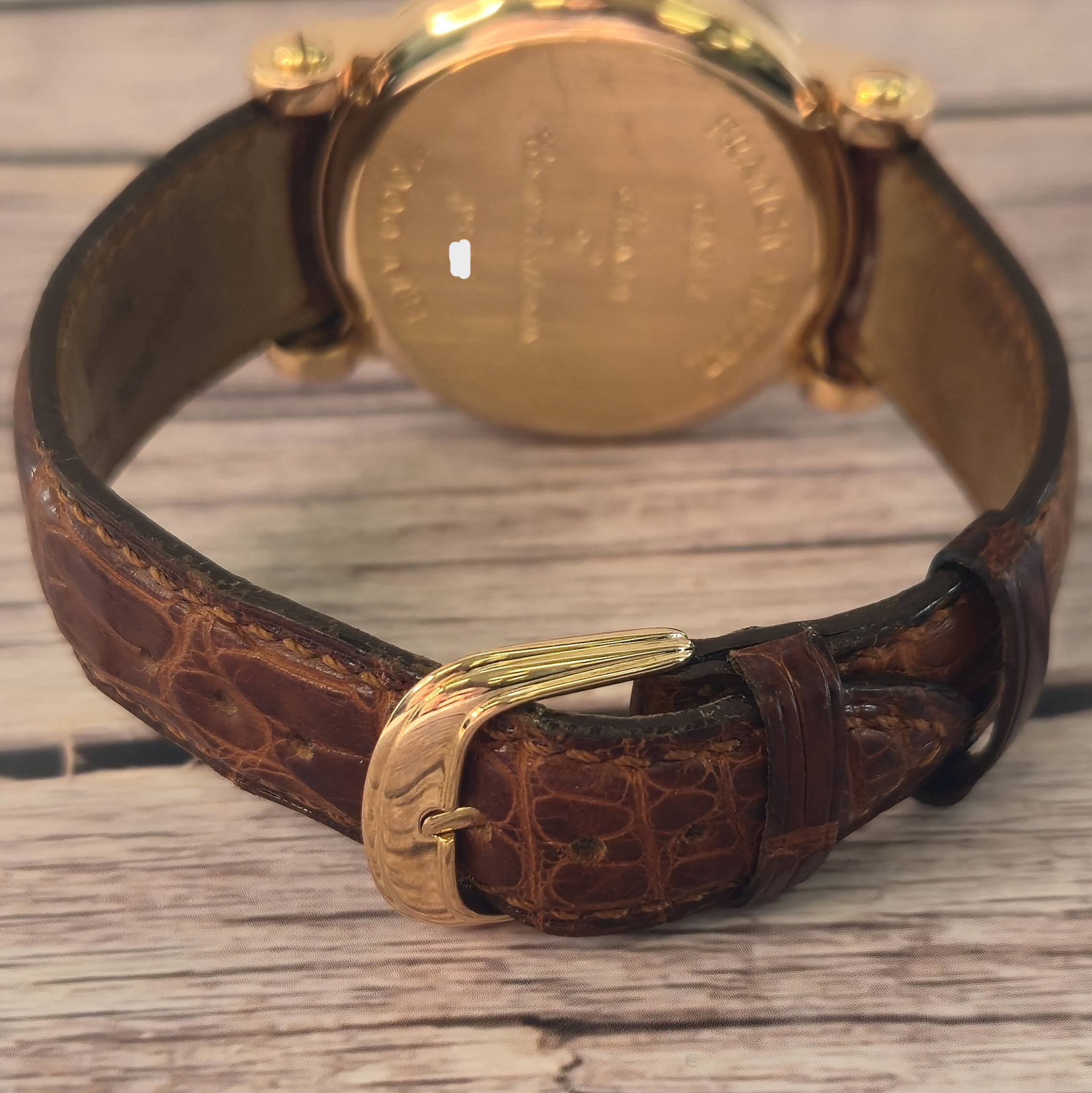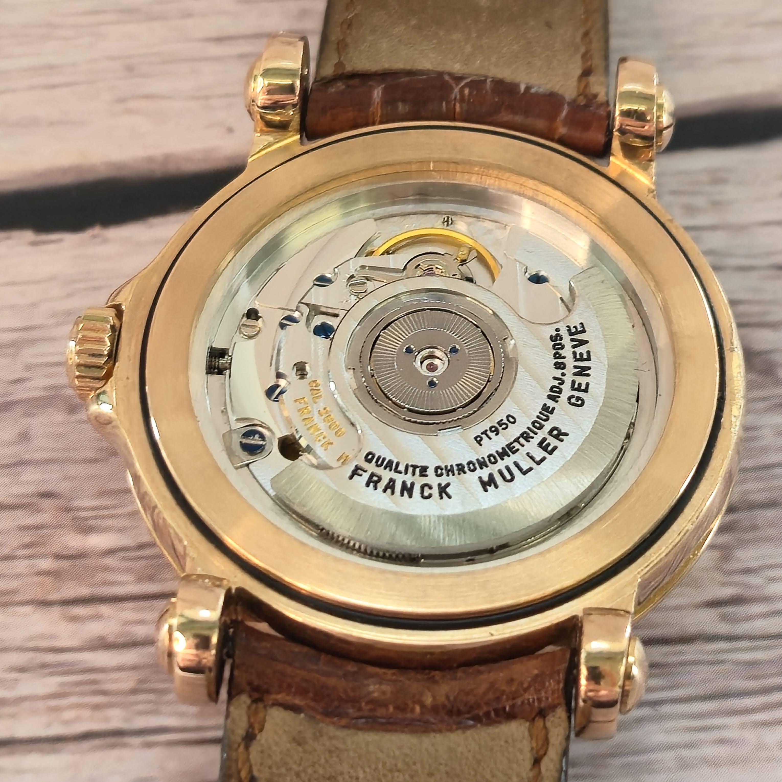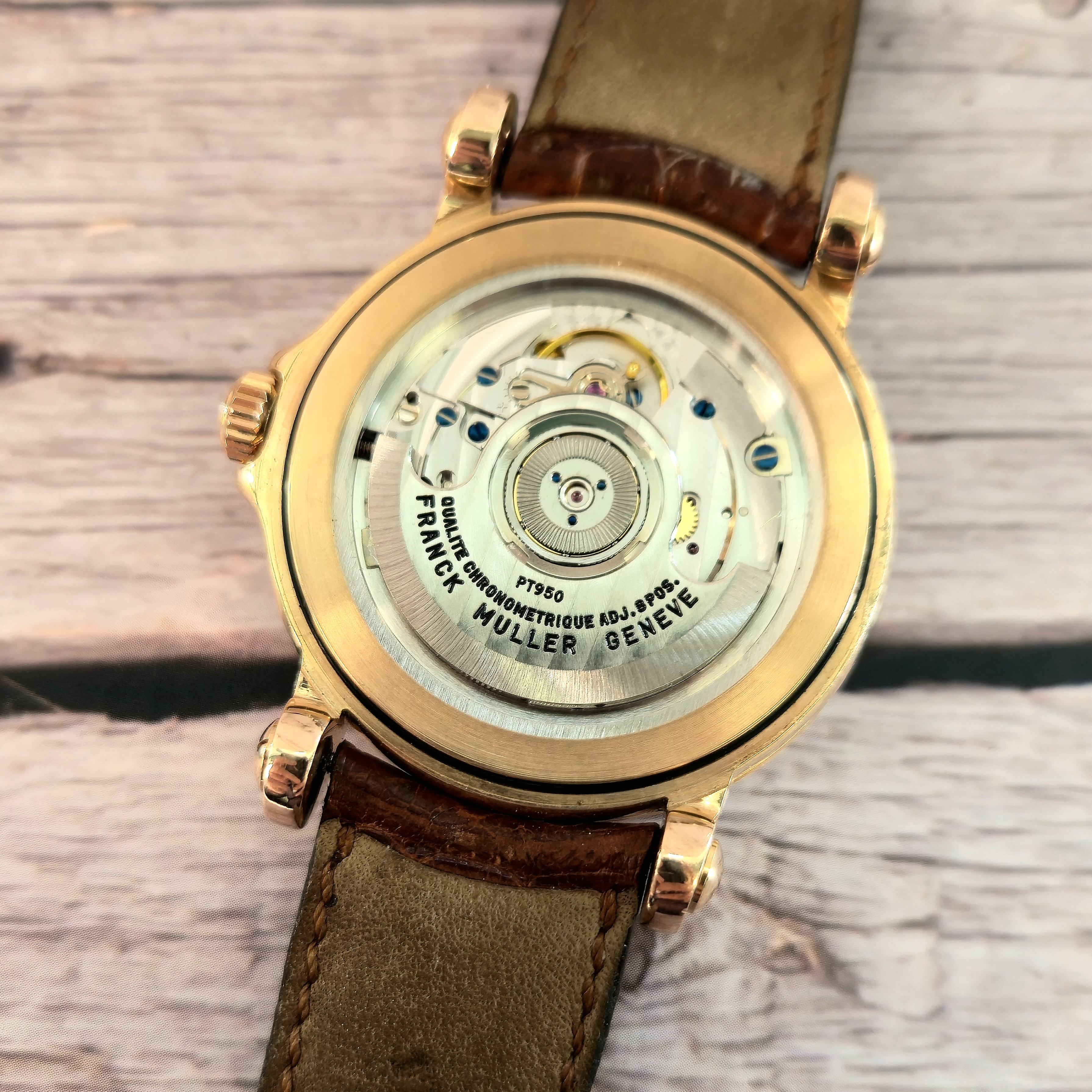 This timepiece showcases Franck Muller’s signature triple time zone complication. Powering the watch is the automatic Franck Muller Caliber 2800, based on the Swiss ETA 2892-A2, extensively modified and enhanced by Franck Muller to support the multi-time-zone function. It features a sweeping second hand and an elegant date indicator. The movement is engraved “Qualité Chronométrique,” signifying high-grade chronometric regulation by Franck Muller.