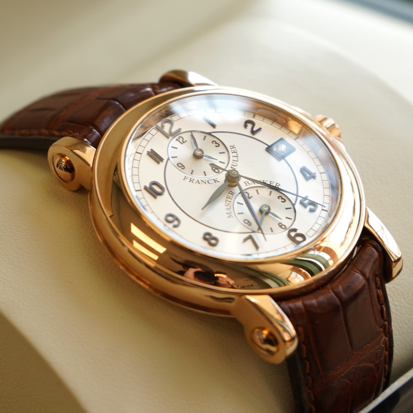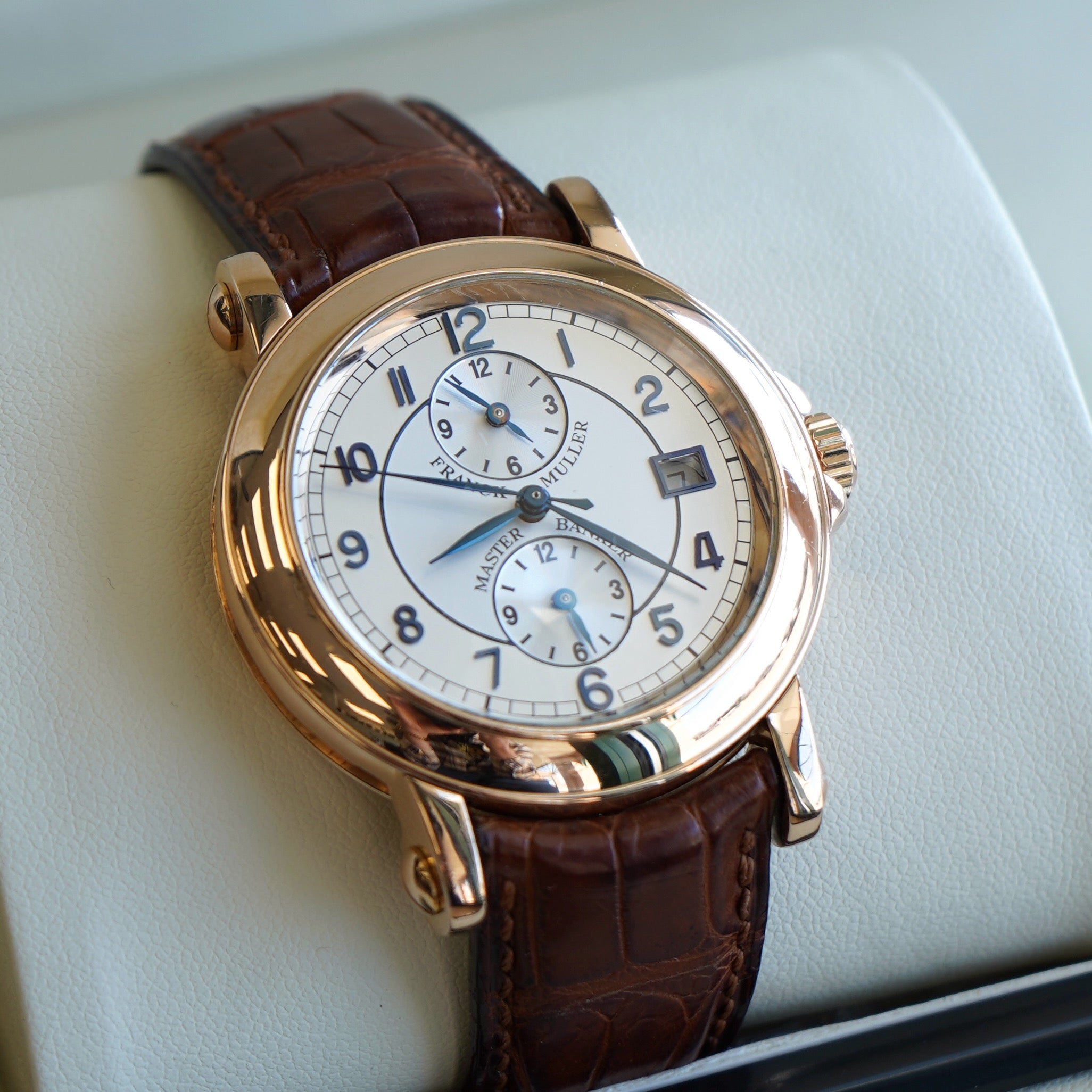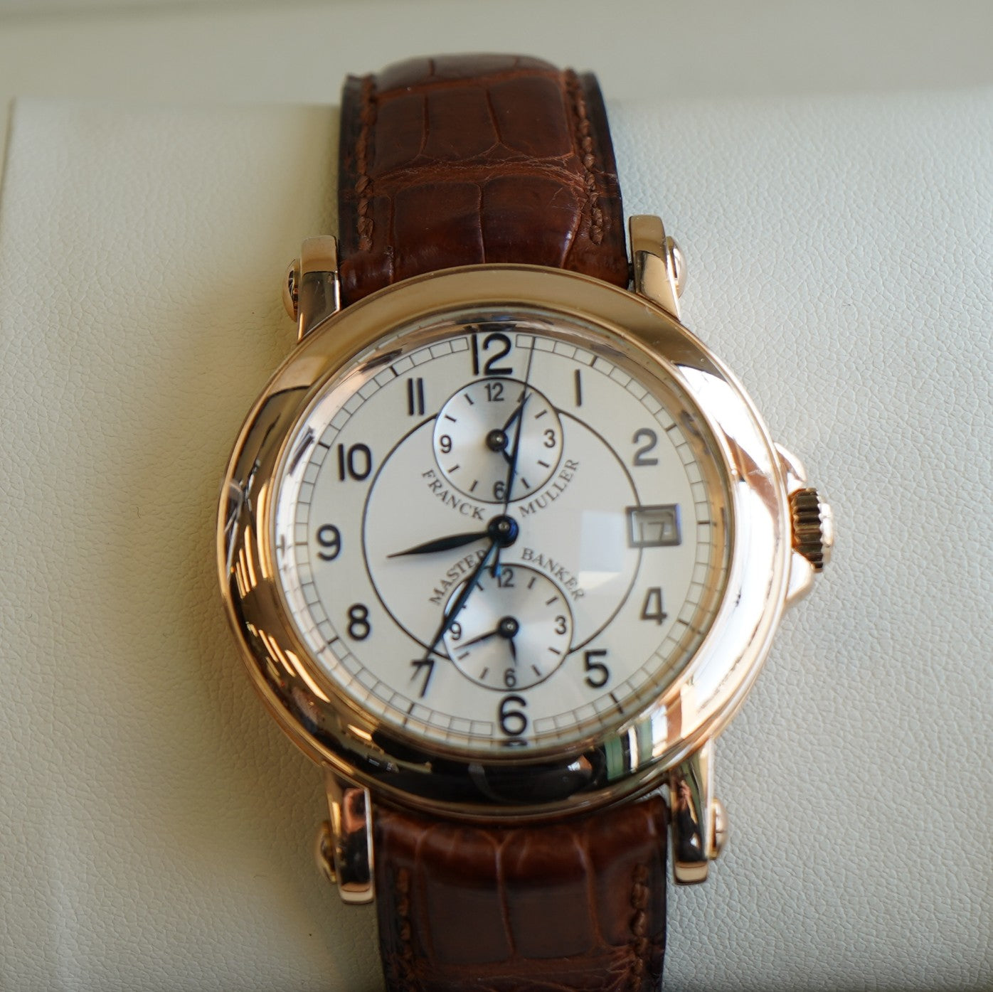 Offered here is an exceptional example of Franck Muller’s renowned horological expertise — the Master Banker reference 7000 MB, part of the prestigious Master of Complications collection, crafted in solid 18K rose gold.