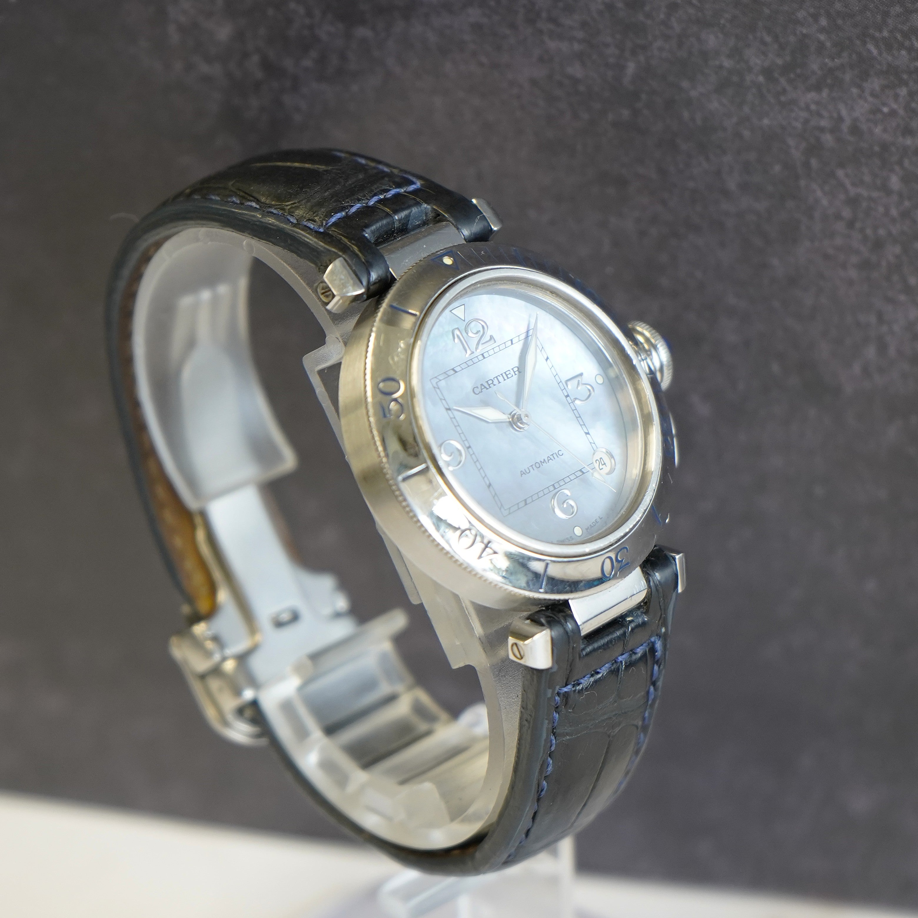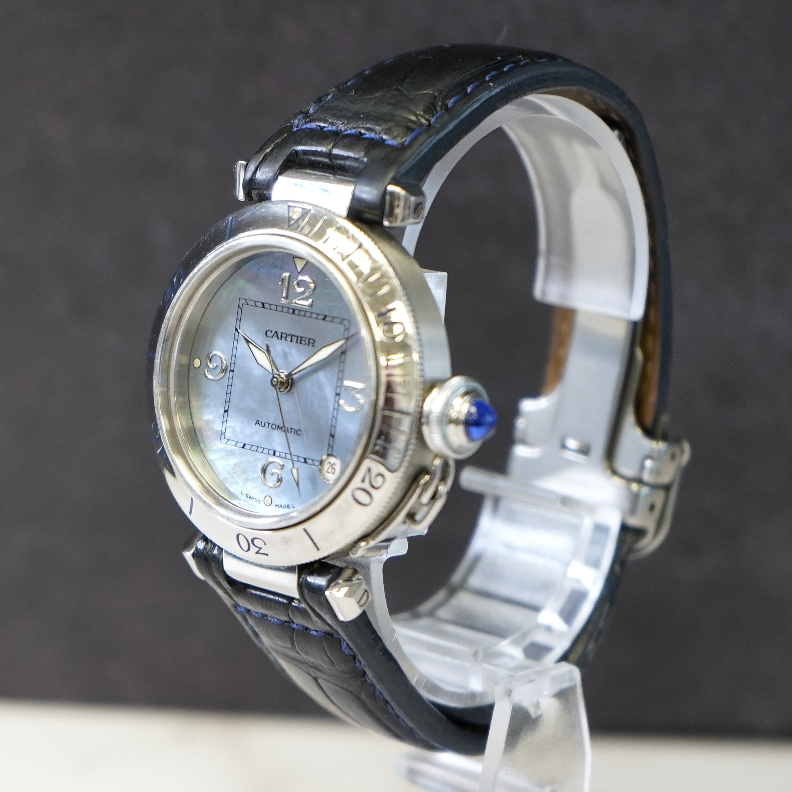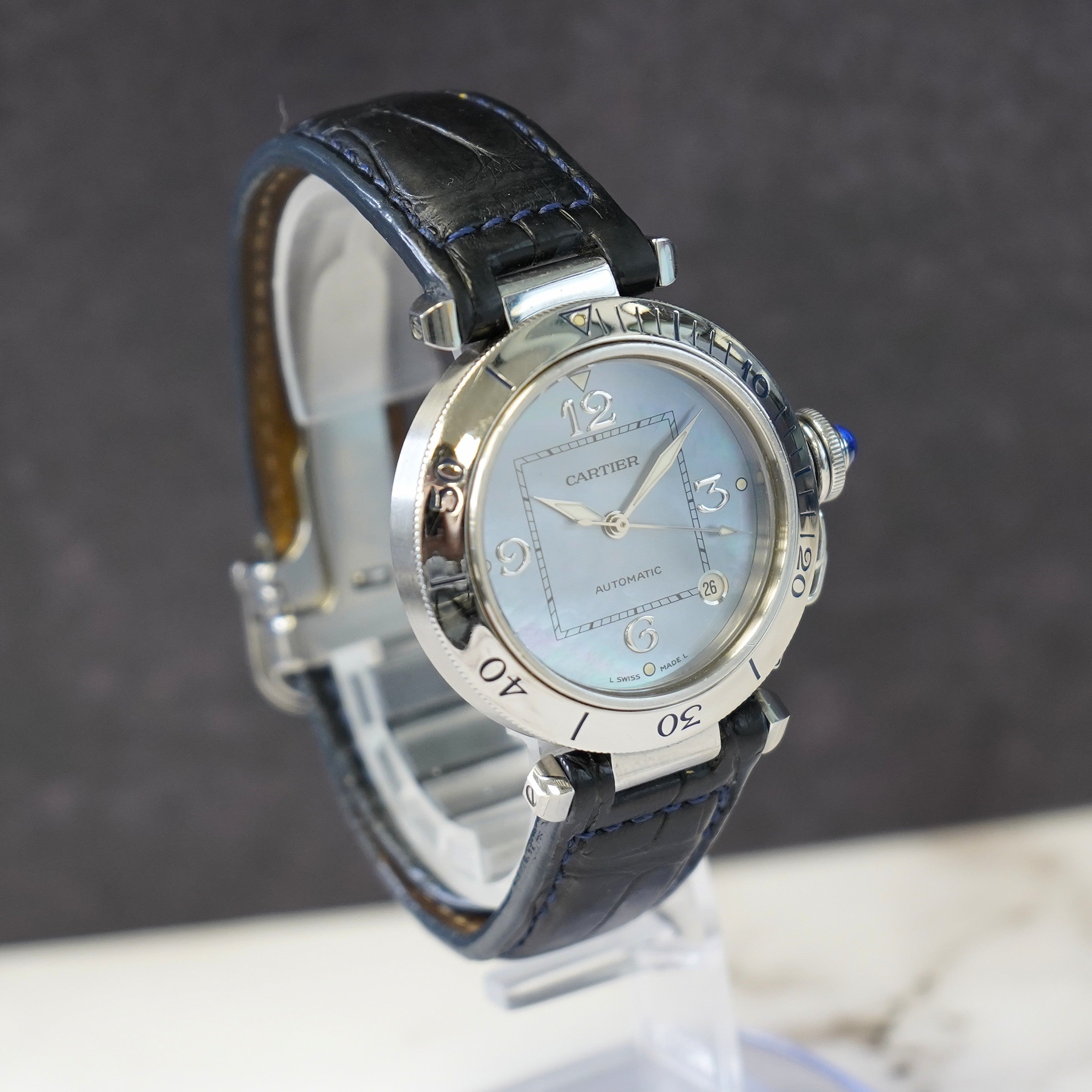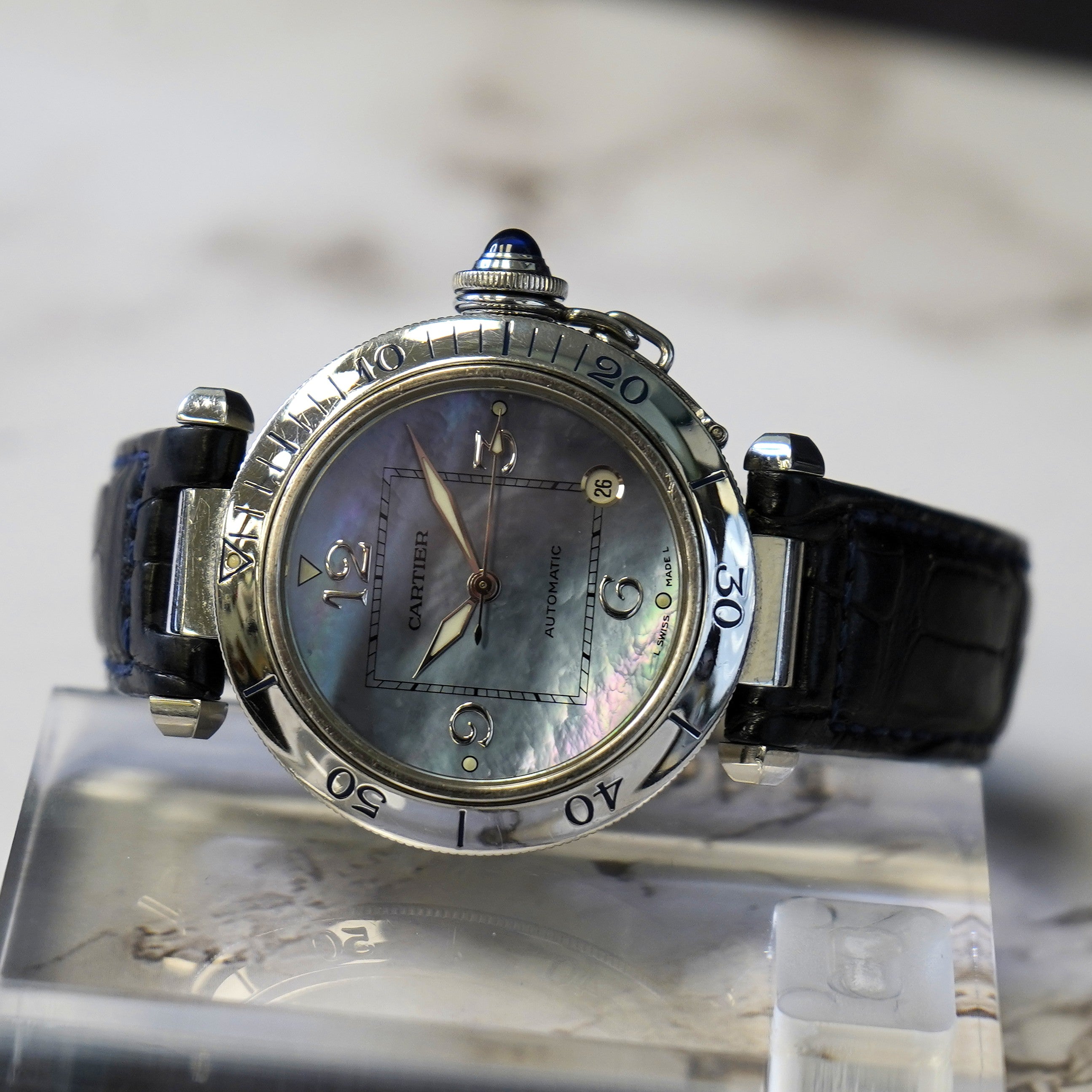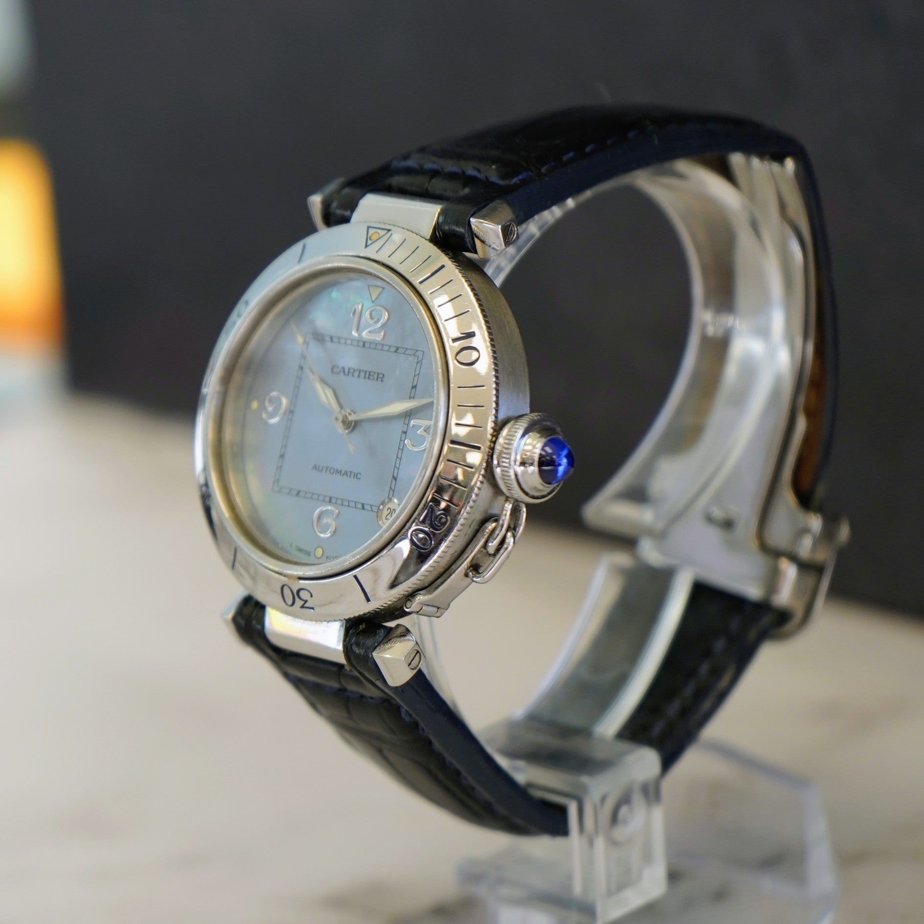We are proud to present this elegant vintage timepiece, a Cartier Pasha automatic wristwatch, reference 1030 1, featuring a rare and refined blue mother-of-pearl dial.