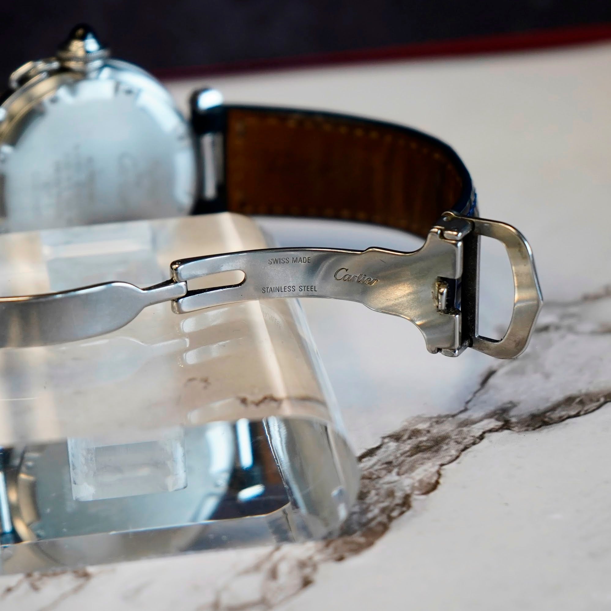 It is housed in a 35mm round stainless steel case with Cartier’s signature lug design, a rotating bezel, and the original blue cabochon screw-down crown. It is fitted with a scratch-resistant sapphire crystal and offers water resistance up to 100 meters (330 feet / 10 ATM).