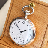 Cased in a beautiful 52.2mm two-tone (silver and rose-gold tone) round case, all in .800 silver. Double hinged back. The inner caseback (dust cover) reads "Grand Prix Paris 1900". This engraving refers to the fact that Zenith received a gold medal for its technological advancements at the 1900 Paris Universal Exhibition (Paris World Fair), and therefore, the dust covers of special pocket watch models, and this pocket watch, were signed Grand Prix Paris 1900 as a commemoration to their achievement.