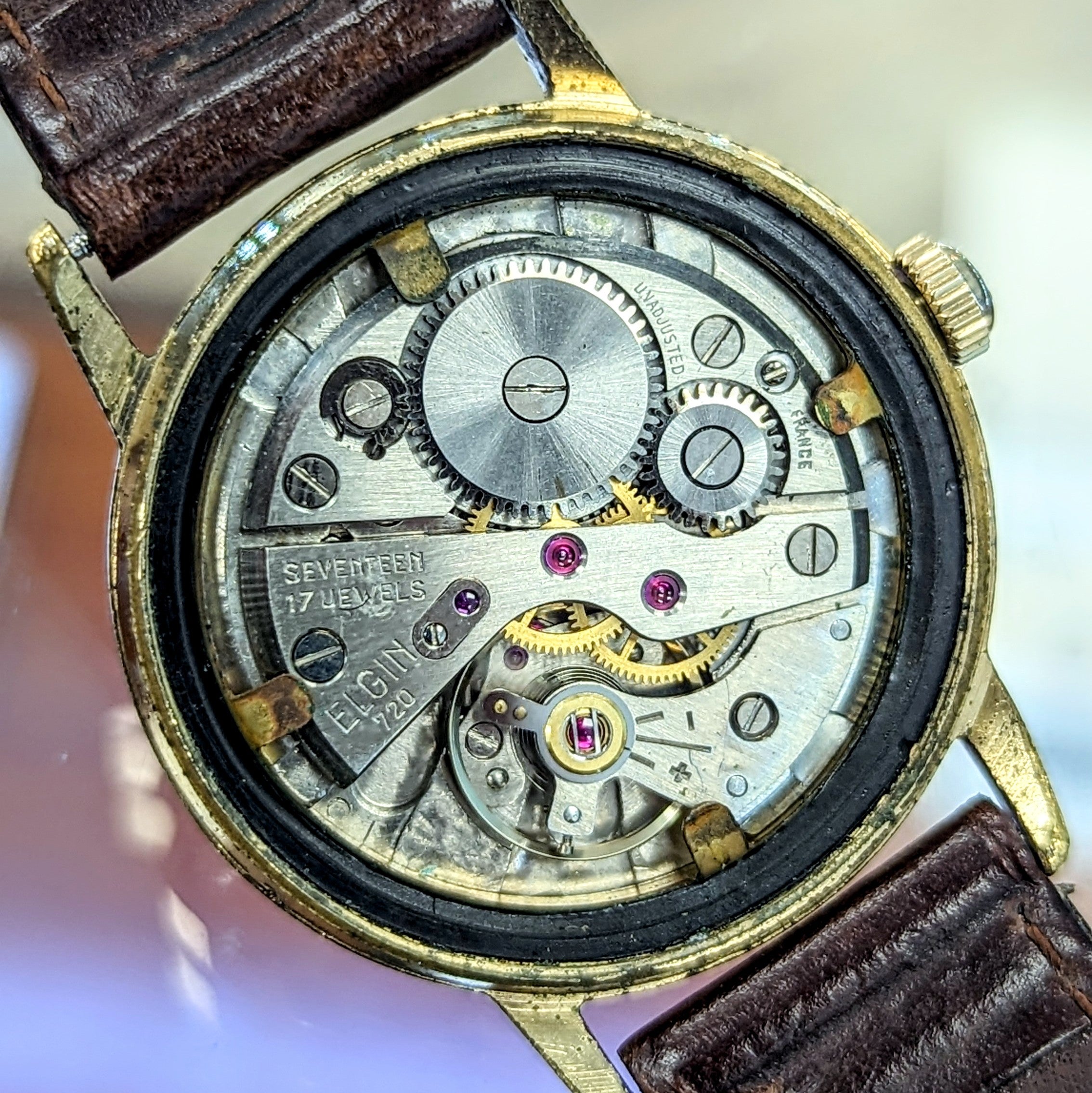 Powered by an original Elgin manual wind movement caliber 720, sweep-second, 17 jewels, unadjusted, made in France.