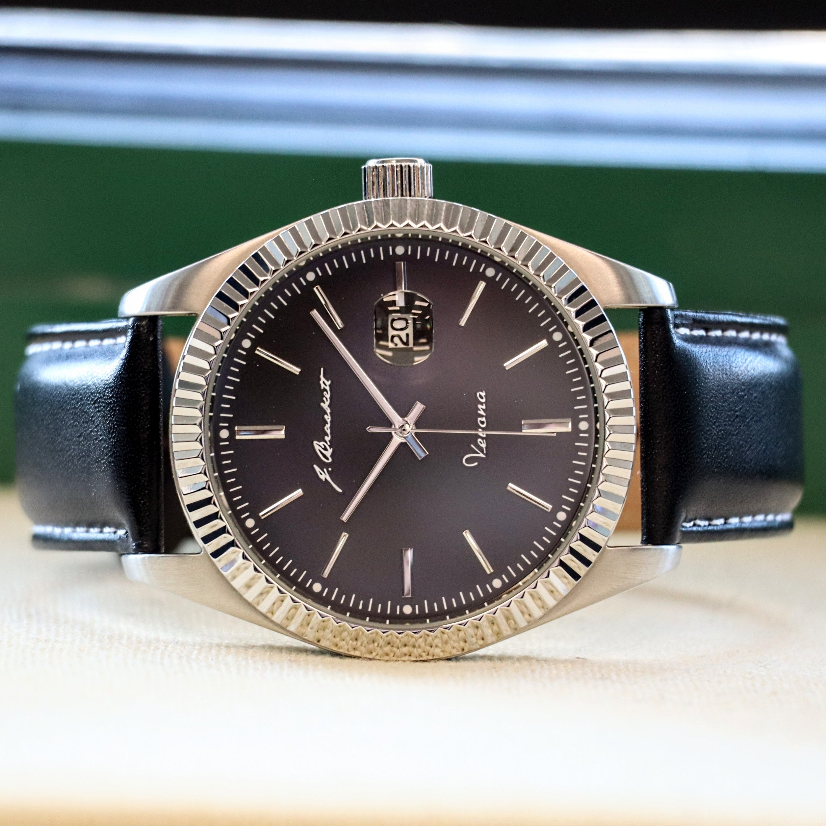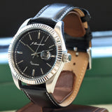 Classic black dial with white stick hour marks, white minute/second track and matching silver-tone hands. The date window is located at 3 o'clock position.