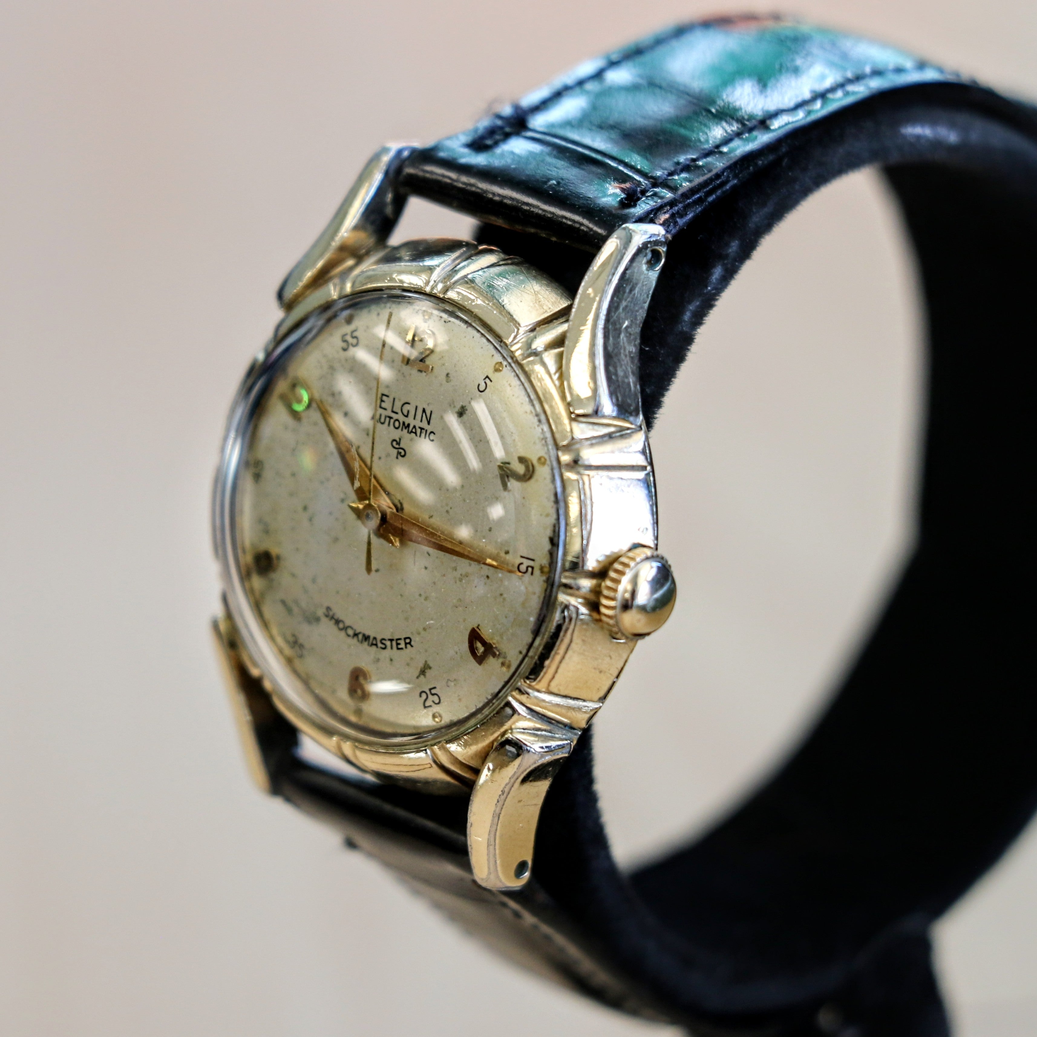 The watch still has the original champagne dial (showing some age and patina) with gold Arabic Numerals, gold hour markers, bold minute/seconds track and gold matching hands. The dial is signed with ELGIN, Automatic, shockmaster and Durapower logo.
